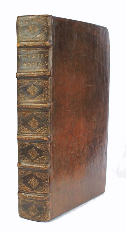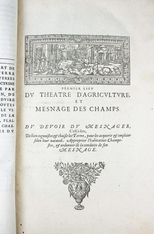 Edition originale rare de «l’extrêmement remarquable Théâtre d’agriculture d’Olivier de Serres». (Pierre Larousse), le premier traité moderne d’agriculture mettant à l’honneur la langue française. Tchemerzine, V, p. 817; Pritzel 8630; Mortimer French Books, 494; Thiebaud 840; Schwerdt II-156/157; Kress 236; En français dans le texte 79. «La prose de Serres, dans le sillage de Montaigne et de Saint François de Sales, est claire et belle. Le titre du Théâtre d’Agriculture, composé de deux groupes de mots usuels unis de façon heureuse et inattendue, dénote une haute maîtrise de la langue. Plus de vingt éditions successives en attestent le succès.» (En Français dans le texte, B.n.F.). Gentilhomme protestant d'Ardèche, Olivier de Serres, dans sa jeunesse, milite dans les rangs des réformés et on le trouve encore, en 1573, au siège de Villeneuve-de-Berg, qui fut suivi d'affreux massacres. Il reprend ensuite, pour un quart de siècle environ, la culture de son domaine du Pradel, pratiquant méthodiquement l'assolement. Son intérêt s'étend à l'irrigation, à l'élevage, aux forêts, à la vigne. Le jardin médicinal ou bouquetier le requiert particulièrement. Il connaît le maïs et la betterave et, près de deux siècles avant Parmentier, la pomme de terre qu'il compare à la truffe et nomme cartoufle. Il s'intéresse à l'utilisation et à la conservation des produits de la terre et découvre d'ingénieuses recettes. Il étudie les ruches et les vers à soie et acquiert une grande maîtrise en matière de sériciculture. En 1599, il publie un petit volume de cent pages, aussitôt traduit en Angleterre et en Allemagne, sur la Cueillette de la soye par la nourriture des vers qui la font. Henri IV lui écrit et lui demande son aide pour l'une des grandes entreprises économiques du règne consistant à planter d'immenses quantités de mûriers. À soixante ans, l'agronome devient le conseiller royal. Il réunit dans son Théâtre d'Agriculture les fruits de son expérience et y prodigue un vaste enseignement inconnu jusqu'alors. Il s'agit là du premier grand traité français d'agronomie. Le livre est orné d'un titre frontispice gravé par Mallery et de figures sur bois dans le texte ; en tête de chacun des huit chapitres, un bandeau, également gravé sur bois, montre des scènes de la vie champêtre. ». (En Français dans le texte. B.n.F.) Son «Théâtre d'agriculture et Ménage des champs», où il consigne avec une simplicité savoureuse les résultats de 40 ans de recherches et de pratique, lui apporta une gloire qui ne s’éclipsera qu’à la fin du XVIIe siècle, devant la vogue, alors, de «La Maison rustique» de Ch. Estienne et Liébault. «Il est divisé en 8 « lieux » chacun illustré d'un bandeau gravé sur bois en rapport avec le titre : (1) connaissance et choix des terres, (2) labourage des terres à blé (pain et légumes), (3) culture de la vigne, (4) bétail à quatre pattes et pâturages, (5) poulailler, colombier, garenne, étang, rucher et ver à soie, (6) potager, verger, herbes condimentaires (dont safran), médicinales et tinctoriales (guède, garance), (7) eaux et bois dont coupes et entretiens, (8) usages des aliments dont recettes de divers pains, boissons (hypocras, malvoisie, hydromel, confitures, conserves de fruits ou viandes, sirops, choucroute, truffes, etc.), façon d'accommoder les maisons et les habits à la campagne, médecine des hommes et des bêtes et « de l'honneste comportement [à tenir] en la solitude de la campagne.» Mais pas un instant Olivier de Serres ne cessa de veiller sur sa propriété du Pradel, tout en employant ses dernières années à propager dans la région la culture de la soie. Il vint à un moment décisif de l'économie française, alors que la vie rurale reprenait son essor, que les pillages et les dévastations, suites de la guerre, permettaient un renouvellement des instruments et des méthodes de culture restés inchangés depuis le moyen âge. L’action d’Olivier de Serres, d’abord isolée, devint un symbole du relèvement économique qu’Henri IV s’efforça de susciter. « Il n'est pas besoin d'être un technicien de l'agronomie ni un historien pour trouver plaisir à lire Olivier de Serres : son livre, comme son action, marque bien le moment où la France retourne au calme, où elle retrouve un bon sens alerte, malicieux, la joie profonde d'être naturelle.» Dans son activité de propriétaire rural, Olivier de Serres ne perdait pas de vue l'intérêt national. Il désirait prêcher d'exemple et convaincre les gentilshommes de s'occuper eux-mêmes de leurs terres ; il lut les anciens traités d'agronomie, les trouva insuffisants et vieillis ; aussi, pendant 30 ans, consacra‑t-il ses loisirs à la composition d'un traité qui put rendre service de son temps. L’ouvrage est dédié à Henri IV, qui comprit aussitôt à quel point ce livre pouvait être un appui pour l’œuvre de pacification des esprits et de redressement économique qu’il entreprenait, aussi le roi ne lui ménagea-t-il pas ses éloges. L'utilité de cet ouvrage, la protection royale, son caractère d'actualité lui valurent un immense et durable succès, dont témoignent les nombreuses éditions qui en furent faites dans la première moitié du XVIIe siècle. Souvent l'expression est ingénieuse et raffinée ; il appelle le jardinier « l'orfèvre de la terre, parce qu'il surpasse d'autant plus le simple laboureur que l'orfèvre le commun forgeron ». Il y a parfois dans ce langage, qui n'a rien d'affecté, quelque chose de Montaigne et quelque chose de Saint François de Sales. Pendant plusieurs mois, Henri IV s’en faisait lire des passages, après chaque dîner, une demi-heure durant, et il y eut avant 1675, une vingtaine d'éditions. On l'a réimprimé en 1804. L’ouvrage est illustré d’un titre frontispice gravé par Mallery, de 16 figures sur bois de parterres dans le texte et de 8 b