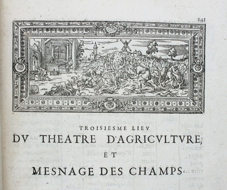 Vers 1700. Lieu premier: Du devoir du Mesnager, C'est à dire, De bien cognoistre et choisir les terres, pour les acquérir et employer selon leur naturel. Approprier l'habitation champestre, et ordonner la conduite de son mesnage. Lieu second: Du laboratoire des terres à grains, pour avoir des Bleds de toutes forces. Lieu troisième: De la culture de la vigne. Lieu quatrième: Du bestail à quatre pieds. Lieu cinquième: De la conduite du poulailler (etc.). Lieu sixième: Des jardinages pour avoir des herbes et fruicts potagers. Lieu septième: De l'eau et du bois. Lieu huictième: De l'usage des alimens et de l'honneste comportement en la solitude de la campagne. Table ou répetoire général des matières plus notables, utiles, et nécessaires, traictées par art, longue expérience et usage, au Théâtre d'Agriculture. Classification Dewey : 630-Agriculture et techniques connexes
