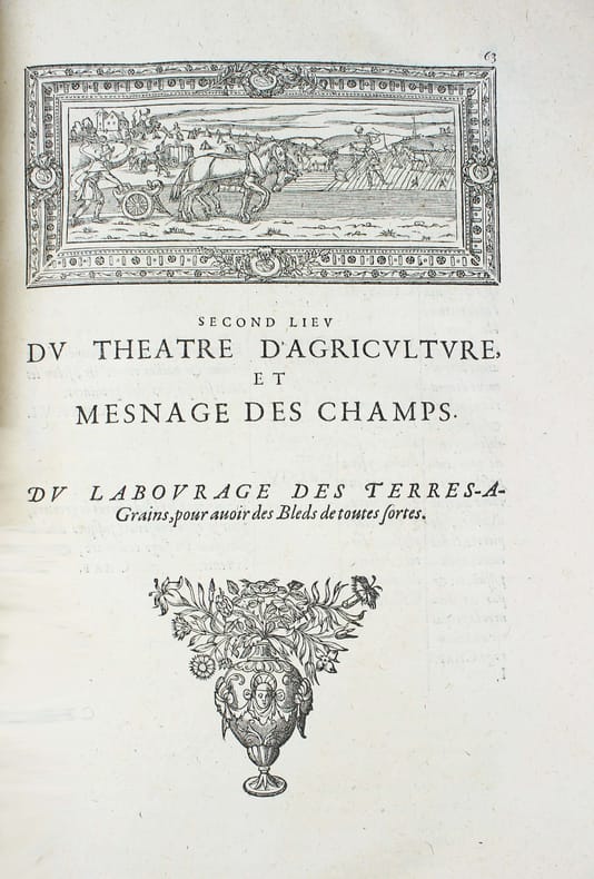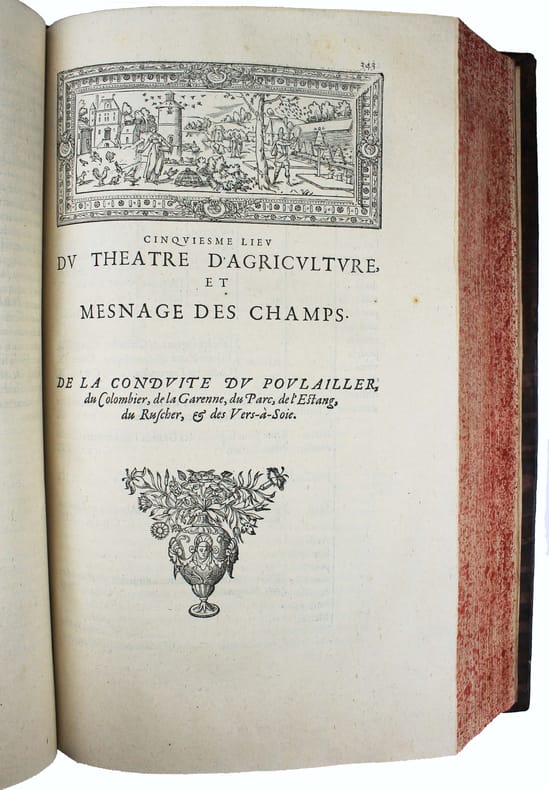 [ head & tail-pieces, historical letters, large vignettes (8), 16 large woodcuts (garden flower-beds)] .....O. de Serres (1539 - 1619) fut un des premiers à pratiquer une agriculture raisonnée dans son domaine agricole du Pradel de près de 200 hectares, par utilisation de l'assolement. Il découvre que la culture de la luzerne enrichit la terre et permet l'année suivante de meilleures récoltes sur le terrain où elle a poussé. Il recommande aux paysans français d'observer un certain nombre de principes par la pratique de plusieurs cultures. Il importe différentes plantes: la garance des Flandres (teinture rouge), le houblon d'Angleterre (pour la bière). Il acclimate le maïs et le murier, (pour la culture du ver à soie). Son ouvrage est divisé en huit "lieux" : choix des terres, labourage, vigne, bétail, poulailler et colombier, rucher, vers à soie, jardin potager, eau et bois, usage des aliments. ........Le Théâtre dAgriculture et mesnage des champs est unanimement considéré comme un témoignage dune qualité exceptionnelle sur la façon dont on concevait léconomie rurale et sur létat de celle-ci dans la France méditerranéenne et les régions voisines à la fin du seizième siècle........Biblio : Thiebaud col. 840 est le plus complet ; figure également au Vicaire 788, Prizel 9590 et Bitting 430......Rareté.....EDITION ORIGINALE..................très belle reliure en très bel état - intérieur en bon état malgré les défauts signalés (very beautiful binding in fine condition - interior in very good condition in spite of the defects indicated).