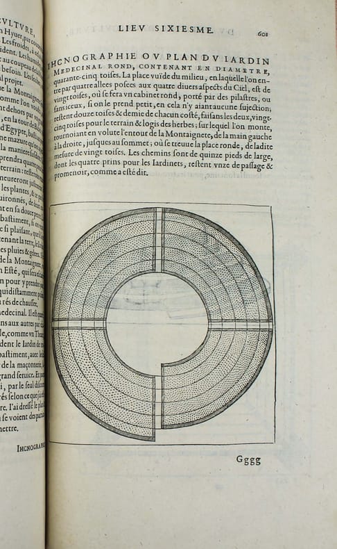 1600 1 volume, reliure demi-velin havane in-folio (binding half calfskin in-folio) (33,5 x 22 cm), reliure pastiche tardive (19ème), dos 5 nerfs (spine with raised band) décoré or (gilt decoration), pièce de titre à filets sur fond noir (label of title with gilt line) , papier peigné marron clair aux plats (cover with painting paper), coins écornés, toutes tranches lisses tranches jaspées (marbled edges), étiquette blanche ex-libris imprimée en noir : Léon Galibert...(l'écrivain de l'Histoire de Venise et de l'Histoire d'Algérie), orné d'une page de titre entièrement gravée sur bois (engraving wood) en noir par Mallery (avec restauration ancienne en marge) + bandeaux, culs de lampes et lettrines historiées gravées sur bois en noir (engraving wood) + 8 larges vignettes en tête de chaque "lieux" gravées sur bois (engraving wood) en noir + 16 grandes illustrations hors-texte (parterres) dont une double page gravées sur bois (engraving wood) en noir, légère trace d'humidité en marge des 30 premières et 20 dernières pages (sans atteinte au texte), manque les 10 dernières pages de la table (la table s'arrete à la lettre G incluse) + le feuillet de colophon, je joint le texte des pages de table manquante en fac-similé : Gallica - BNF, XIV + 1004 pages + 18 p de table , MDC (1600) à Paris Chez Iamet Metayer imprimeur Editeur,