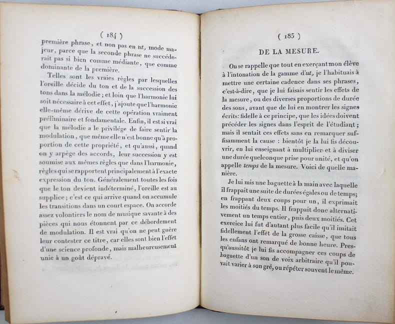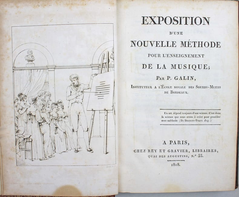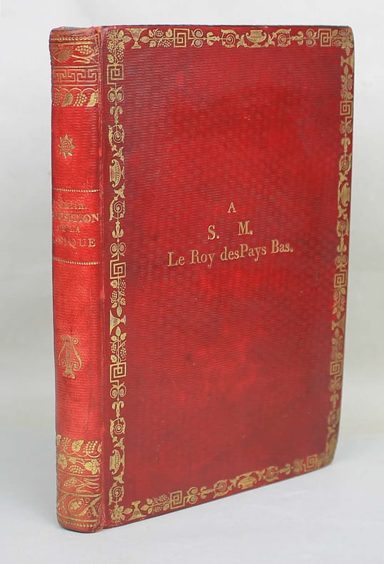 Première édition. Pierre Galin (Bordeaux, 1786 - 1822) essaya d'apprendre la musique sans maître. Il estima que les traités élémentaires de musique de son temps étaient inutiles et dès lors créa sa propre méthode. "Ecrit dans un style simple et sans aucune espèce de prétention littéraire, c'est un modèle de logique, de netteté et de précision qui rappelle le Discours de la méthode de Descartes : ceux qui voudront le lire avec attention ne trouveront pas la comparaison exagérée. Le seul reproche qu'on pourrait lui adresser, c'est de manquer de divisions et de subdivisions, ce qui en rend la lecture un peu difficile : à cela près, c'est un chef-d'oeuvre d'exposition scientifique." (Buisson, Nouveau dictionnaire de pédagogie). Ex dono doré sur le premier plat : "A S.M. Le Roy des Pays Bas." Une tache rousse au bas du frontispice. Bel exemplaire. /// In-8 de frontispice, (6), 284 pp. Maroquin rouge, dos orné, encadrement doré sur les plats, tranches dorées. (Reliure de l'époque.) //// First edition. Pierre Galin (Bordeaux, 1786 - 1822) tried to learn music without a teacher. He felt that the elementary music treatises of his time were useless, and so created his own method. "Written in a simple style and without any kind of literary pretension, it is a model of logic, neatness and precision, reminiscent of Descartes' Discourse on Method." Ex dono gilt on first board: "A S.M. Le Roy des Pays Bas." A foxing stain at the bottom of the frontispiece. A fine copy.