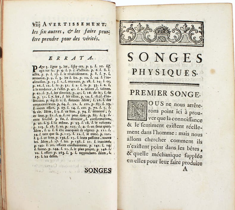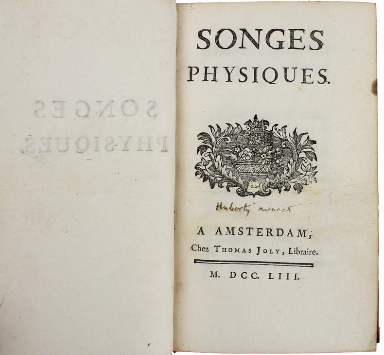 Première édition. Ouvrage qui a inspiré La Mettrie - tous deux étaient de Saint-Malo - pour son ouvrage "L'homme-machine". Frère de Maupertuis, Moreau de Saint-Elier radicalise la théorie de Descartes de l'animal-machine. "Nous nous arrêterons point ici à prouver que la connaissance & le sentiment existent réellement dans l'homme : mais nous allons chercher comment ils n'existent point dans les bêtes & quelle méchanique supplée en elles pour leur faire produire tant d'actes si merveilleux & qui imitent, à tant d'égards, l'action du principe immatériel." Ex libris manuscrit sur le titre : "Hubertis (ou Hubertin ?) avocat." Bel exemplaire. /// In-12 de VIII, 238 pp. Veau marbré, dos à nerfs orné tranches rouges. (Reliure de l'époque.) //// First edition. A work that inspired La Mettrie - both from Saint-Malo - for his "L'homme-machine". Brother of Maupertuis, Moreau de Saint-Elier radicalized Descartes' theory of the animal-machine. Handwritten ex libris on title: "Hubertis (or Hubertin?) avocat." A fine copy.