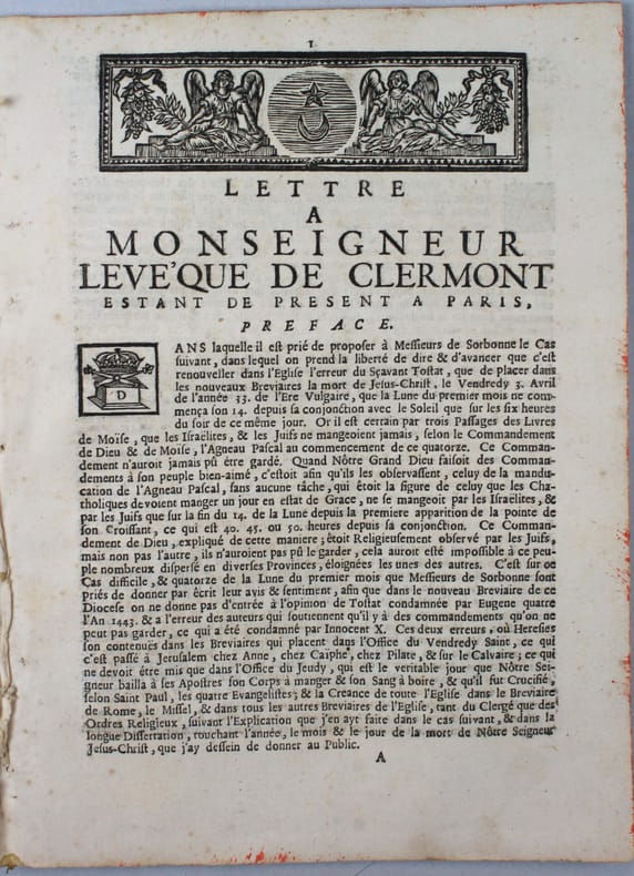 Jean Dufraisse, chanoine de la cathédrale de Clermont-Ferrand, conteste la chronologie admise et affirme par un examen du calendrier lunaire que Jésus-Christ est mort en l'an 34. Pièce éphémère, d'une rareté évidente. Un seul exemplaire dans le Ccfr (Bibliothèque Mazarine). /// In-4 de 23, (1) pp. Détaché d'un recueil. ////