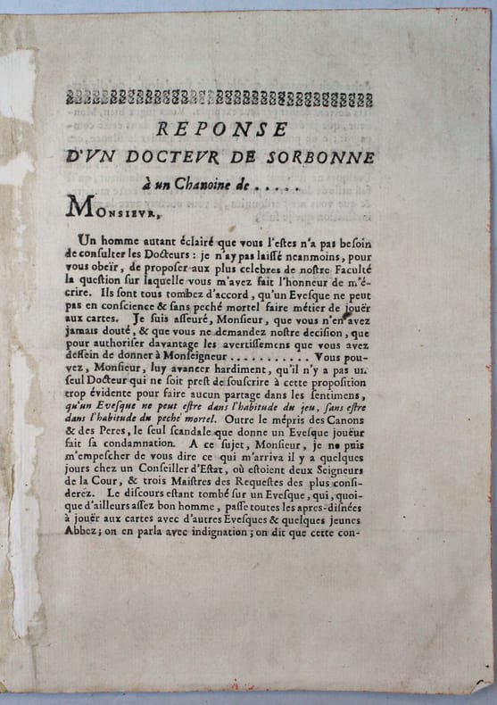 "Un évêque ne peut pas en conscience & sans péché mortel faire métier de jouer aux cartes". Lettre imprimée signée "O. N." Aucun exemplaire trouvé dans les bibliothèques publiques. /// In-4 de (2) pp., 1 f. bl Détaché d'un recueil. ////