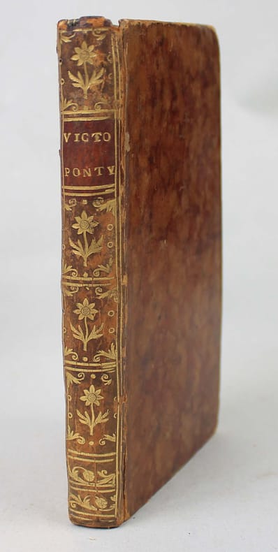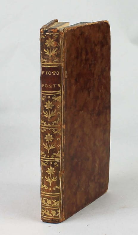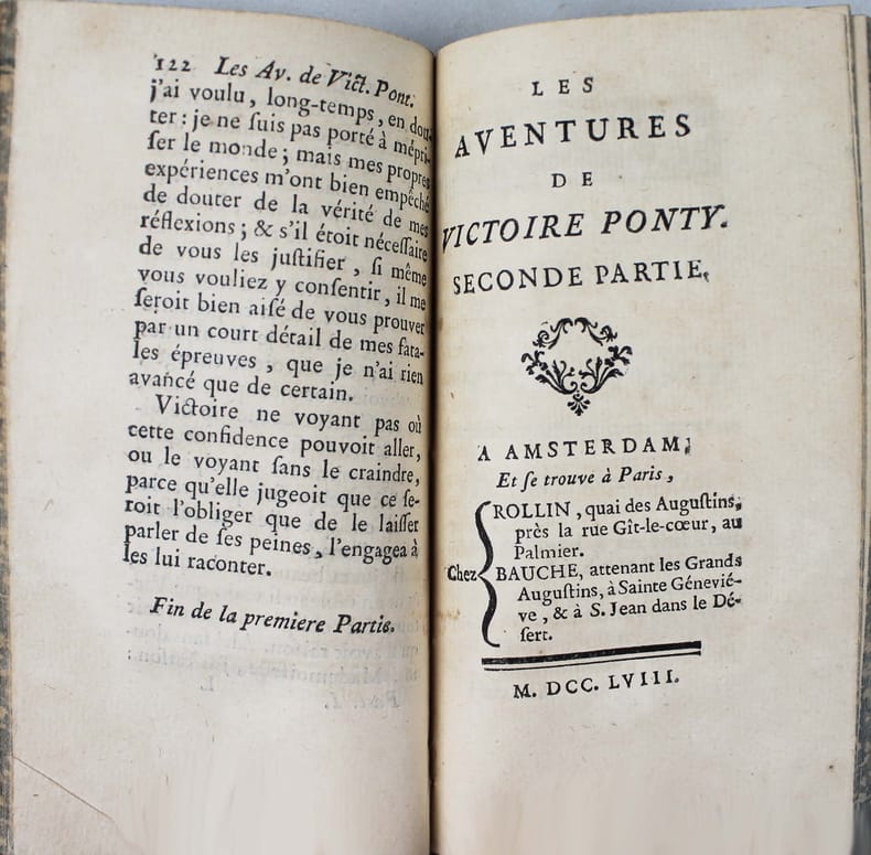 Première édition de ce roman de moeurs à l'époque des Lumières. Jean François de Bastide (Marseille, 1724 -1798) écrivain et journaliste, a fait parti de ceux que Robert Darnton a appelé la bohême littéraire. Criblé de dettes, sans cesse en quête d'un protecteur, il a rêvé de faire carrière dans l'aura des "philosophes" et se flatte particulièrement de l'amitié de d'Alembert. Il est cité par Rousseau dans le début des "Confessions" et il a fait au moins un séjour à la Bastille. Il épousa en secondes noces une "fille fort répandue dans la galanterie". Victoire Ponty est une jeune fille pauvre et orpheline. Elle devient dame de compagnie d'une marquise à Paris. Elle assiste sa maîtresse dans sa vie amoureuse, puis est sur le point de se marier elle-même par "pitié" à un baron, etc... Cet ouvrage est curieusement rare aujourd'hui. Le Ccfr ne recense que l'exemplaire de la BNF. Il a connu une seconde édition l'année suivante sous le titre de "Le triomphe de l'amitié, ou Les aventures de mademoiselle Victoire Ponty". Coins et coiffe usés, début de fente à la charnière supérieure, sinon bon exemplaire. /// In-12 de (2), 122 pp. / (2), 96, (2) pp. Veau brun, dos orné, tranches marbrées. (Reliure de l'époque.) //// First edition of this Enlightenment novel of manners. Jean François de Bastide (Marseille, 1724 -1798), writer and journalist, was one of what Robert Darnton has called the literary underground of the Old Regime. Riddled with debt and constantly in search of a protector, he dreamed of making a career in the aura of the "philosophes", and particularly prided himself on his friendship with d'Alembert. He is quoted by Rousseau at the beginning of his "Confessions", and spent at least one time in the Bastille prison. In his second marriage, he married a "girl widely known for her gallantry". Victoire Ponty was a poor, orphaned girl. She became lady-in-waiting to a marquise in Paris. She assists her mistress in her love life, then is on the point of marrying herself in "pity" to a baron, and so on... This work is oddly rare today. The Ccfr only lists the BNF copy. A second edition was published the following year under the title "Le triomphe de l'amitié, ou Les aventures de mademoiselle Victoire Ponty". Corners and head of cap worn, beginning of crack at upper hinge, otherwise a good copy. Worldcat in US: University of Illinois at Urbana Champaign and Vanderbilt University Library.