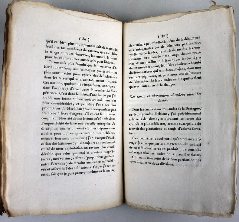 Première édition. "C'est dans le canton de Belle Ile-en-Mer, qui fait partie du département du Morbihan, que je m'occupe de défrichements." Des défrichements pour mettre en culture ou planter des arbres, surtout des pins maritimes, dans des landes alors incultes. Jean-Louis Trochu était propriétaire de Bruté, domaine qui a servi de modèle dans le Morbihan. Illustré d'une planche dépliante in fine. Tiré à part des des Annales de l'agriculture française. Non rogné. Bon exemplaire tel que paru. /// In-8 de 50 pp., 1 planche. Broché, couvertures muettes bleues de l'époque. ////