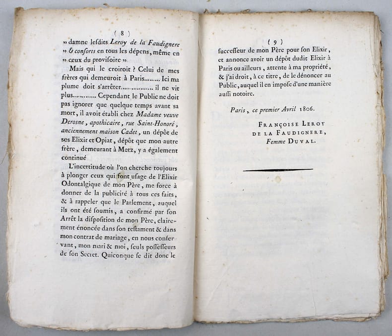Brochure publicitaire pour l'élixir odontalgique de François Leroy de La Faudignère "dont il n'a transmis la recette qu'à sa fille, épouse de Duval, dentiste & Maître en chirurgie de Paris." Au début de cette brochure, Françoise Duval se plaint des contrefacteurs qui ne sont autres que ses frères qui lui ont contesté la propriété exclusive de l'élixir. Elaboré après 1760, cet élixir a donc connu un très long succès. Bon exemplaire tel que paru. /// In-8 de 48 pp. Cousu sur brochure. ////