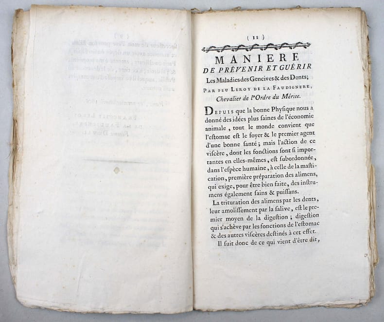 Rare exemplaire, incomplet de la page de titre, de cette édition ancienne (vers 1775-1780). François Leroy de La Faudignère est l'inventeur d'un célèbre remède odontalgique.