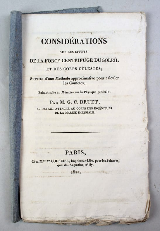 Seule édition de ce travail d'un haut niveau scientifique. Cette brochure fait suite à un "Mémoire sur la physique générale" qui a été présenté à l'Académie des Sciences, en 1811, par l'astronome Bouvard. L'auteur était Ingénieur de la marine. Exemplaire tel que paru. /// In-8 de 32 pp. Broché, couverture bleue de l'époque. //// No copy outside France. Only edition of this highly scientific work. This brochure follows on from a "Mémoire sur la physique générale" The only edition of this highly scientific work. This brochure follows on from a Mémoire sur la physique générale submitted to the Académie des Sciences in 1811 by the astronomer Bouvard. The author was a naval engineer. Copy as issued. to the Académie des Sciences in 1811 by the astronomer Bouvard. The author was a naval engineer. Copy as issued. Worldcat : BNF, Ecole des Ponts ParisTech.