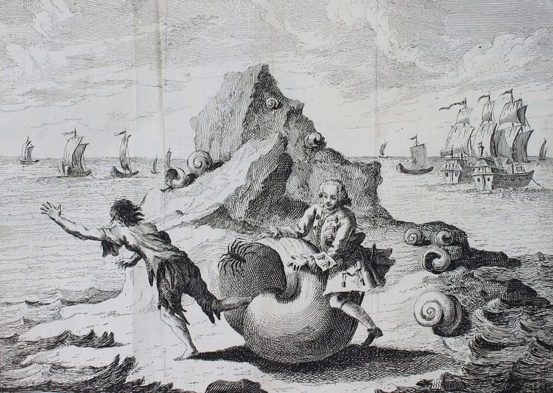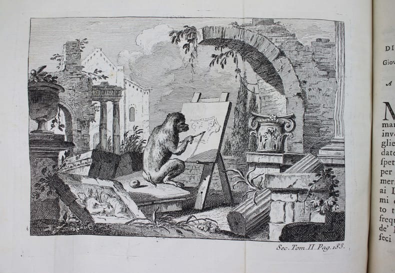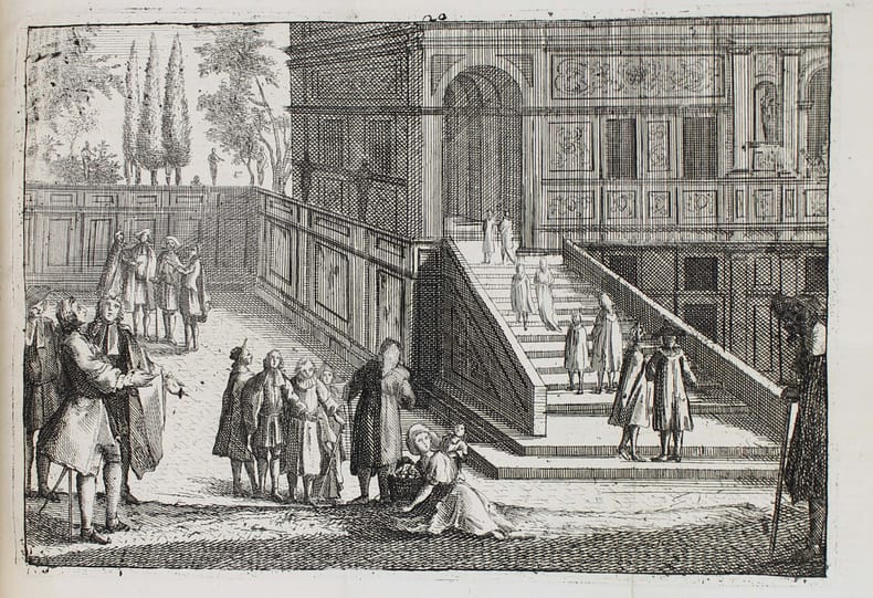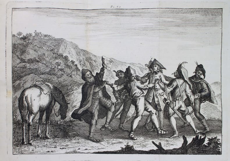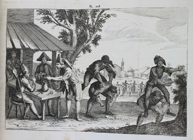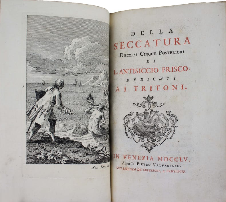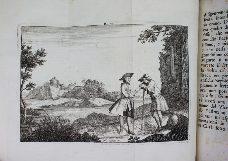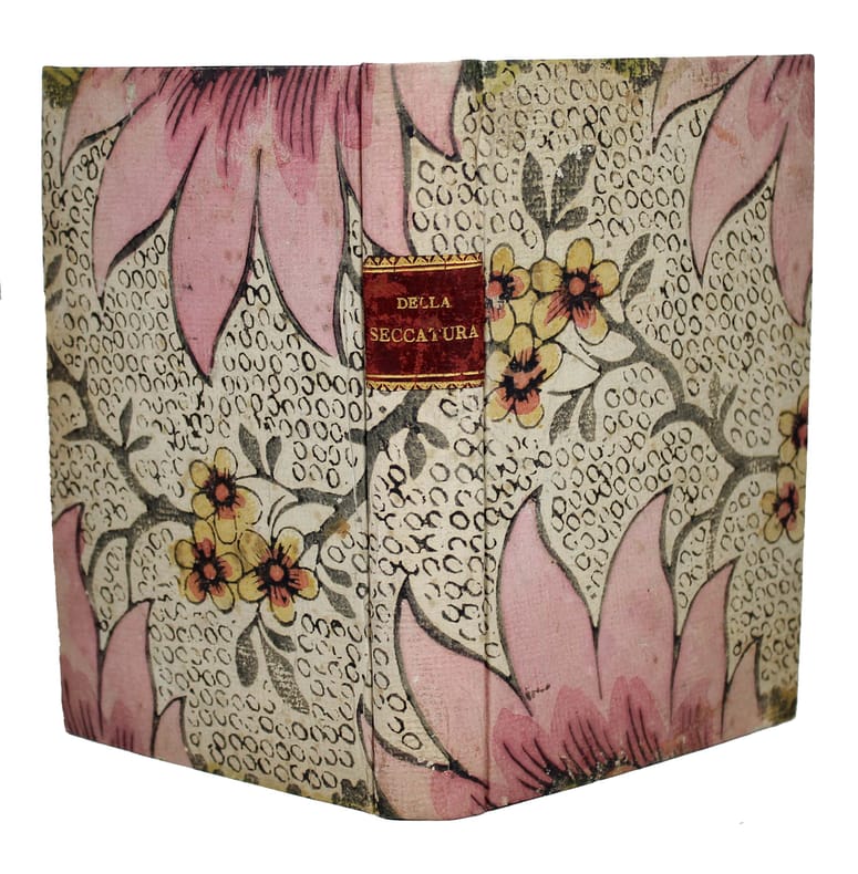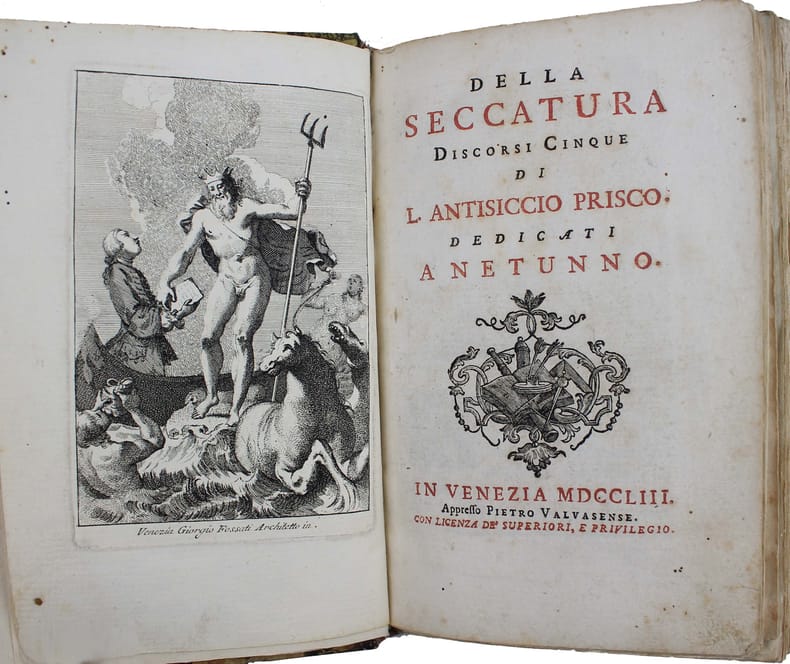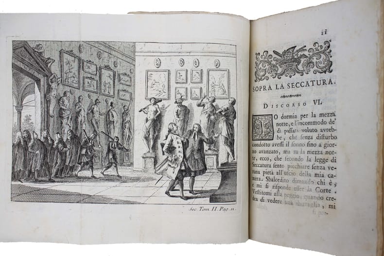 Première édition. Il est rare de trouver les deux volumes publiés ensemble. Aucun exemplaire dans Worldcat ne semble posséder les deux volumes. Illustré de 2 frontispices et de 11 planches dépliantes. Il s'agit du récit désopilant de dix fâcheuses mésaventures, truffé de scènes savoureuses et d'histoires surréalistes. Chacun des dix discours est illustré par une planche, dont certaines se situent certainement à Venise. Le premier livre est dédié à Neptune et le second à Triton. Le premier frontispice représentant Neptune est signé par le graveur Giorgio Fossati, probablement l'auteur des autres planches. À la fin de la deuxième partie, on trouve une curieuse lettre de Q. Veturio Capitolino (un autre pseudonyme de Passeri) dédiée à "Monsù Cartoccio inventeur et sculpteur de l'architecture au-delà des montagnes" sur les capricci d'architettura. Giovanni Battista Passeri (1694-1780), abbé de Pesaro, était un antiquaire, un philologue et un archéologue. Outre la publication de "Della Seccatura Discorsi", Passeri a la particularité d'avoir publié le plus grand catalogue de fausses lampes romaines en terre cuite jamais produit. /// In-8 de frontipiece, VIII, 136 p., 5 folding plates / frontipiece, 216 pp., 6 folding plates. Cartonnage de papier peint ancien. //// First edition. It is rare to find together the two volumes published. No copy in Worldcat seems to have the two volumes. Illustrated by 2 frontispieces and 11 folding plates. This is an hilarious account of ten annoying misadventures, full of tasty scenes and surreal stories. Each of the ten discourses is illustrated by a plate, some most probably located in Venice. The first book is dedicated to dedicated to Neptune and the second to Triton. The first frontispiece depicting Neptune is signed by the engraver Giorgio Fossati, probably the author of the other plates. At the end of the second part, there is a curious letter from Q. Veturio Capitolino (another pseudonym for Passeri) dedicated to "Monsù Cartoccio inventor and carver of architecture beyond the mountains" on capricci d'architettura. Giovanni Battista Passeri (1694-1780), the Abbate of Pesaro, was an antiquarian, a philologist, and an archeologist. Besides publishing 'Della Seccatura Discorsi', Passeri has the distinction of having published the greatest catalogue of fake Roman terracotta lamps ever produced.