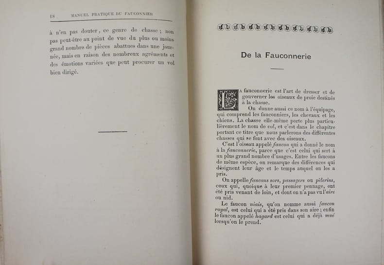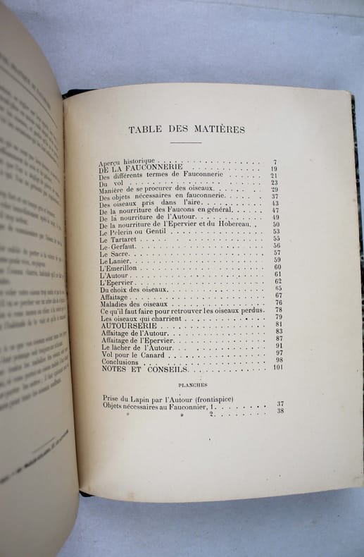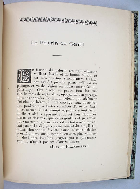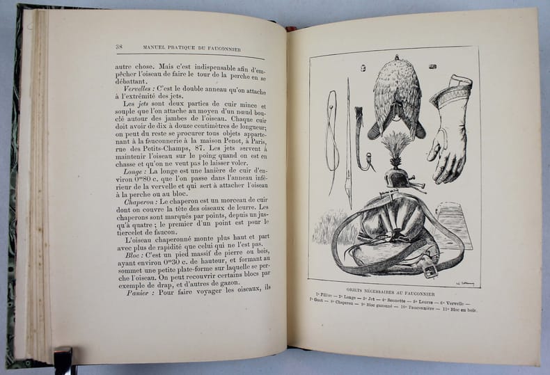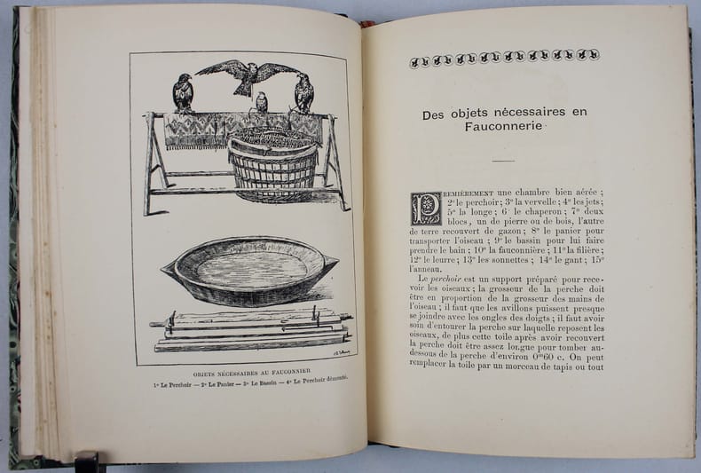 Edition originale de ce livre rare. Au verso du faux-titre: "Volume tiré à petit nombre. Deux exemplaires sur japon non mis dans le commerce". Illustré par 3 planches hors-texte dont un frontispice, dessinées par Bettannier. Une planche représentant la prise d'un lapin par l'autour, les deux autres montrant les objets nécessaires au fauconnier. Bon exemplaire. Thiébaud 426. /// In-12 carré de Frontispice, 112, (2) pp., 2 planches hors-texte. Demi-maroquin vert. (Relié vers 1900.) ////