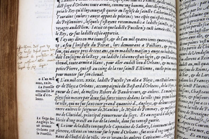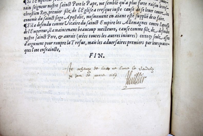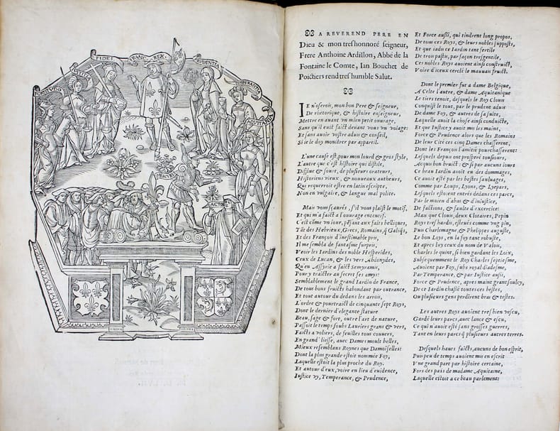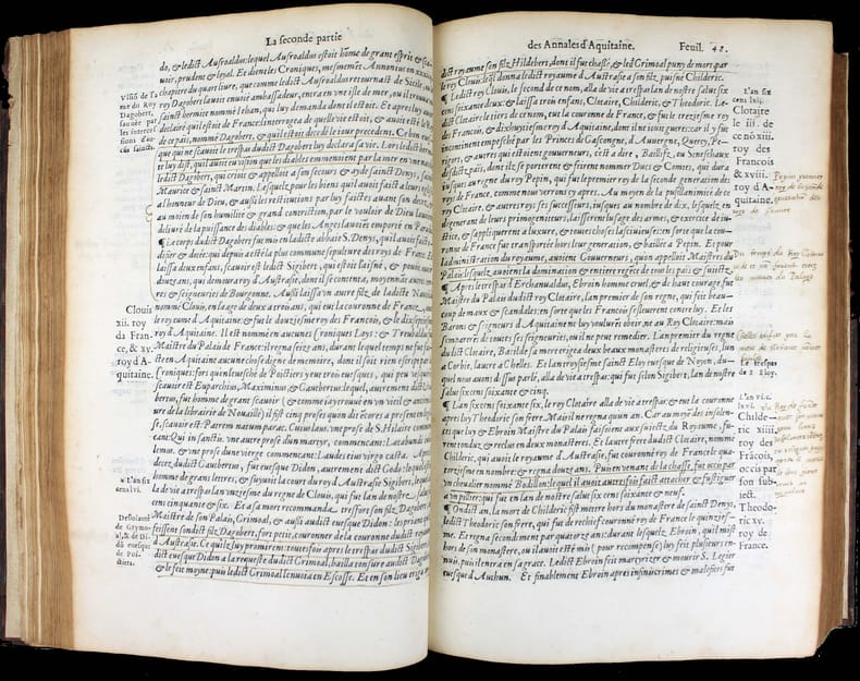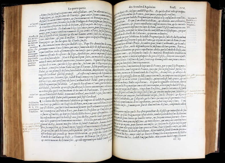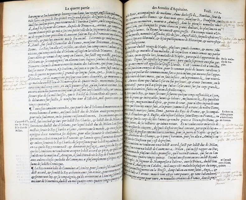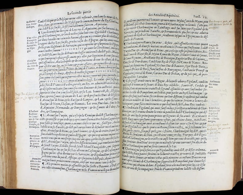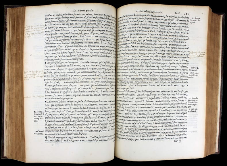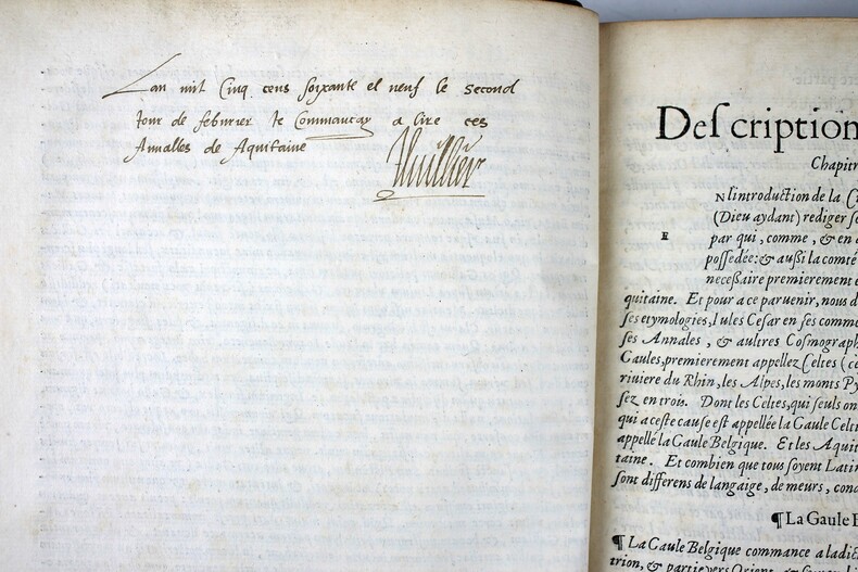 Dernière édition a avoir été augmentée par l'auteur, mort cette même année 1557. Un exemplaire fort intéressant qui nous permet d'évaluer l'accueil du livre de Bouchet en son temps. Il a été très abondamment annoté en 1569 par un certain Luillier, qui a laissé 300 ou 400 notes dans les marges et a souligné d'encore plus nombreux passages. Lecteur attentif, ces notes sont un court résumé du texte de Bouchet. Où l'on voit que pour ce lecteur, ces "Annales", soigneusement étudiées, lui ont servi de cours d'histoire, les notes lui permettant de retrouver facilement les faits historiques et de mieux les mémoriser. Jean Bouchet (1476-1557), procureur à Poitiers, composa un grand nombre d'ouvrages historiques ou littéraires. Il était l'ami de Rabelais qui a loué son beau langage. Dans ces Annales, Bouchet ne se contente pas de l'histoire de l'Aquitaine mais l'étend de fait à toute l'histoire de France, en particulier à l'épopée de Jeanne d'Arc. "J'ai ouy dire en ma jeunesse ... qu'en ma maison [à Poitiers] y avait eu hostellerie où la dite Jehanne était logée." Et un de ses voisins l'a vu monter sur son cheval "toute armée en blanc" pour aller à Orléans. Une anecdote qui a été relevée et annotée par notre lecteur attentif. "Cet ouvrage, dont le mérite a été généralement reconnu, est la meilleur production du trop fécond Jean Bouchet." (Brunet) "Les Annales de Bouchet ont sans doute bien des défauts, mais elles ont aussi quelque chose de très estimable. ... Il faut donc pardonner à Bouchet les fautes qui lui sont communes avec bien d'autres auteurs de son temps. Il nous présente d'ailleurs quelques faits fort bien débrouillés, des anecdotes historiques très intéressantes, et qu'on ignorerait absolument sans lui, des réflexions judicieuses." (Dreux-Duradier, Bibliothèque historique et critique du Poitou) Note à la fin des feuillets liminaires et signature : "L'an mille cinq cens soixante et neuf le second jour de février je commençay à lire ces Annales de Aquitaine." Un autre note en fin du livre donne la date d'achèvement de sa lecture : "Je achavay de lire ce livre le vendredy xi jour de mars 1569. Lhuillier" . Beau bois gravé à pleine page au verso du titre. Marque gravée de l'imprimeur sur le dernier feuillet. Brunet I, 1164. Tchemerzine, Bibliographie d'éditions originales et rares II, 45. Discrètes restaurations au dos. Très bel exemplaire. /// In-folio de (16), 378, (1) ff. Veau brun, dos à nerfs, fleuron doré au centre des plats, filets à froid d'encadrement sur les plat avec fleuron aux angles. (Reliure de l'époque.) //// The last edition to have been enlarged by the author, who died in 1557. A very interesting copy that allows us to assess the reception of Bouchet's book in its day. It was extensively annotated in 1569 by a Luillier, who left 300 or 400 notes in the margins and underlined even more passages. For this careful reader, these notes are a short summary of Bouchet's text. It's clear that for him, these carefully studied "Annales" served as a history course, with the notes enabling him to find historical facts easily and memorize them. Jean Bouchet (1476-1557), a prosecutor in Poitiers, wrote a large number of historical and literary works. He was a friend of Rabelais, who praised his beautiful language.In these Annales, Bouchet does not confine himself to the history of Aquitaine, but in fact extends it to the entire history of France, in particular to the epic of Joan of Arc. "I heard in my youth ... that in my house [in Poitiers] there had been a hostelry where the said Jehanne was lodged." And one of her neighbors saw her mount her horse "all armed in white" to ride to Orleans. This anecdote has been noted and annotated by our attentive reader. "This work, whose merit has been generally recognized, is the best production of the overly prolific Jean Bouchet." (Brunet). "Bouchet's Annales undoubtedly have many faults, but they also have something very valuable. ... We must therefore forgive Bouchet the faults he shares with many other authors of his time. On the other hand, he presents us with some very well-crafted facts, some very interesting historical anecdotes, and some judicious reflections." (Dreux-Duradier, Bibliothèque historique et critique du Poitou) Note at end of introductory pages and signature: "L'an mille cinq cens soixante et neuf le second jour de février je commençay à lire ces Annales de Aquitaine." An other note at the end of the book gives the date of completion of his reading : "Je achavay de lire ce livre le vendredy xi jour de mars 1569. Lhuillier". Fine full-page woodcut on verso of title. Engraved printer's mark on last leaf.Brunet I, 1164.Tchemerzine, Bibliographie d'éditions originales et rares II, 45. Tchemerzine, Bibliographie d'éditions originales et rares II, 45. Slight restoration to the spine. A very fine copy.
