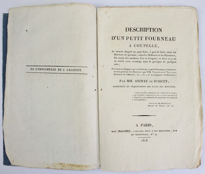 Seule édition. Anfrye et Joseph d'Arcet étaient inspecteurs et essayeurs des monnaies. L'exemplaire est tel que paru, mais la ficelle qui tenait les cahiers fait défaut. Bel exemplaire. /// In-8 de 48 pp., 3 planches h.-t. Broché, couverture bleue de l'époque. ////
