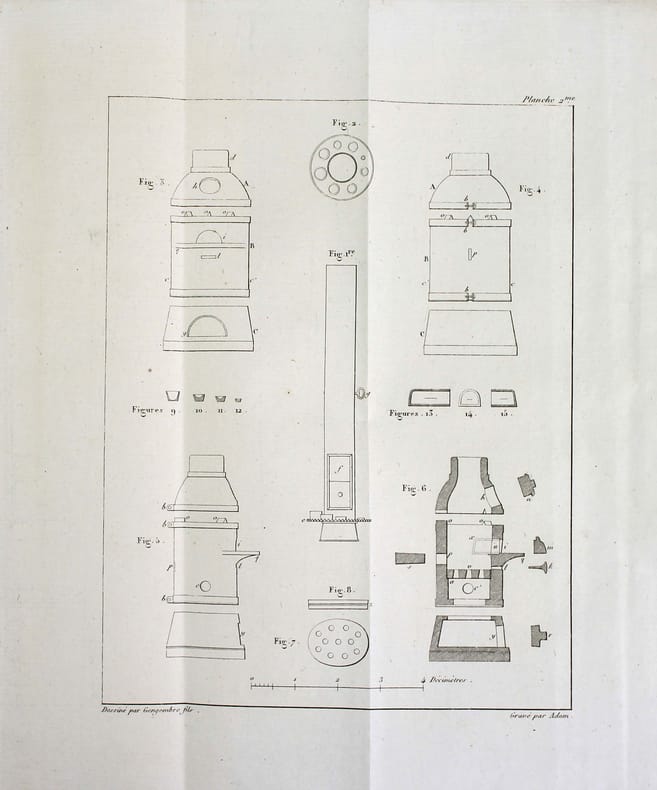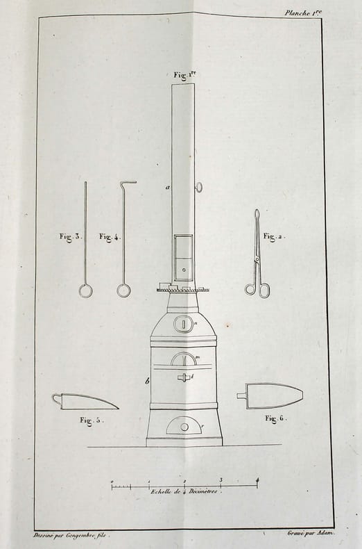 Paris, J. Klostermann fils, 1812, 12,5X20cm, plein veau à décor repoussé, médaillon centrale orné d'un monogramme doré, roulette sur les contre-plats, 96p, 48p. Seconde édition. Reliure du temps à l'état d'usage mais solide exemplaire. Mors supérieur fendu mais solidaire. Coiffes frottées. Ouvrage présentant quelques rousseurs, principalement sur les gardes et la page de titre. Complet des 3 planches dépliantes en fin d'ouvrage pour La Description d'un petit fourneau à coupelle.