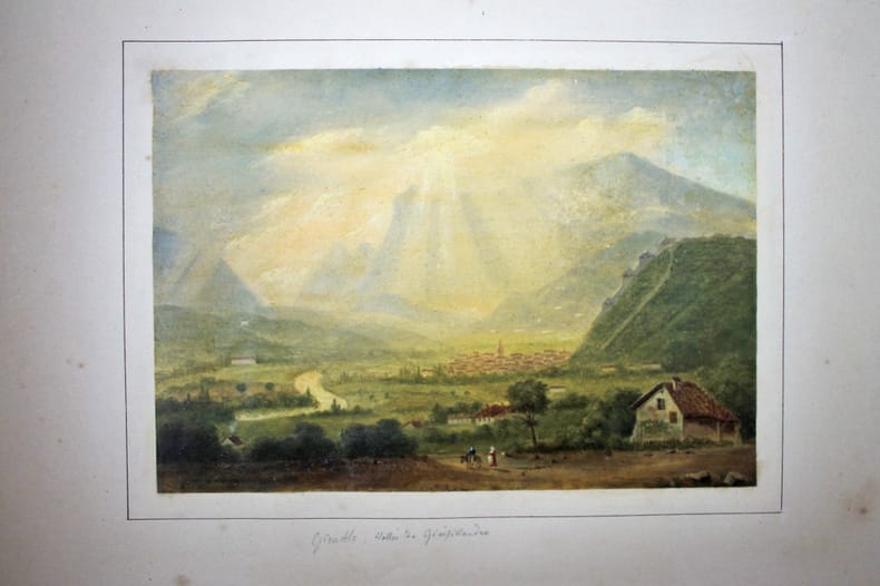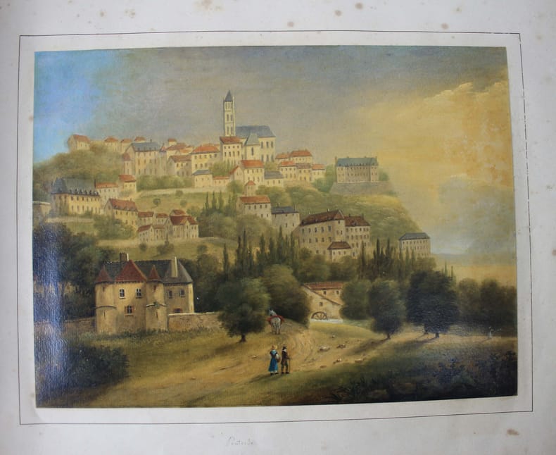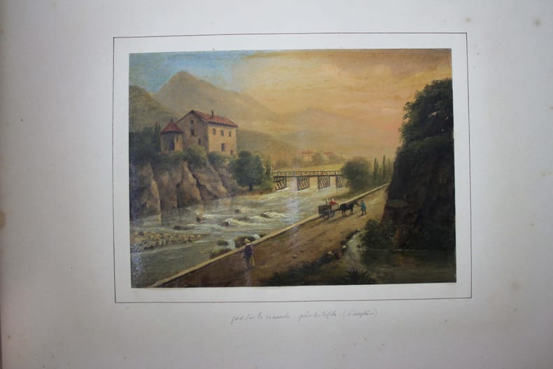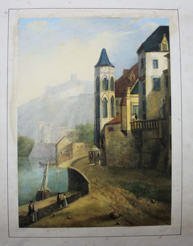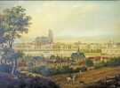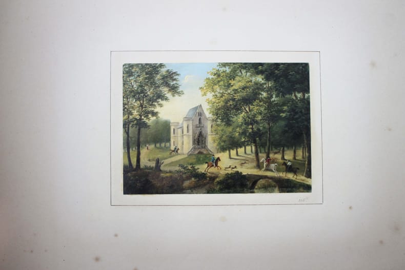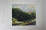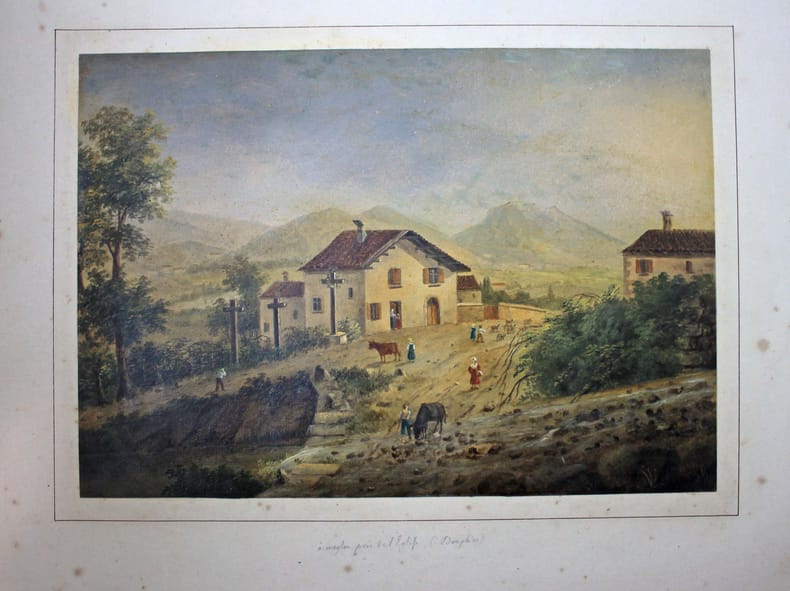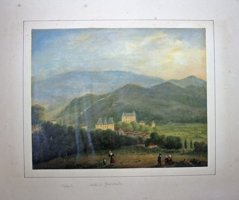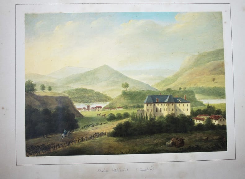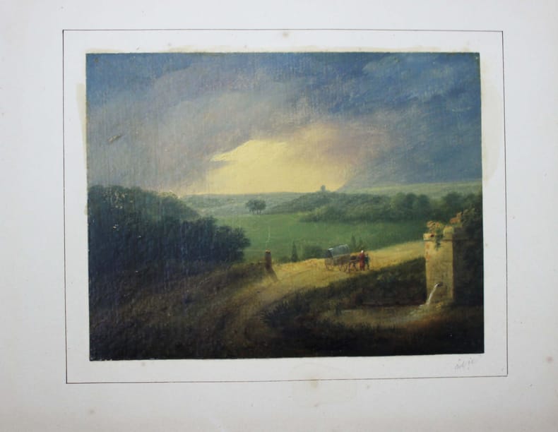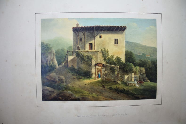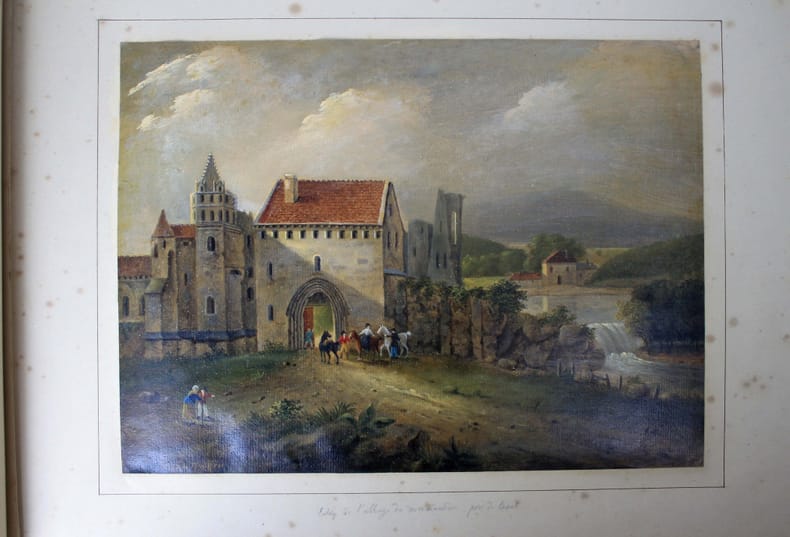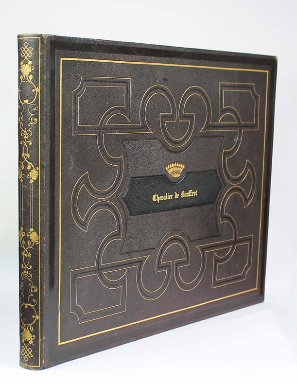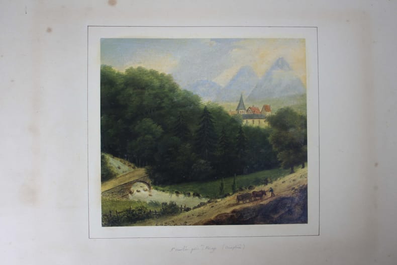 Album contenant 36 peintures à l'huile originales du chevalier de Bouffret. 15 montrent des paysages du Dauphiné, 6 de la région parisienne et 3 celle de Tours. Le chevalier de Bouffret, peintre paysagiste, a été actif dans les années 1820 et 1830. Il exposa au salon de Paris en 1812 et 1819 des paysages des environs de Paris et de la Touraine. Une vingtaine de ces peintures sont de grands formats 26 x 34 cm environ, les autres plus petites entre 16,5 x 22,5 cm et 18,5 x 14,5 cm. Presque toutes sont signées et toutes ont été vernies. On joint un album de 60 dessins (crayon et encre) (18,5 x 26,5 cm), non signés, mais du même artiste. Il portent le plus souvent une mention de sa main: "huile", "aquarelle" ou "sépia". On retrouve parmi ses dessins quelques uns des paysages de l'album de peintures. La maison de vente Sotheby's a vendu (14 December 2021) une huile sur toile d'un "château dans un paysage" (24 x 29.9 cm), daté de 1826 très similaire aux peintures de notre album, pour 800 £ (environ 1200 frais inclus). Belle reliure romantique pour l'album de peinture avec l'étiquette et nom doré en queue d'Alphonse Giroux. Actif de 1826 à 1848, Giroux n'était pas relieur mais faisait travailler Thouvenin qui ne travaillait pour cette maison qu'à la condition expresse de ne pas signer ses reliures. Après la disparition de Thouvenin, en janvier 1834, Bauzonnet pris le relais. Sur le premier plat une étiquette "Chevalier de Bouffret" a été apposée postérieurement. L'album de dessins est relié en demi-basane brune (défauts aux coiffes). Deux dessins (lavis d'encre sur papier) de Bouffret figurent dans le catalogue de l'exposition "Grenoble, visions d'une ville", Musée de l'ancien évêché, 2007. Les légendes au crayon sont d'évidence la main de Bouffret. Détails du contenu des albums sur demande. /// In-folio oblong de Chagrin noir, plats décorés d'un grand décor doré à arabesques, tranches dorées. (Reliure de l'époque.) //// Album containing 36 original oil paintings by Chevalier de Bouffret. 15 show landscapes of the Dauphiné, 6 of the Paris region and 3 of Tours. Chevalier de Bouffret, a landscape painter, was active in the 1820s and 1830s. He exhibited landscapes of the Paris region and Touraine at the Paris Salon in 1812 and 1819. Some twenty of these paintings are large, approx. 26 x 34 cm, the others smaller, between 16.5 x 22.5 cm and 18.5 x 14.5 cm. Almost all are signed and all have been varnished. An album of 60 unsigned drawings (pencil and ink) (18.5 x 26.5 cm) by the same artist is joined. In most cases, they bear his handwriting: oil, watercolor or sepia. His drawings include some of the landscapes in the album of paintings. The auction house Sotheby's sold (December 14, 2021) an oil on canvas of a château dans un paysage (24 x 29.9 cm), dated 1826 and very similar to the paintings in our album, for £800 (approx. 1,200 incl. fees). Beautiful romantic binding for the album of paintings with the gilt label and name on the bottom of spine of Alphonse Giroux. Active from 1826 to 1848, Giroux was not a bookbinder, but had Thouvenin work for him on the express condition that he would not sign his bindings. After Thouvenin's death in January 1834, Bauzonnet took over. A Chevalier de Boufflers label has been affixed to the front cover. The album of drawings is bound in brown half-basane (defects to the headpieces). Two drawings (ink wash on paper) by Bouffret are featured in the exhibition catalog Grenoble, visions d'une ville, Musée de l'ancien évêché, 2007. The pencil captions are obviously by Bouffret. List of contents on request.