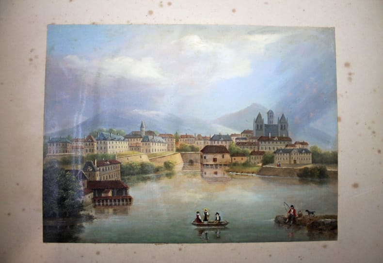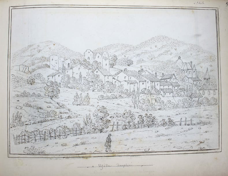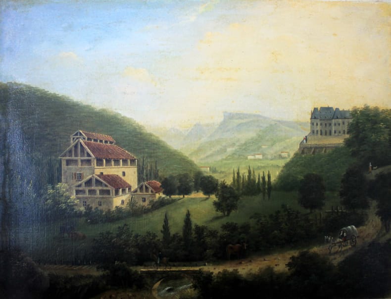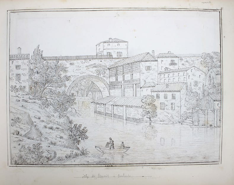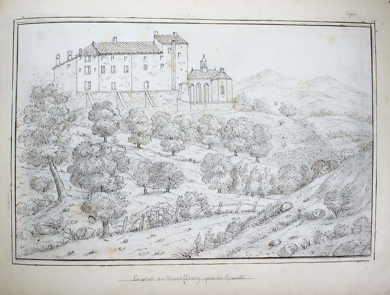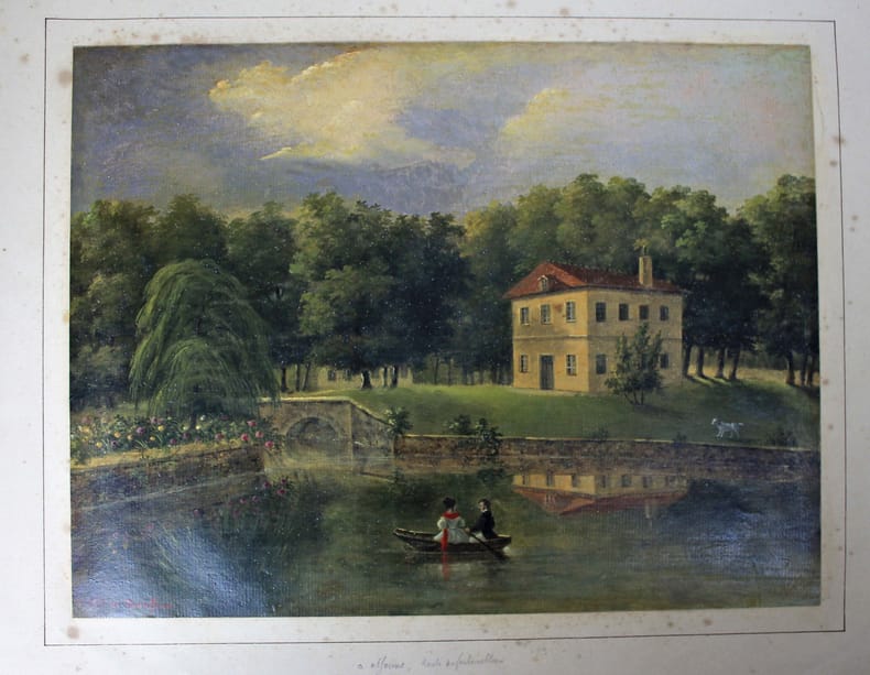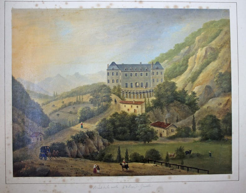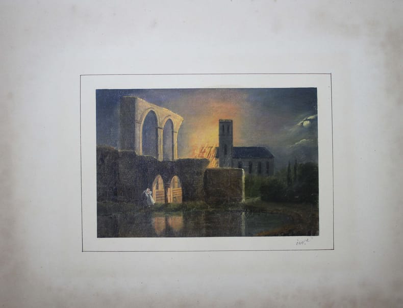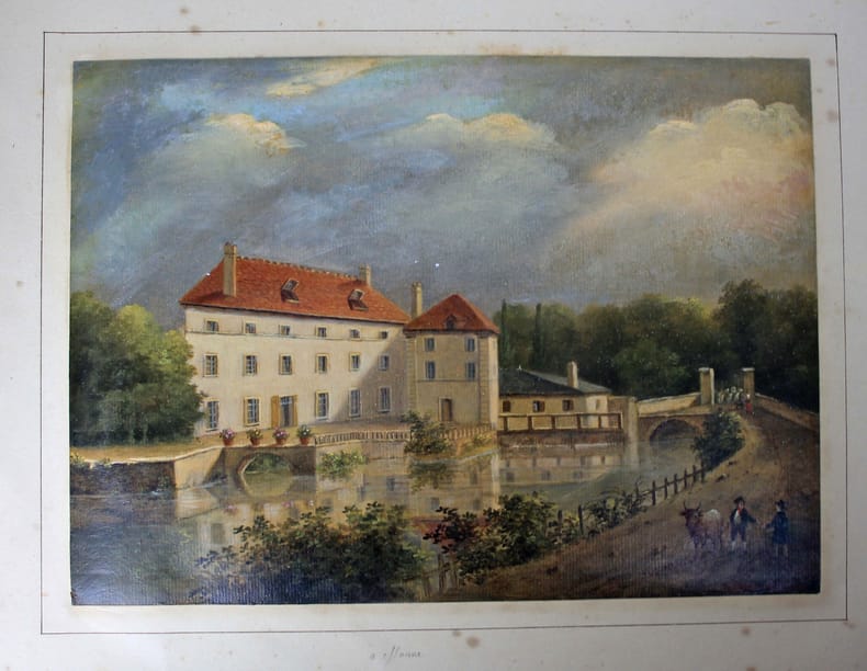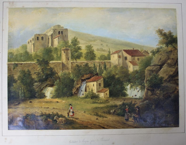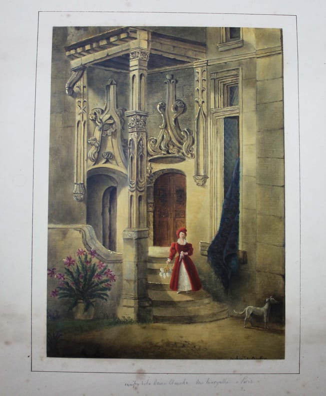 Album contenant 36 peintures à l'huile originales du chevalier de Bouffret. 15 montrent des paysages du Dauphiné, 6 de la région parisienne et 3 celle de Tours. Le chevalier de Bouffret, peintre paysagiste, a été actif dans les années 1820 et 1830. Il exposa au salon de Paris en 1812 et 1819 des paysages des environs de Paris et de la Touraine. Une vingtaine de ces peintures sont de grands formats 26 x 34 cm environ, les autres plus petites entre 16,5 x 22,5 cm et 18,5 x 14,5 cm. Presque toutes sont signées et toutes ont été vernies. On joint un album de 60 dessins (crayon et encre) (18,5 x 26,5 cm), non signés, mais du même artiste. Il portent le plus souvent une mention de sa main: "huile", "aquarelle" ou "sépia". On retrouve parmi ses dessins quelques uns des paysages de l'album de peintures. La maison de vente Sotheby's a vendu (14 December 2021) une huile sur toile d'un "château dans un paysage" (24 x 29.9 cm), daté de 1826 très similaire aux peintures de notre album, pour 800 £ (environ 1200 frais inclus). Belle reliure romantique pour l'album de peinture avec l'étiquette et nom doré en queue d'Alphonse Giroux. Actif de 1826 à 1848, Giroux n'était pas relieur mais faisait travailler Thouvenin qui ne travaillait pour cette maison qu'à la condition expresse de ne pas signer ses reliures. Après la disparition de Thouvenin, en janvier 1834, Bauzonnet pris le relais. Sur le premier plat une étiquette "Chevalier de Bouffret" a été apposée postérieurement. L'album de dessins est relié en demi-basane brune (défauts aux coiffes). Deux dessins (lavis d'encre sur papier) de Bouffret figurent dans le catalogue de l'exposition "Grenoble, visions d'une ville", Musée de l'ancien évêché, 2007. Les légendes au crayon sont d'évidence la main de Bouffret. Détails du contenu des albums sur demande. /// In-folio oblong de Chagrin noir, plats décorés d'un grand décor doré à arabesques, tranches dorées. (Reliure de l'époque.) //// Album containing 36 original oil paintings by Chevalier de Bouffret. 15 show landscapes of the Dauphiné, 6 of the Paris region and 3 of Tours. Chevalier de Bouffret, a landscape painter, was active in the 1820s and 1830s. He exhibited landscapes of the Paris region and Touraine at the Paris Salon in 1812 and 1819. Some twenty of these paintings are large, approx. 26 x 34 cm, the others smaller, between 16.5 x 22.5 cm and 18.5 x 14.5 cm. Almost all are signed and all have been varnished. An album of 60 unsigned drawings (pencil and ink) (18.5 x 26.5 cm) by the same artist is joined. In most cases, they bear his handwriting: oil, watercolor or sepia. His drawings include some of the landscapes in the album of paintings. The auction house Sotheby's sold (December 14, 2021) an oil on canvas of a château dans un paysage (24 x 29.9 cm), dated 1826 and very similar to the paintings in our album, for £800 (approx. 1,200 incl. fees). Beautiful romantic binding for the album of paintings with the gilt label and name on the bottom of spine of Alphonse Giroux. Active from 1826 to 1848, Giroux was not a bookbinder, but had Thouvenin work for him on the express condition that he would not sign his bindings. After Thouvenin's death in January 1834, Bauzonnet took over. A Chevalier de Boufflers label has been affixed to the front cover. The album of drawings is bound in brown half-basane (defects to the headpieces). Two drawings (ink wash on paper) by Bouffret are featured in the exhibition catalog Grenoble, visions d'une ville, Musée de l'ancien évêché, 2007. The pencil captions are obviously by Bouffret. List of contents on request.
