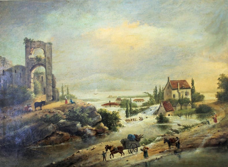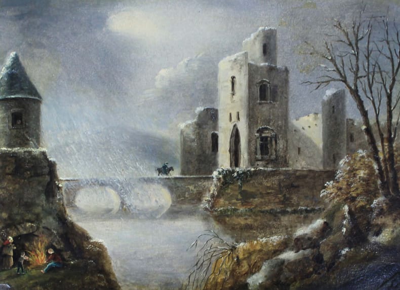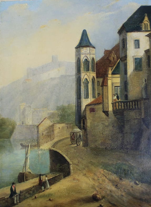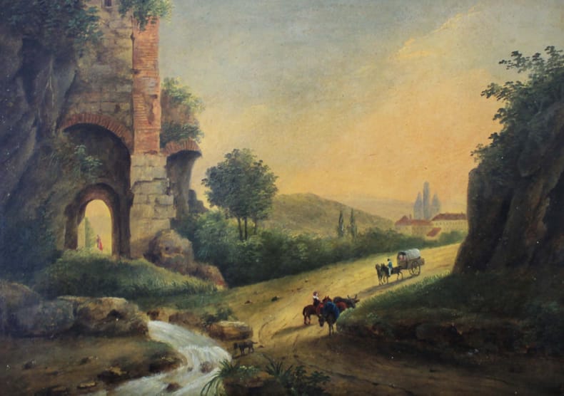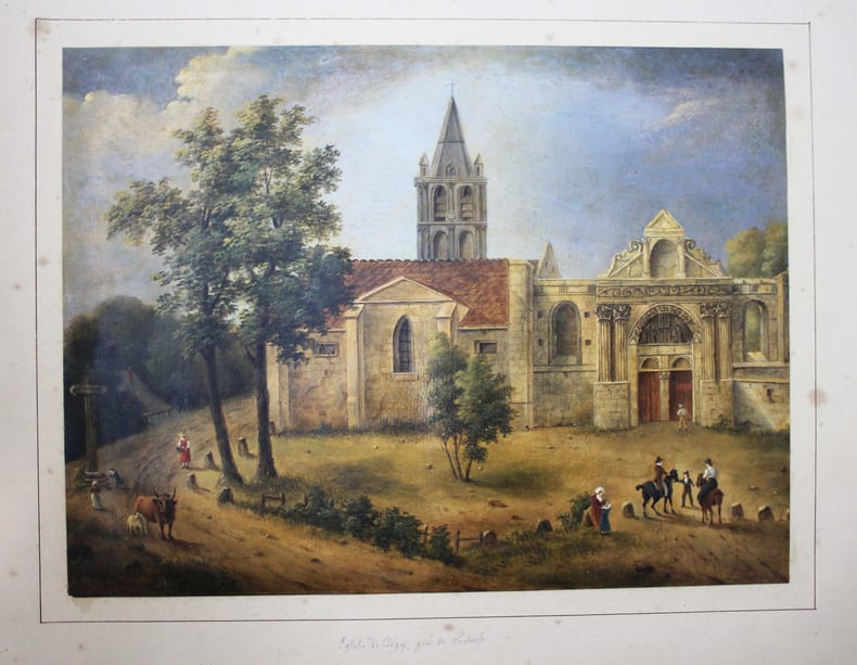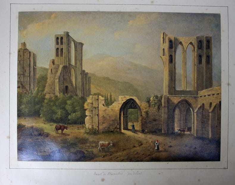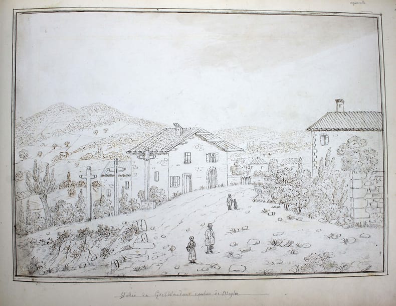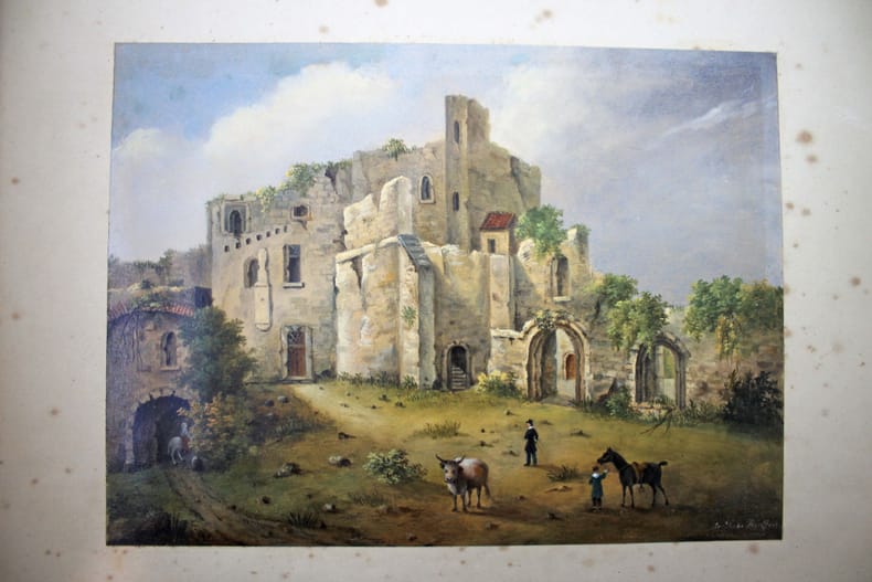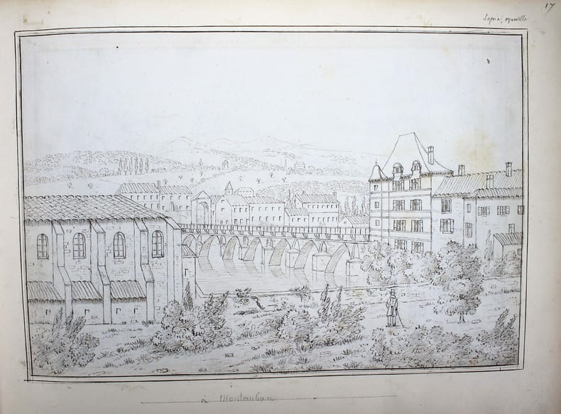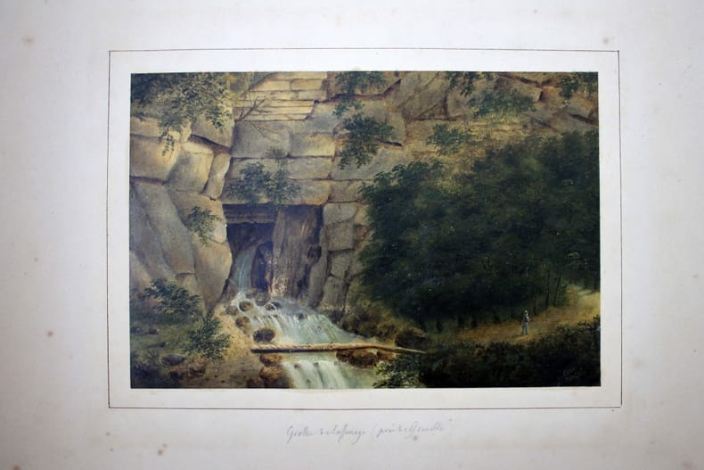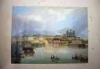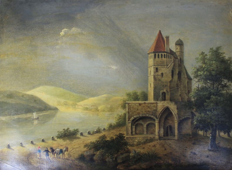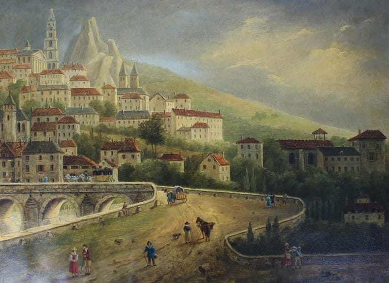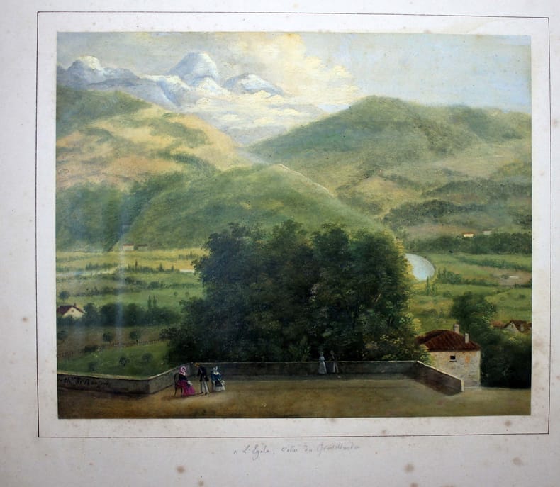 Album contenant 36 peintures à l'huile originales du chevalier de Bouffret. 15 montrent des paysages du Dauphiné, 6 de la région parisienne et 3 celle de Tours. Le chevalier de Bouffret, peintre paysagiste, a été actif dans les années 1820 et 1830. Il exposa au salon de Paris en 1812 et 1819 des paysages des environs de Paris et de la Touraine. Une vingtaine de ces peintures sont de grands formats 26 x 34 cm environ, les autres plus petites entre 16,5 x 22,5 cm et 18,5 x 14,5 cm. Presque toutes sont signées et toutes ont été vernies. On joint un album de 60 dessins (crayon et encre) (18,5 x 26,5 cm), non signés, mais du même artiste. Il portent le plus souvent une mention de sa main: "huile", "aquarelle" ou "sépia". On retrouve parmi ses dessins quelques uns des paysages de l'album de peintures. La maison de vente Sotheby's a vendu (14 December 2021) une huile sur toile d'un "château dans un paysage" (24 x 29.9 cm), daté de 1826 très similaire aux peintures de notre album, pour 800 £ (environ 1200 frais inclus). Belle reliure romantique pour l'album de peinture avec l'étiquette et nom doré en queue d'Alphonse Giroux. Actif de 1826 à 1848, Giroux n'était pas relieur mais faisait travailler Thouvenin qui ne travaillait pour cette maison qu'à la condition expresse de ne pas signer ses reliures. Après la disparition de Thouvenin, en janvier 1834, Bauzonnet pris le relais. Sur le premier plat une étiquette "Chevalier de Bouffret" a été apposée postérieurement. L'album de dessins est relié en demi-basane brune (défauts aux coiffes). Deux dessins (lavis d'encre sur papier) de Bouffret figurent dans le catalogue de l'exposition "Grenoble, visions d'une ville", Musée de l'ancien évêché, 2007. Les légendes au crayon sont d'évidence la main de Bouffret. Détails du contenu des albums sur demande. /// In-folio oblong de Chagrin noir, plats décorés d'un grand décor doré à arabesques, tranches dorées. (Reliure de l'époque.) //// Album containing 36 original oil paintings by Chevalier de Bouffret. 15 show landscapes of the Dauphiné, 6 of the Paris region and 3 of Tours. Chevalier de Bouffret, a landscape painter, was active in the 1820s and 1830s. He exhibited landscapes of the Paris region and Touraine at the Paris Salon in 1812 and 1819. Some twenty of these paintings are large, approx. 26 x 34 cm, the others smaller, between 16.5 x 22.5 cm and 18.5 x 14.5 cm. Almost all are signed and all have been varnished. An album of 60 unsigned drawings (pencil and ink) (18.5 x 26.5 cm) by the same artist is joined. In most cases, they bear his handwriting: oil, watercolor or sepia. His drawings include some of the landscapes in the album of paintings. The auction house Sotheby's sold (December 14, 2021) an oil on canvas of a château dans un paysage (24 x 29.9 cm), dated 1826 and very similar to the paintings in our album, for £800 (approx. 1,200 incl. fees). Beautiful romantic binding for the album of paintings with the gilt label and name on the bottom of spine of Alphonse Giroux. Active from 1826 to 1848, Giroux was not a bookbinder, but had Thouvenin work for him on the express condition that he would not sign his bindings. After Thouvenin's death in January 1834, Bauzonnet took over. A Chevalier de Boufflers label has been affixed to the front cover. The album of drawings is bound in brown half-basane (defects to the headpieces). Two drawings (ink wash on paper) by Bouffret are featured in the exhibition catalog Grenoble, visions d'une ville, Musée de l'ancien évêché, 2007. The pencil captions are obviously by Bouffret. List of contents on request.