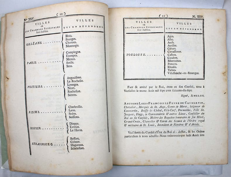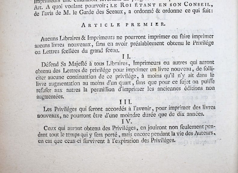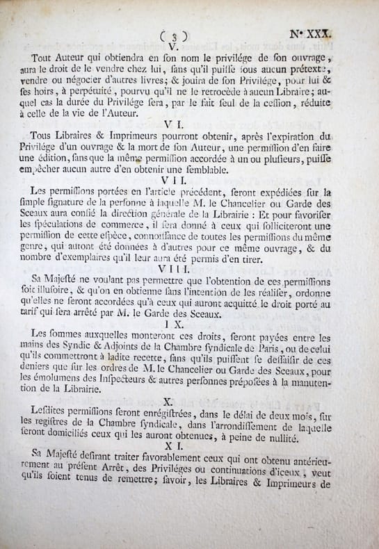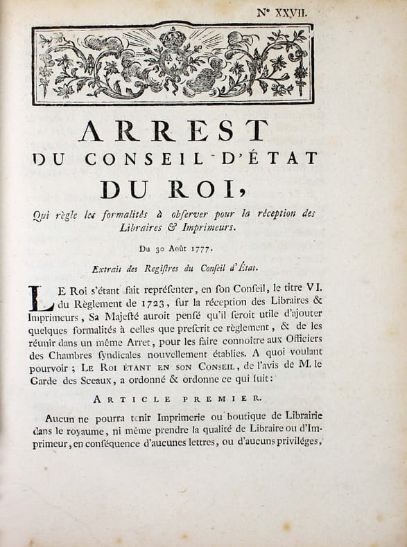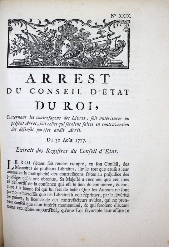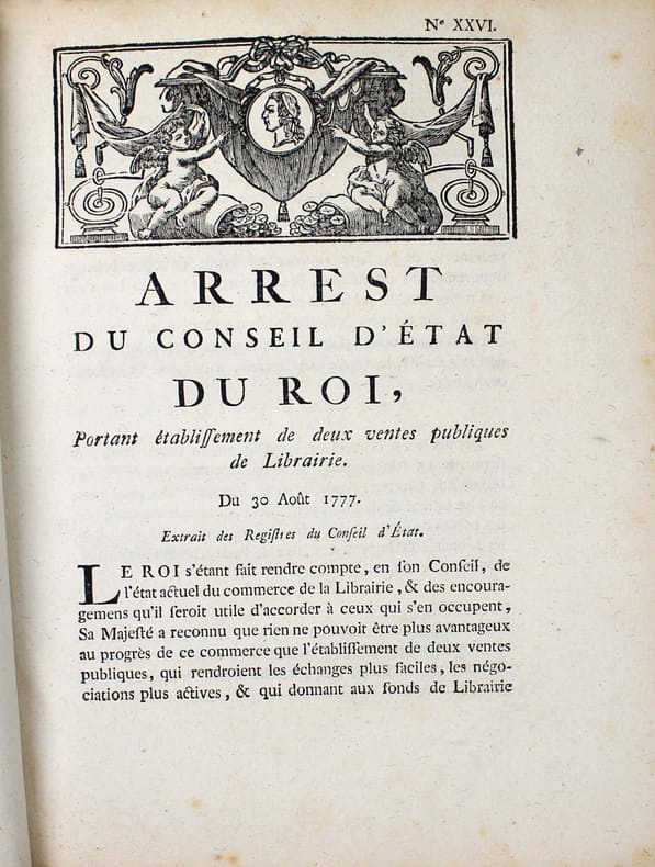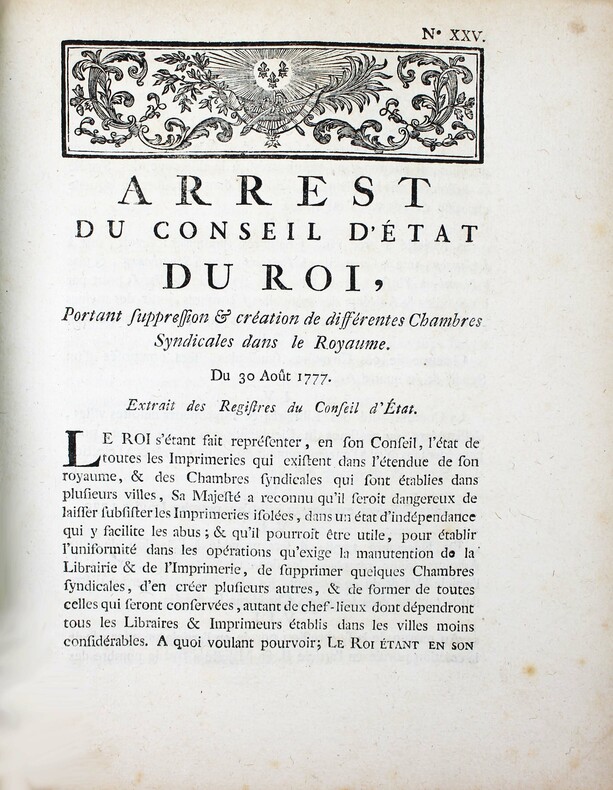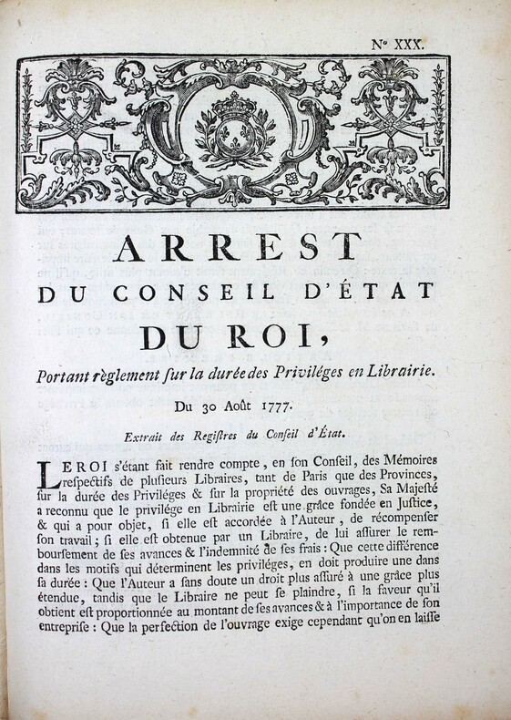En 1777 a été promulguée une importante législation sur le commerce du livre, qui reconnaît à l'auteur une propriété perpétuelle sur son oeuvre et limite le privilège des libraires-imprimeurs à 10 ans. Elle s'effforce aussi d'établir plus d'égalité entre libraires parisiens et ceux de province. 1. Arrest du Conseil d'Etat du Roi portant suppression et création de différentes chambres syndicales dans le royaume. 12 pp "Sa Majesté a reconnu quil serait dangereux de laisser subsister les imprimeries isolées, dans un état dindépendance qui y facilite les abus..." Les chambres syndicales établies à Limoges, Rennes et Vitry seront supprimées. Seront créées cinq chambres à Besançon, Caen, Poitiers, Strasbourg. 2. Arrest portant établissement de deux ventes publiques de librairie. 4 pp. Autorisation de deux ventes publiques par an des fonds de librairie et des privilèges dont les libraires et imprimeurs de Paris et de province voudront se défaire. "Ce serait le seul moyen de faire cesser la rivalité qui divise la Librairie de Paris & celle des provinces, de la faire tourner au profit de cette branche importante du commerce, & de former de tous les libraires une même famille qui naura plus quun même intérêt, qui sera appelée aux mêmes négociations, & qui participera aux mêmes grâces." - 3. Arrest qui règle les formalités à observer pour la réception des libraires & imprimeurs. 4 pp. "Aucun ne pourra tenir imprimerie ou boutique de librairie dans le royaume, ni même prendre la qualité de libraire ou d'imprimeur, en conséquence daucunes lettres, ou d'aucunsprivilèges, tel quil puisse être, sil na été reçu Maître dans une Chambre syndicale, à laquelle maîtrise il ne pourra être admis, quaprès avoir fait apprentissage pendant le temps & espace de quatre années entières et consécutives & servi les Maîtres en qualité de Compagnon, au moins durant trois années après letemps de son apprentissage achevé, quil n'ait au moins vingt ans accomplis,quil ne soit congru en langue Latine, & quil ne sache lire le Grec, dont il sera tenu de rapporter un certificat du Recteur de lUniversité..." - 4. Arrest portant règlement de discipline pour les compagnons imprimeurs. 8 pp. Du contrôle des ouvriers par l'enregistrement à la Chambre syndicale et interdiction formelle d'association "Les ouvriers ne pourront, sous aucun prétexte que ce soit, faire aucun banquet ou assemblée, soit dans les Imprimeries où ils travaillent, soit dans les cabarets ou ailleurs, sous peine de punition exemplaire. [...] Défend Sa Majesté à tous Imprimeurs, de recevoir aucuns Ouvriers qui auront été congédiés dune imprimerie pour débauches réitérées." - 5. Arrest concernant les contrefaçons des livres. 4 pp. A cause de la multiplicité des contrefaçons "Il est indispensable de ramener tout le corps de la Librairie à un plan de conduite, dont la raison, la prudence & lintérêt réciproque auraient dû lui faire sentir plus tôt la nécessité." - 6. Arrest portant règlement sur la durée des privilèges en librairie. 4 pp. "Sa Majesté a pensé quun Règlement qui restreindrait le droit exclusif des libraires au temps qui sera porté dans le privilège, serait leur avantage, parce quune jouissance limitée, mais certaine, est préférable à une jouissance indéfinie, mais illusoire. Quil serait lavantage du Public, qui doit en espérer que les livres tomberont à une valeur proportionnée aux facultés de ceux qui veulent se les procurer. Qu'il serait favorable aux Gens de lettres, qui pourront, après un temps donné, faire des notes et des commentaires sur un auteur, sans que personne puisse leur contester le droit de faire imprimer le texte. Quenfin ce règlement serait dautant plus utile, quil ne pourrait qu'augmenter lactivité du commerce & exciter entre tous les Imprimeurs une émulation favorable au progrès & à la perfection de leur Art." /// In-4 de (36) pp. Couverture postérieure muette. //// A collection of 6 Orders concerning the book trade and printing. In 1777, this important legislation on the book trade was enacted, recognizing the author's perpetual ownership on his work and limiting the privilege of booksellers-printers to 10 years. It also sought to establish more equality between Parisian and provincial booksellers.