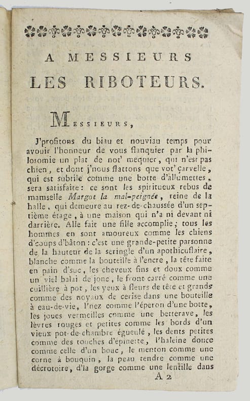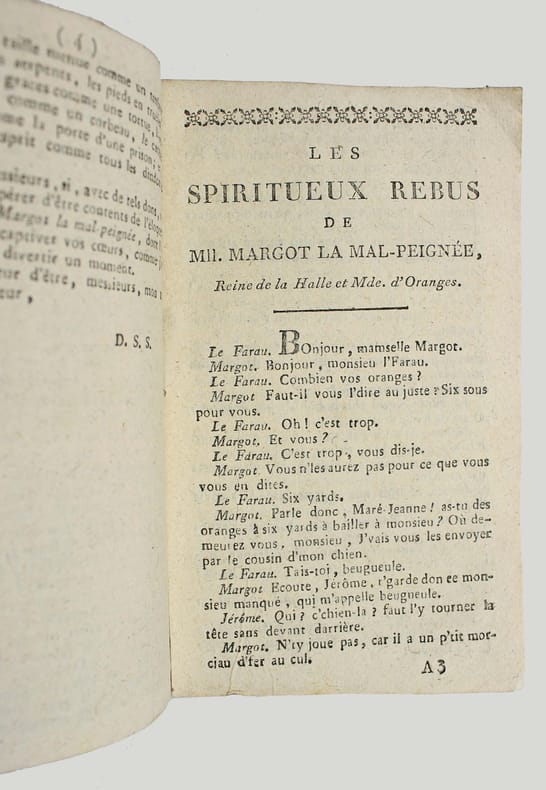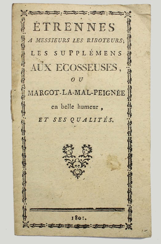 Ecrit en langue poissarde, l'argot des Halles de Paris. Les riboteurs sont des fêtards, les écosseuses, des prostituées et Margot-la-mal-peignée, la figure populaire de prostituée grossière qui a ici " l'haleine douce comme celle d'un bouc". Titre avec encadrement sur la couverture et deux bois gravés sur la 2e couverture. Bel exemplaire. René Hélot, "La Bibliothèque bleue en Normandie", Rouen, 1928, n° 80. - Sauvy, La librairie Chalopin : livres et livrets de colportage à Caen au début du XIXe siècle, dans "Bulletin d'histoire moderne et contemporaine", no 11 (1977), p. 109-110. /// In-12 de 11, (1) pp. Broché, couverture imprimée. //// /// PLUS DE PHOTOS SUR WWW.LATUDE.NET