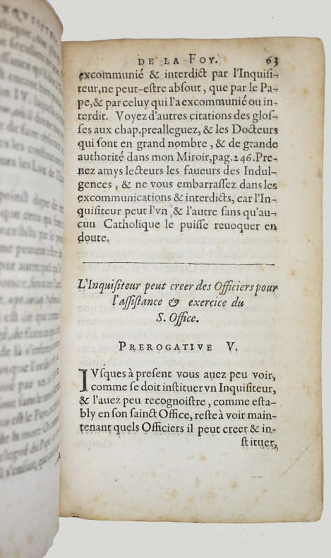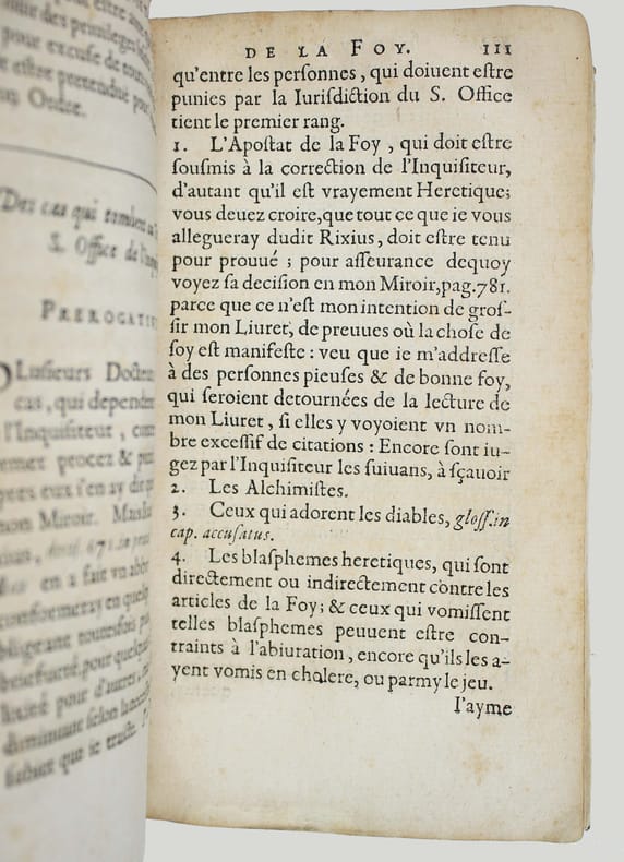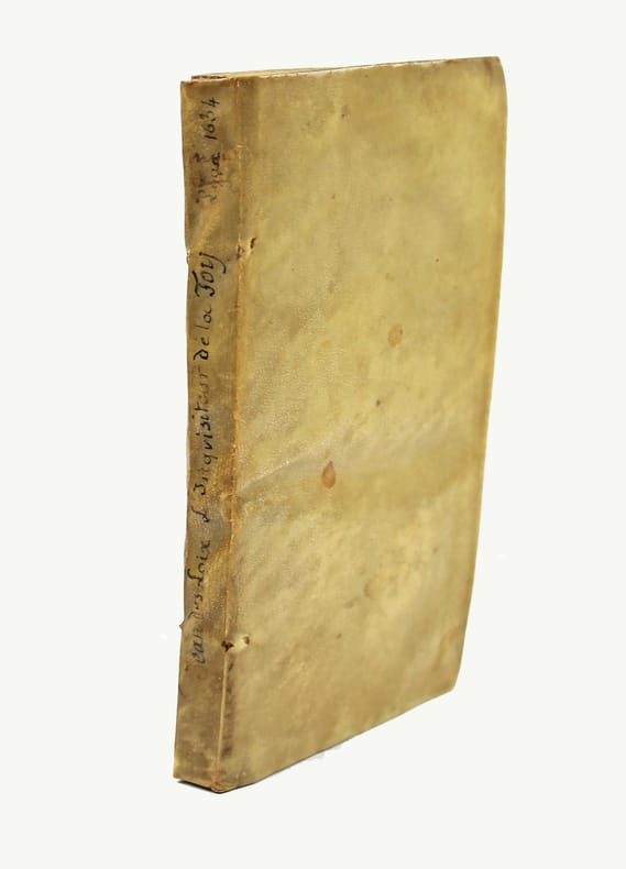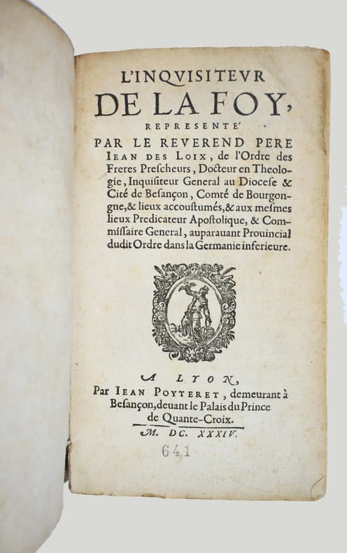 Première et seule édition, un des rares ouvrages de cette époque en français sur l'Inquisition. "La contribution la plus originale de Jean Des Loix est "L'inquisiteur de la foy", paru six ans après sa somme en latin le "Speculum inquisitionis bisuntinae". Ce traité est écrit en français. Divulguer en vernaculaire ce qui touche au Saint Office est peu fréquent de la part de ses propres agents. L'ouvrage, 'fait particulierement pour le peuple', s'articule autour des neuf 'prérogatives' de l'inquisiteur, qui visent à rappeler de façon systématique la législation inquisitoriale." (Hervé Baudry, Inquisiteurs et répression des livres aux xvie-xviie siècles). Supérieur des dominicains de Besançon, Jean Des Loix était Inquisiteur général pour le Diocèse de Besançon et la Bourgogne. Sa juridiction s'étendait à Lyon, Langre et aux diocèses de Lausanne, Bâle et Bellay. "Très impliqué et particulièrement sévère en la matière, il considère la sorcellerie comme étant de la compétence exclusive de l'Inquisition." Robert Muchembled, La sorcière au bûcher p. 271. On ne connait pas d'autre livre imprimé par Jean Poyteret. Sur la page de titre il affirme demeurer à Besançon. Il s'agissait probablement d'un libraire de Besançon qui a fait imprimer à son compte ce livre à Lyon. Bel exemplaire, en vélin de l'époque. Livre très rare, dont on ne connaît que trois exemplaires dans les bibliothèques (BNF, Besançon, Dôle). /// In-8 de (22), 203 pp. Vélin. (Reliure de l'époque.) //// First and only edition, one of the rare works of this period in French on the Inquisition. Jean Des Loix's most original contribution is L'inquisiteur de la foy (The Inquisitor of Faith), published six years after his Latin work Speculum inquisitionis bisuntinae. This treatise is written in French. It was unusual for agents of the Holy Office to disclose information about it in the vernacular. The work, made especially for the people, is structured around the nine prerogatives of the inquisitor, which aim to systematically recall inquisitorial legislation." (Hervé Baudry, Inquisiteurs et répression des livres aux xvie-xviie siècles). Superior of the Dominicans of Besançon, Jean Des Loix was Grand Inquisitor for the Diocese of Besançon and Burgundy. His jurisdiction extended to Lyon, Langres, and the dioceses of Lausanne, Basel, and Bellay. Highly involved and particularly severe in this matter, he considered witchcraft to be the exclusive jurisdiction of the Inquisition. Robert Muchembled, La sorcière au bûcher p. 271. No other book printed by Jean Poyteret is known. On the title page, he states that he resides in Besançon. He was probably a bookseller from Besançon who had this book printed in Lyon at his own expense. A beautiful copy, in contemporary vellum. A very rare book, of which only three copies are known to exist in libraries. Worlcat : BNF only. CCfr : BNF, Besançon, Dôle. /// PLUS DE PHOTOS SUR WWW.LATUDE.NET