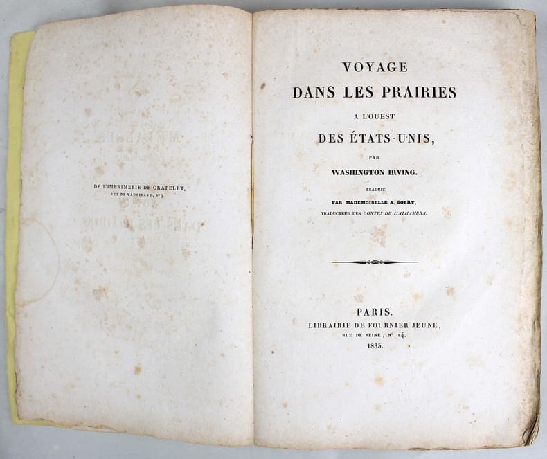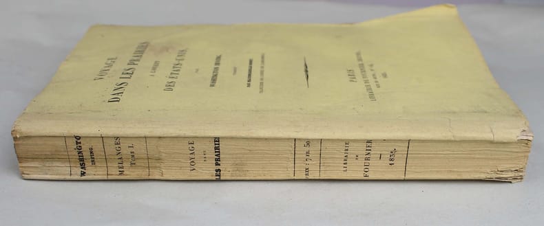 Première édition française, publiée la même année que l'édition originale américaine. Voyage d'un mois dans les territoires de chasse des Pawnies en 1832. Il débute à Fort Gibson, "un poste de notre extrême frontière de l'Ouet situé sur la Grande Rivière, près de son confluent avec l'Arkansas". Ce récit très vivant fait une large place à la description des tribus indiennes rencontrées. La traduction est de Mlle. A. Sobry. Le faux-titre porte: "Mélanges. Tome premier." Les deux autres volumes de ces "Miscellany", qui ne concernent pas l'Amérique, ont paru en anglais, mais n'ont jamais été publiés en français. Des rousseurs. /// In-8 de (4), 306, (1) pp. Broché, couverture imprimée. //// First French edition, published the same year as the original American edition. A month-long trip to Pawnie hunting grounds in 1832. It begins at Fort Gibson, a post on our extreme Ouet frontier situated on the Grande Rivière, near its confluence with the Arkansas. This lively account gives ample space to descriptions of the Indian tribes encountered. The translation is by Mlle. A. Sobry. The half-title reads: Mélanges. Tome premier." The other two volumes of these Miscellany, which do not concern America, appeared in English, but were never published in French. Some foxing.