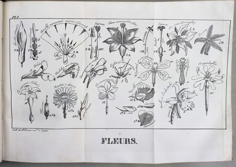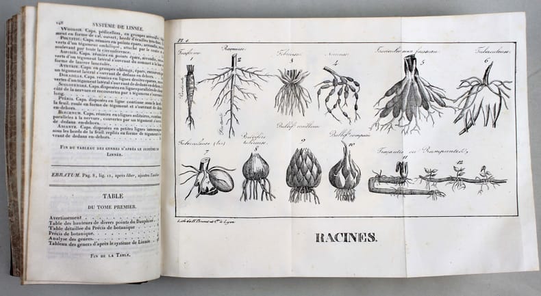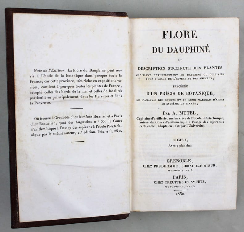 Première édition. Illustré par 4 planches hors-texte dépliantes lithographiées. "La Flore du Dauphiné peut servir à l'étude de la botanique dans presque toute la France ; car cette province, très riche en expositions variées, contient à peu près toutes les plantes de France, excepté celles des bords de la mer et celles de localités particulières principalement dans les Pyrénées et dans la Provence". Pritzel 6586. Perret 3165 : "Important ouvrage. Peu courant." Couleur du dos passée. Bel exemplaire. /// 2 tomes en un volume in-12 de XI, (1), 148 pp;, 4 pl. h.-t. / (4), 544 pp. Basane, dos orné, tranches marbrées. (Reliure de l'époque.) ////