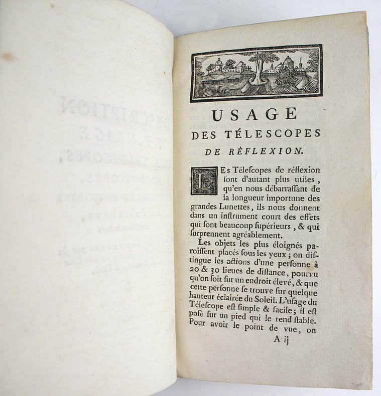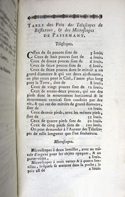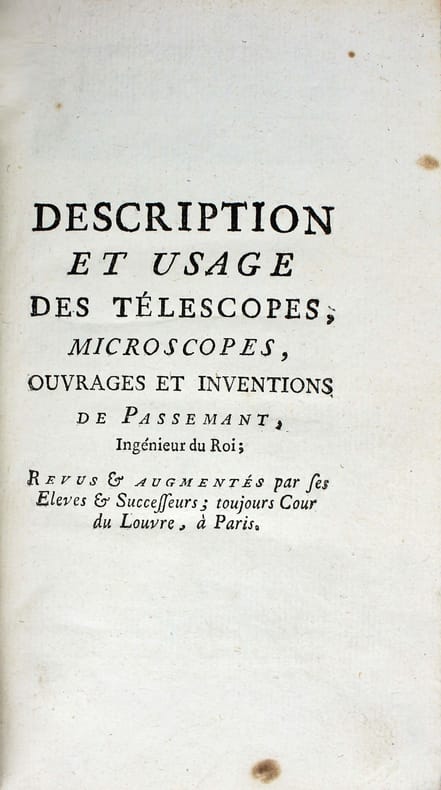Dernière édition de cette description et manuel d'utilisation des microscopes et télescopes de Passemant, le plus célèbre des fabricants d'instruments d'optique français du XVIIIe siècle. Outre ces instruments on y trouve des baromètres, des instruments de physique, des machines pneumatiques ou électriques, des pendules astronomiques, des horloges, des montres, etc... La première édition, vers 1750, ne comptait que 29 pages. Celle-ci a été revue et augmentée "par ses élèves et successeurs", qui étaient Ollivier et Nicolet. Elle est illustrée d'une gravure dépliante représentant un microscope composé de type Cuff auquel on a ajouté deux micromètres inventés par Passemant. A la fin : "Table des prix des télescopes de réflexion, & des microscopes de Passemant." Il est très rare de trouver ce petit ouvrage en reliure de l'époque, comme celui-ci. Très bon exemplaire. /// In-12 de 116, (2) pp., 1 planche. Veau, dos à nerfs orné tranches marbrées. (Reliure de l'époque.) //// Last edition of this description and user's manual for microscopes and telescopes by Passemant, the most famous French optical instrument manufacturer of the 18th century. In addition to these instruments, it includes barometers, physics instruments, pneumatic and electric machines, astronomical clocks, watches, etc... The first edition, circa 1750, had 29 pages only. This edition was revised and enlarged "by his pupils and successors", who were Ollivier et Nicolet. It is illustrated with a fold-out engraving of a compound microscope of the Cuff type, to which two micrometers invented by Passemant have been added. At the end: Table des prix des télescopes de réflexion, & des microscopes de Passemant." Very rare in contemporary binding, as here. Very good copy.