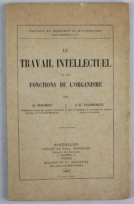 De la physiologie du travail intellectuel. Mairet était professeur de clinique des maladies mentales et nerveuses à l'Université de Montpellier et Florence, chef de laboratoire de la même clinique. Très bon exemplaire, non ouvert. /// In-8 de IX, 324 pp. Broché, couverture imprimée. ////