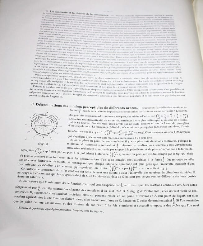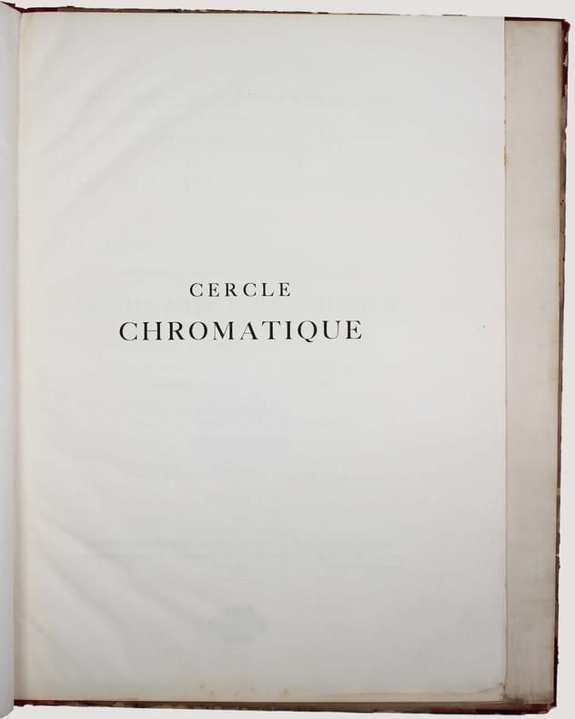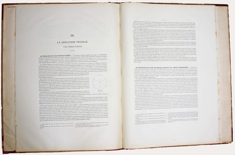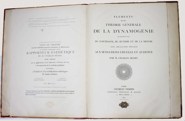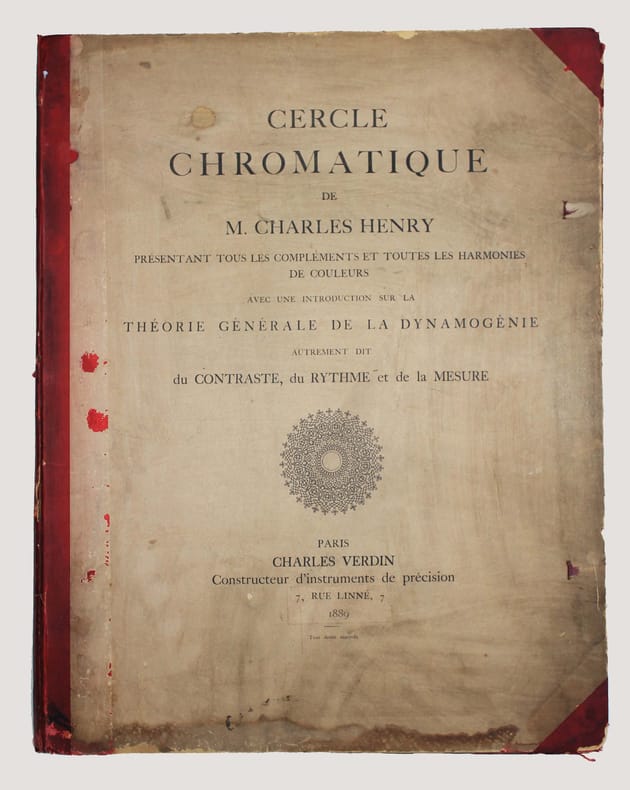 Charles Henry (1859-1926) proposait une théorie de la sensation visuelle, dans laquelle il ramène le problème esthétique à un problème scientifique. Nombreuses illustrations dans le texte et une grande planche hors-texte (59,5 x 47 cm) : le cercle chromatique, qui a été imprimé au moyen de six tirages superposés de différentes couleurs (rouge, orangé, jaune, vert, bleu, noir). Le titre que nous donnons est celui du cartonnage imprimé de l'éditeur. Le faux-titre porte : "Cercle chromatique" Le titre qui suit est : "Eléments d'une théorie ge?ne?rale de la dynamogénie, autrement dit du contraste, du rythme et de la mesure avec applications spéciales aux sensations visuelle et auditive." Très rare. Exemplaire numéroté 117. Quelques défauts au cartonnage. /// In-plano (47 x 60 cm) de (4), VI, 56, (2) pp., 1 planche h.-t. Cartonnage imprimé, dos et coins de toile rouge. (Reliure de l'éditeur.) //// First edition. With one very large colour engraved plate, Henry's chromatic circle (59,5 x 47 cm). A work that had a great influence on the painting of the Neo-Impressionists, like Seurat and Signac. "Henry was attempting to build an all-embracing scientific aesthetic on the foundations of psychophysics, the new science of the mind which seemed to promise tremendous rewards in a wide range of medical and artistic endeavours. (...) To some extent Henry stands as heir to the great classical and Renaissance thinkers who attempted to forge all-embracing, cosmological systems of proportional harmonics, and he undoubtely saw himself as working in the spirit of Leonardo, whose manuscripts he was helping to publish for the first time." Martin Kemp, The science of art, p. 318. The title we gives is that of the publisher's printed boards. The half-title reads: "Cercle chromatique". Title page that follows is: "Eléments d'une théorie générale de la dynamogénie, autrement dit du contraste, du rythme et de la mesure avec applications spéciales aux sensations visuelle et auditive." Copy numbered 117. Some flaws to boards. /// PLUS DE PHOTOS SUR WWW.LATUDE.NET