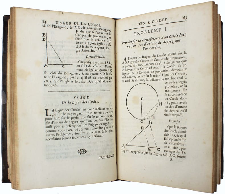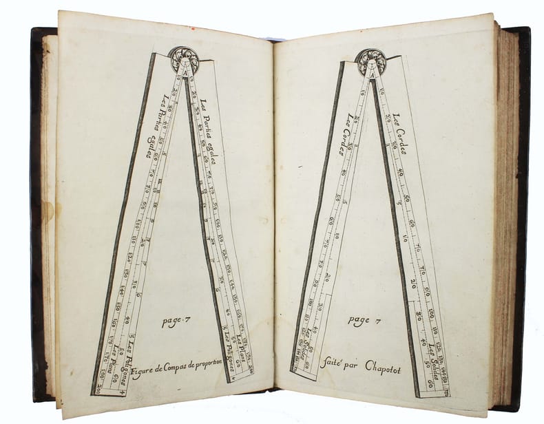 Rare première édition. Illustré par 2 planches hors-texte représentant un compas fabriqué par Chapotot. Très bel exemplaire. /// In-8 de 138 pp., 2 planches h.-t. Veau, dos à nerfs orné. (Reliure de l'époque.) //// The rare first edition. Illustrated with 2 plates out of text showing a compass manufactured by Chapotot. "By the time Ozanam decided to write on the sector, it was a well-known instrument and had been developed into many different forms. The text is a description of a simple sector with only a few scales (line of lines, polygons, planes, solids and chords), but these would have sufficed for most of the problems encountered by his readers." Tomash O 69. Very fine copy.