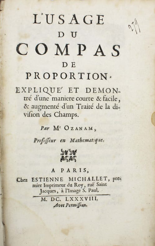 Ozanam's work on the proportional compas - first printed in 1688 - became very popular and successfull and it was lastly printed in 1794.""By almost any criterion Ozanam cannot be regarded as a first-rate mathematician, even of his own time. But he had a flair for writing and during his career wrote a number of books, some of which were very popular, passing through many editions.""(DSB).