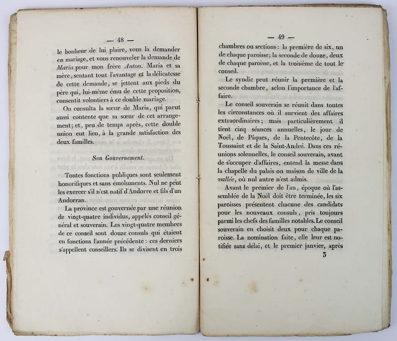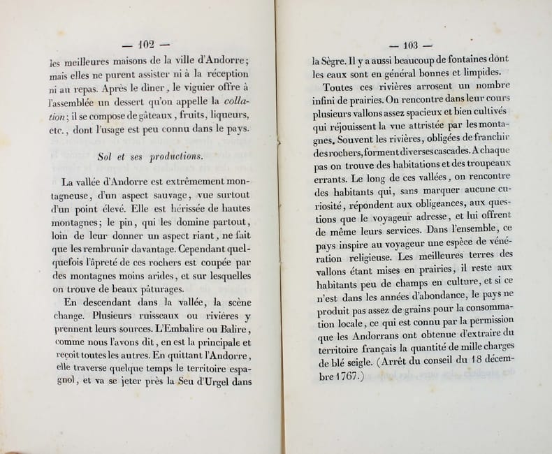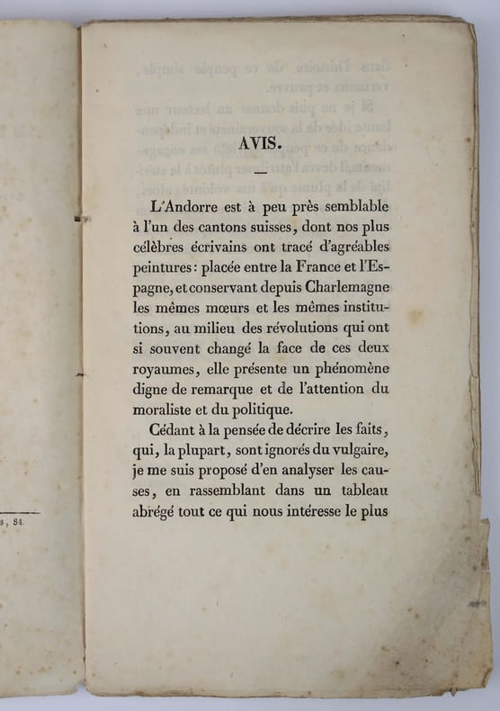 Premiére édition. Histoire, moeurs ("Les Andorrans sont en général robustes et bien portants; les femmes ont beaucoup de fraîcheur et de belles dents : c'est ce qu'on recherche généralement dans le sexe féminin."), gouvernement, justice, commerce : "Tout commerce est libre en Andorre. Il n'ya pas point de droit de douane ni droits quelconques sur les objets de commerce. Les Andorrans usent peu de cette liberté pour introduire la contrebande en France ou en Espagne, ce peuple étant essentiellement cultivateur et pasteur ou berger." "Je dirai aux bons Andorrans, dont je connais les vertus et le bonheur : heureuse ignorance ! (...) Méprisez le luxe et ses découvertes, qui ne peuvent convenir à votre pays." L'auteur était de Bourg-Madame. Le titre est bruni. Dendaletche 1663. Rare. Exemplaire cousu sur brochure, tel que paru. /// In-12 de 130 pp. Broché. ////
