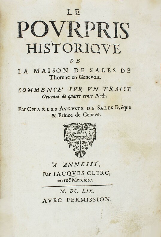 Première édition. Charles-Auguste de Sales était le neveu de Saint François de Sales. Il a été élu prince-évêque de Genève de 1645 à 1660. C'est donc ici l'histoire de sa famille, de grande importance pour l'histoire de la Savoie. Le pourpris, mot emprunté au vocabulaire de l'arpentage, était déjà désuet à l'époque où l'auteur écrit. Il veut dire tout le contenu, l'étendue. On trouve dans la marge de la page 377 une note manuscrite qui complète le texte. Elle a été masquée par une bande de papier que l'on peut soulever. Légères mouillures sur 5 feuillets de l'introduction, marge intérieure des deux premiers feuillets consolidée et aussi de la marge extérieure pour les deux derniers. Bon exemplaire de cette rareté bibliographique. /// In-4 de (12), 571, (13) pp. Basane brune, dos à nerfs orné, tranches rouges. (Reliure du XVIIIe.) //// First edition. Charles-Auguste de Sales was the nephew of Saint François de Sales. He was elected Prince-Bishop of Geneva from 1645 to 1660, so this is the story of his family, of great importance for the history of Savoy. "Pourpris", a word already obsolete at the time of the author's writing, means all the contents, the extent. A handwritten note in the margin of page 377 completes the text. It has been hidden by a strip of paper that can be lifted. Slight dampness on 5 leaves of the introduction, inner margin of the first two leaves consolidated and also of the outer margin for the last two. A good copy of this bibliographical rarity.