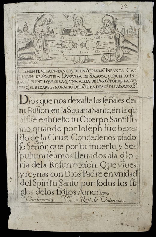 Image de dévotion à la Savana Santa ou Saint Suaire de Turin. Une indulgence en faveur d'une âme du purgatoire est attribuée pour chaque prière devant l'image du Saint Suaire de Turin. Clement VIII a été pape de 1592 à 1605. A la fin : "Con licencia, En el Regl. de Valencia." Aucun exemplaire trouvé dans les catalogues de bibliothèques. /// In-4 de 1 feuillet. (187 x 117 mm) //// Devotional image of the Savana Santa or Holy Shroud of Turin. An indulgence in favour of a soul in purgatory is given for each prayer before the image of the Holy Shroud of Turin. Clement VIII was Pope from 1592 to 1605. At the end: Con licencia, En el Regl. de Valencia. No copy found in library catalogues.