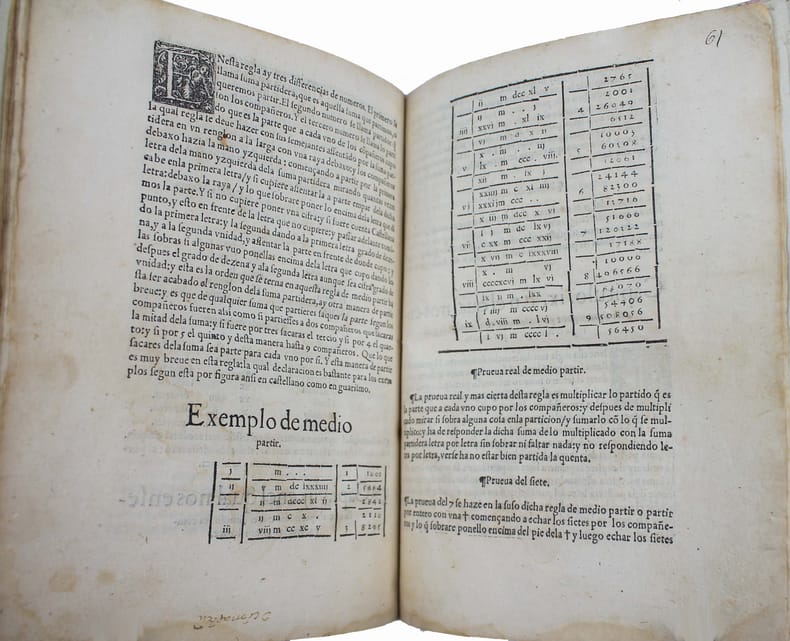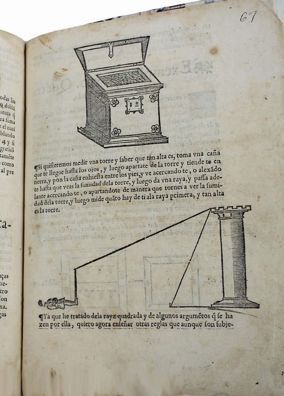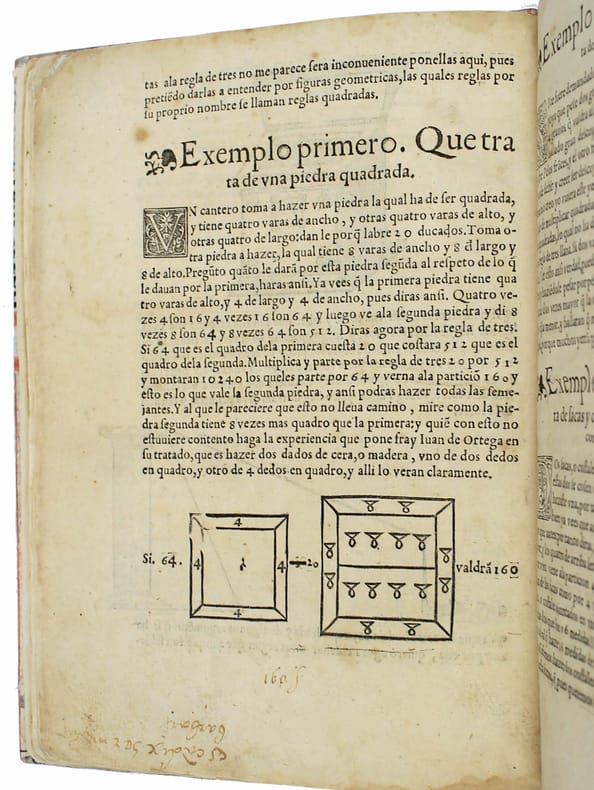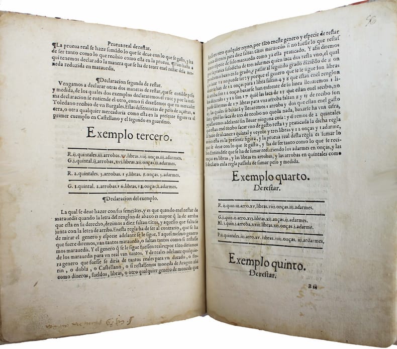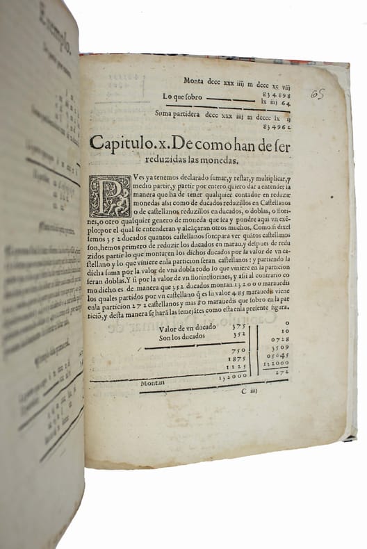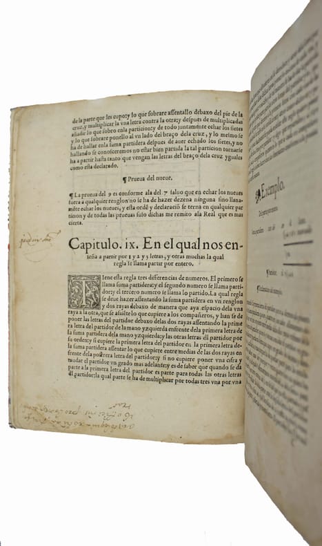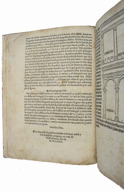 Cet "Art bref et très utile du calcul et de l'arithmétique en castillan" est un livre d'arithmétique commerciale. Il est un exemple de la transition des chiffres romains aux chiffres arabes, car il résout les problèmes en chiffres arabes (quenta aritmetica), mais donne son expression en chiffres romains (quenta castellana). Juan Gutiérrez de Gualda était prêtre d'un village de la province de Cuenca. Son livre d'arithmétique, publié pour la première fois à Tolède en 1539, a connu un grand succès et a été réimprimé plusieurs fois au XVIe siècle. C'est un livre d'usage, ainsi les exemplaires parvenus jusqu'à nous sont rares aujourd'hui. Illustré par 5 bois gravés à la fin. Portrait de Philippe II sur le titre. Quelques traces d'humidité dans les marges, plusieurs annotations de l'époque en bas de pages. Bon exemplaire. /// In-4 de (24) ff. Vélin. (Reliure de l'époque.) //// This 'Brief and very useful art of Castilian count and arithmetic' is a basic arithmetic for merchants. The book is an example of the transition from roman numerals to arabic numerals because it resolves the problems with arabics (quenta aritmetica), but it gives his expression in romans (quenta castellana). Juan Gutiérrez de Gualda was a priest of a village in Cuenca province. His book on arithmetic, first published in Toledo in 1539, was very successful and reprinted several times during the 16th c. It's a handbook, so surviving copies are rare today. Illustrated with 5 woodcuts at the end. Portrait of Philip II on the title. Some dampstain in the margins, contemporary annotations at the bottom of several pages. Fine copy. Palau 111617. USTC 336761 (gives 2 locations in US : Berkeley Univ. and Hispanic Society, NY)