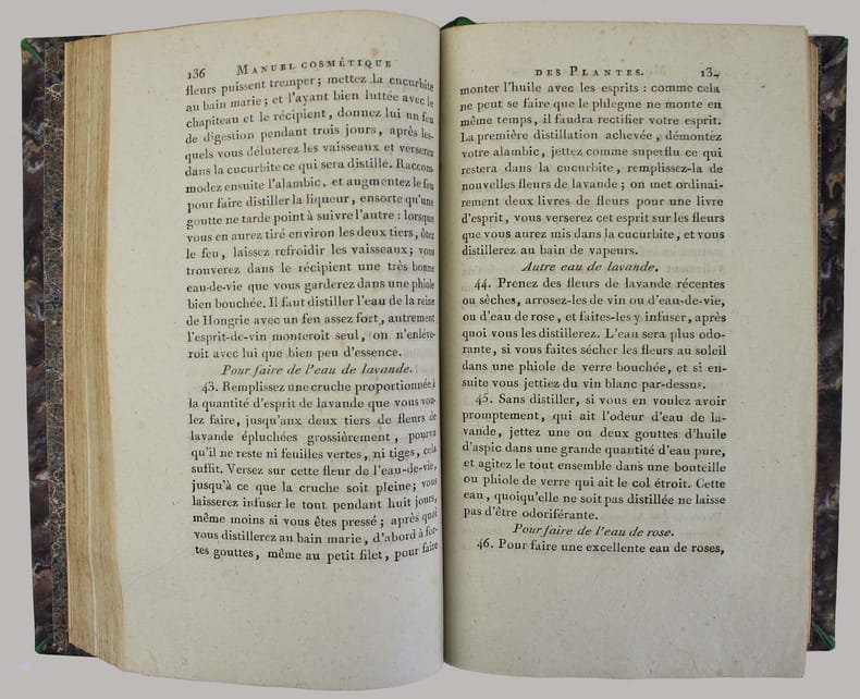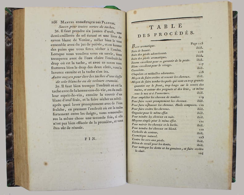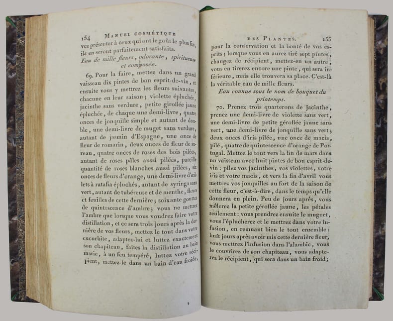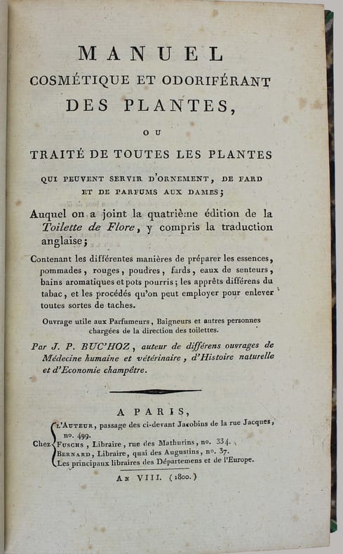 Première édition. Contient les différents manières de préparer les essences, pommades, rouges, poudres, fards, eaux de senteurs, bains aromatiques et pots pourris ; les apprêts différents du tabac, etc ... "Ouvrage utile aux parfumeurs, baigneurs et autres personnes chargées de la direction des toilettes." Pierre-Joseph Buc'hoz (1731-1807), médecin et naturaliste lorrain est l'auteur d'un très grand nombre d'ouvrages, la plupart sur l'histoire naturelle. On trouve parfois à la fin une liste des ouvrages de l'infatigable Buc'hoz, qu'il n'a pas été relié ici. Couleur du dos un peu passée. Bel exemplaire. /// In-8 de XVI, 278 pp. Demi-chagrin violet, dos orné. (Reliure de la seconde moitié du XIXe.) //// First edition. Contains different ways of preparing essences, ointments, reds, powders, blushes, 'eaux de senteurs', aromatic baths and 'pots pourris'; different ways of preparing tobacco, etc... A useful work for perfumers, bathers and other people in charge of toilet management. Pierre-Joseph Buc'hoz (1731-1807), physician and naturalist from Lorraine, is the author of a large number of works, most of them on natural history. A list of works by the indefatigable Buc'hoz is sometimes found at the end, but not bound here. Spine color a little faded. A fine copy.