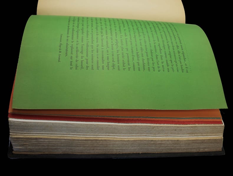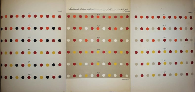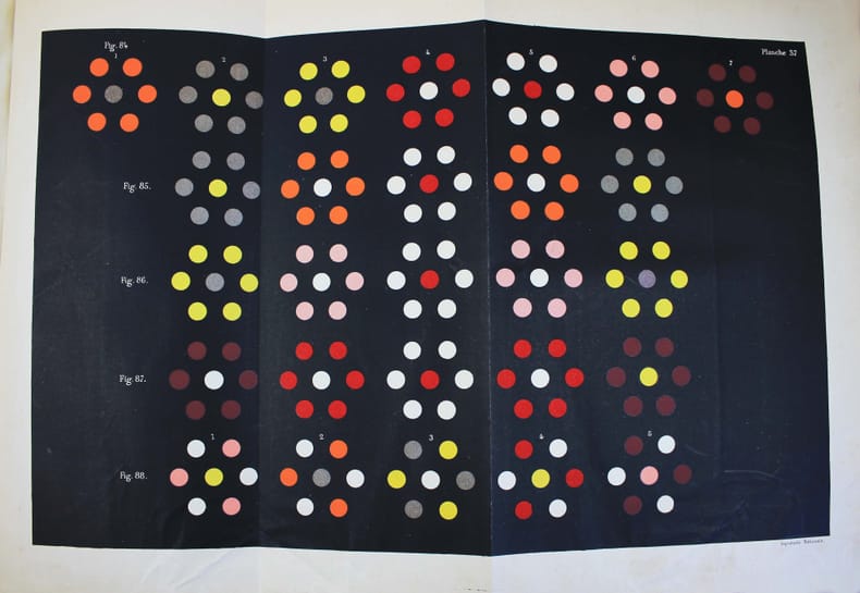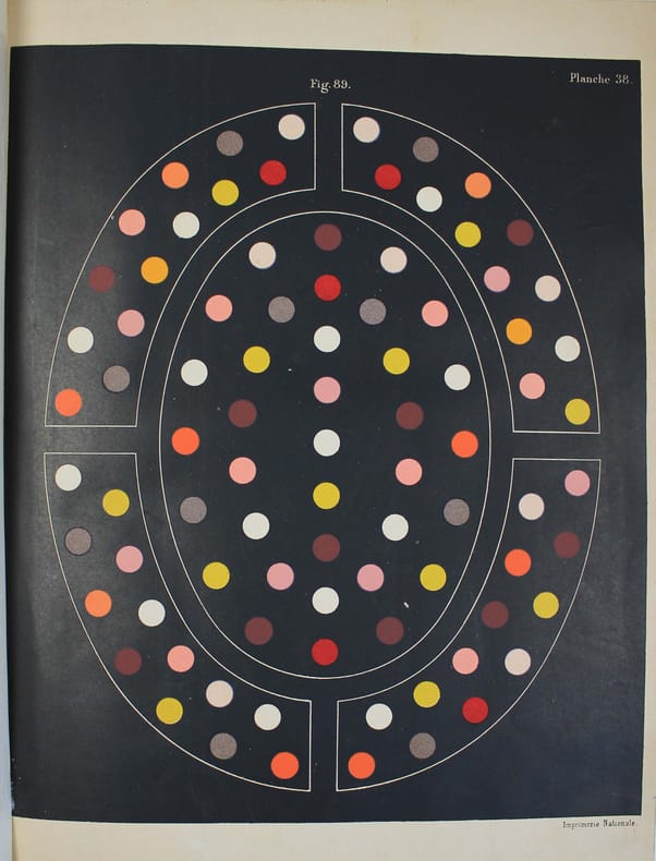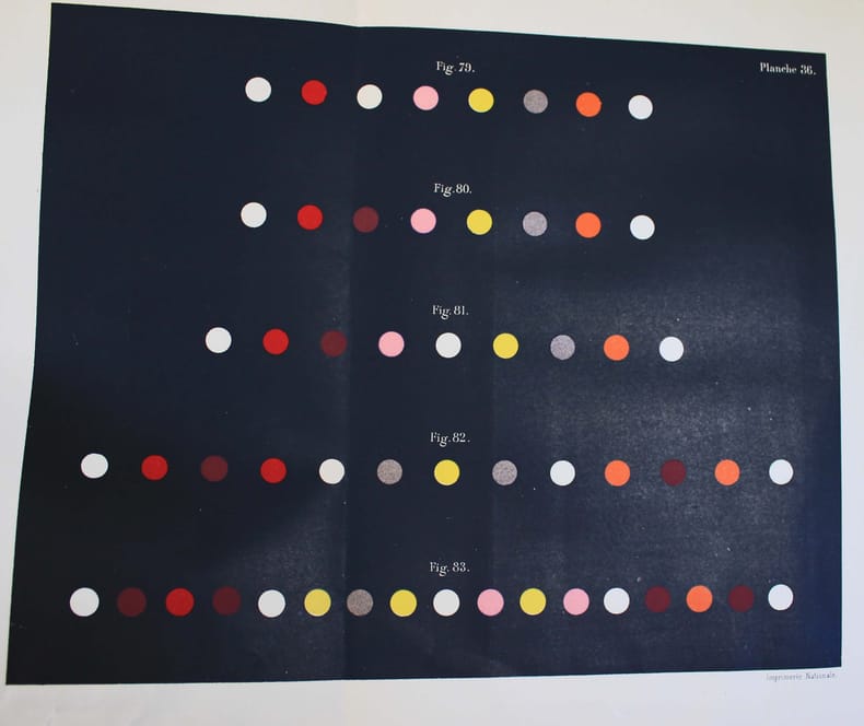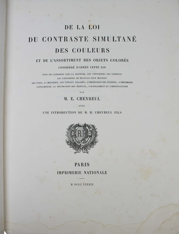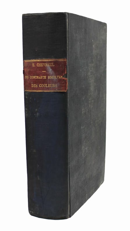 Seconde édition de ce célèbre ouvrage sur la théorie des couleurs, qui a profondément influencé les peintres impressionnistes. Elle a été revue par le fils de l'auteur, qui dans l'introduction rapporte la genèse des travaux de son père. Il découvrit les principes de cette loi alors qu'il assistait à l'Institut à une lecture de Mongez sur le passage d'Annibal des Alpes (!) A sa sortie, il en posa les termes à ses deux meilleurs amis, Ampère et Cuvier, "qui en furent émerveillés." Pour "ce monument que l'Imprimerie Nationale élève à la mémoire de Eugène Chevreul, il ne fallait ne recourir qu'à des couleurs minérales dont la stabilité fût certaine. Il a même été nécessaire d'en fabriquer quelques-unes qui, à cause de leur haut prix et de leurs applications industrielles limitées, ne se trouvaient pas dans le commerce." Traces d'humidité au bas des premiers feuillets de texte. Les planches sont, comme toujours, un peu brunies. /// Fort in-4 de (8), XVI, 571 pp., 2 tableaux dépl., 40 planches h.-t., 9 feuillets imprimés de différentes couleurs. Toile noire de l'époque. //// Second edition of this famous book on colors theory, which had a profound influence on the Impressionist painters. It has been revised by the author's son, who in the introduction relates the genesis of his father's work. He discovered the principles of this law while attending a reading by Mongez on Annibal's passage of the Alps at the Institut (!) On leaving the Institut, he put the terms to his two best friends, Ampère and Cuvier, who were amazed. For this monument that the Imprimerie Nationale is erecting in memory of Eugène Chevreul, it was necessary to use only mineral colors whose stability was certain. It was even necessary to manufacture some which, because of their high price and limited industrial applications, were not commercially available. Traces of damp at the bottom of the first few leaves. The plates are, as always, a little browned.