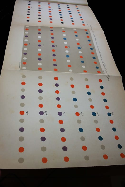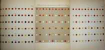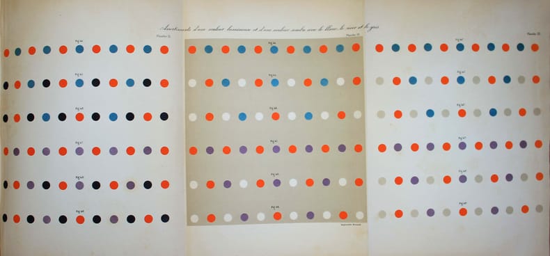 Edition originale et PREMIER TIRAGE : la plupart des planches en couleurs portent la signature autographe de Chevreul. Ouvrage capital de la théorie des couleurs, qui a profondément influencé les peintres néo-impressionnistes. Ils ont tiré leurs méthodes picturales des principes de Chevreul, appliquant des touches distinctes de couleurs pures sur la toile et laissant l'oeil de l'observateur les combiner. Ce livre est le fruit de sa découverte selon laquelle l'intensité et la vigueur apparentes des couleurs dépendaient moins de la pigmentation du support utilisé que de la teinte du tissu voisin. Après de nombreuses expériences sur le contraste des couleurs, Chevreul a formulé pour la première fois les principes généraux et les effets du contraste simultané, c'est-à-dire la modification de la teinte et du ton qui se produit lorsque des couleurs juxtaposées sont vues simultanément. Illustré par 3 planches en noir, dont deux dépliantes et une avec système; 37 planches en couleurs, certaines dépliantes. Puis 9 feuillets de texte imprimés sur des papiers de différentes couleurs. Il y a aussi deux tableaux dépliants dans le volume de texte. Rousseurs assez fortes au volume de texte, comme toujours, l'atlas en belle condition. En français dans le texte 237. /// Un volume in-8 et un volume in-4 de XV, (1), 735, (3) pp., 2 tableaux dépl. / (4) pp., 40 planches h.-t. , 9 ff. imprimés sur différentes couleurs. Demi-chagrin vert, dos orné de filets dorés, reliure de l'époque et cartonnage imprimé de l'éditeur, dos toile, pour l'atlas. //// First edition and FIRST ISSUE: most of the color plates have Chevreul's autograph signature. A seminal work on color theory that profoundly influenced the Neo-Impressionist painters. They drew their pictorial methods from Chevreul's principles, applying separate touches of pure colors to the canvas and allowing the eye of the observer to combine them. The book was the outcome of his discovery that the apparent intensity and vigor of colors depended less on the pigmentation of the material used than on the hue of the neighboring fabric. After many experiments on color contrast Chevreul formulated for the first time the general principles and effects of simultaneous contrast, the modification in hue and tone that occurs when juxtaposed colors are seen simultaneously. Contemporary half-chagrin for the text and editor boards for the atlas. Illustrated by 3 plain plates, 37 plates in colours and 9 folios printed in different colours. There are also two fold-out tables in the text volume. Chevreul's signature on most of the colors plates. Rather heavy foxing on the text volume, as always. Atlas in very good condition. Kemp, The Science of Art, pp. 306-07. /// PLUS DE PHOTOS SUR WWW.LATUDE.NET