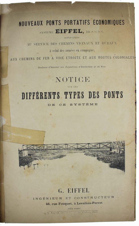 Première édition. Notice pour une activité aujourd'hui méconnue de Gustave Eiffel, la construction de ponts portatifs en acier, très simples de montage, (ils sont boulonnés et non pas rivetés), d'un poids très faible afin de pouvoir les poser directement sur les rives. On trouve à la fin une liste des principaux clients. De très nombreux ponts ont été montés en Indochine, dans les Hautes-Pyrénées, la Creuse, l'Allier, et aussi en Italie, à Bombay, à Porto Rico, au Japon... Illustré par un frontispice et 11 planches hors-texte. La première couverture avec petites déchirures et des morceaux de ruban adhésif. /// In-8 de (4), frontispice, 23 pp., 11 planches hors-texte. Cartonnage récent de papier marbré, couvertures imprimées conservées. //// First edition. Note for a today little-known activity of Gustave Eiffel, the construction of portable steel bridges, very simple to assemble (they are bolted rather than riveted), very light in weight so that they can be placed directly on the banks. A list of major customers can be found at the end. A large number of bridges were installed in Indochina, the Hautes-Pyrénées, Creuse and Allier, as well as in Italy, Bombay, Puerto Rico and Japan. Illustrated with a frontispiece and 11 plates. First cover with small tears and pieces of tape.