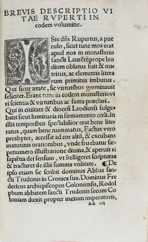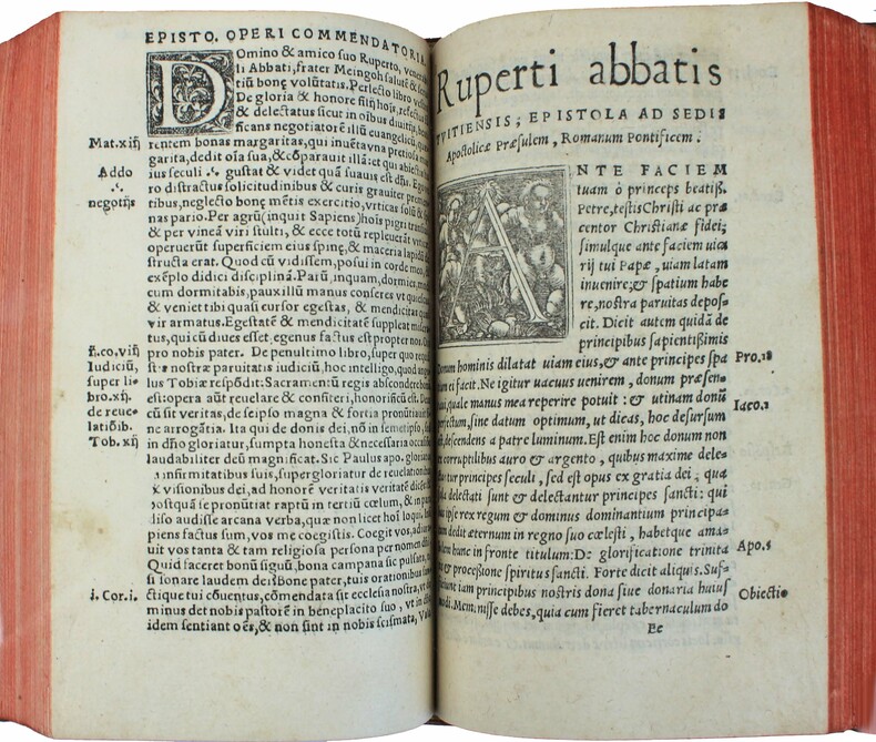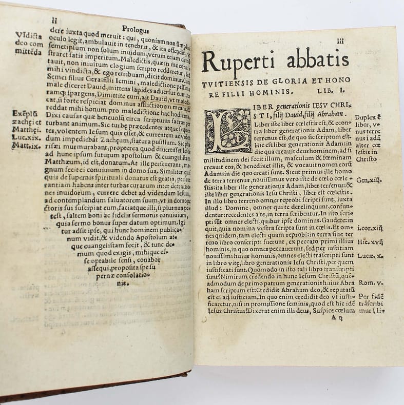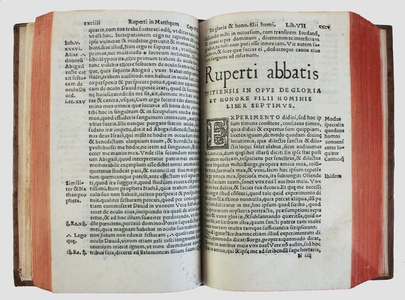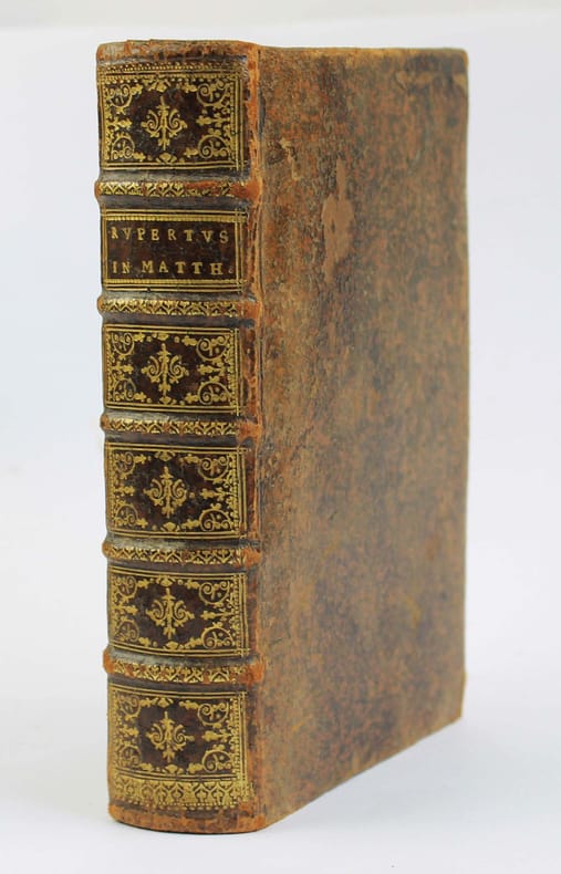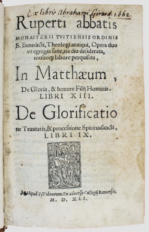 Rupert de Deutz, né à Liège au XIIe siècle, a été un influent théologien et exégète. Ces textes ont été imprimés pour la première fois en 1526, à Koln. Edition peu commune, partagée entre plusieurs libraires. On la trouve plus souvent sous le nom de Jean de Roigny ou de Vivant Gaultherot. Sur le titre Pierre Vidoue indique qu'il se trouve en face du collège de Reims. Belles initiales à fond criblé. Deux parties à pagination séparée. Exlibris manuscrit d'Abraham Girard 1662, qui a fait relier cet exemplaire. (Nous avons vu au moins deux reliures semblables portant son exlibris). On connait deux Abraham Girard au XVIIe siècle : certains disent qu'il s'agit de l'abbé commendataire de l'abbaye cistercienne de Chalivoy dans le diocèse de Bourges. D'autres, du premier secrétaire d'Henri II de Bourbon, prince de Condé, puis trésorier de France en Bourgogne. A vous de choisir... Bel exemplaire. USTC 195119 (Jean de Roigny) et 195118 (Vivant Gaultherot). /// In-8 de (24), 463, (25), 272 pp. Veau, dos à nerfs orné. (Reliure du XVIIe.) //// Rupert de Deutz, born in Liège in the 12th century, was an influential theologian and exegete. These texts were first printed in Koln in 1526. An uncommon edition, shared between several booksellers. It is more often found with the name of Jean de Roigny or Vivant Gaultherot. On title Pierre Vidoue states that he is in front of the college of Reims. Scribbled initials. Two parts with separate pagination. Handwritten exlibris of Abraham Girard 1662, who commissioned the binding. (We have seen at least two similar bindings with his exlibris). Two Abraham Girards are known from the 17th century: some say that he was the abbot commendatory of the Cistercian abbey of Chalivoy in the diocese of Bourges. Others, the first secretary of Henri II de Bourbon, prince of Condé, and then treasurer of France in Burgundy. Your choice... A fine copy. USTC 195119 (Jean de Roigny) and 195118 (Vivant Gaultherot).