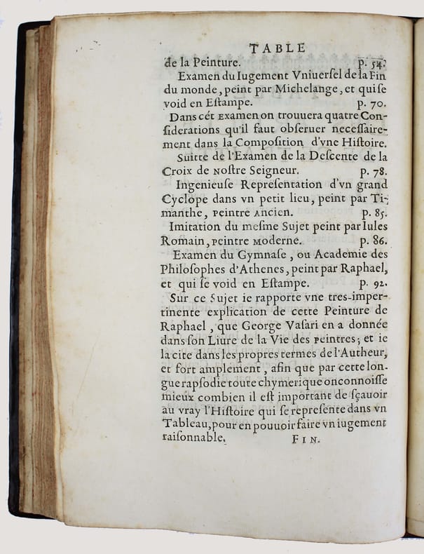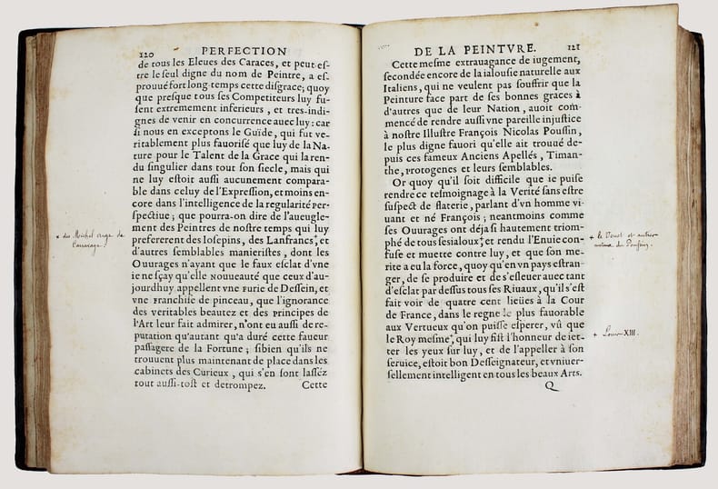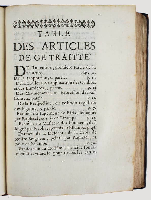 Première édition de ce texte fondamental de la théorie de l'art au XVIIe siècle. Roland Fréart de Chambray (1606-1674) entendait soumettre la peinture aux lois de la géométrie et aux règles de la démonstration mathématique. Une science rationnelle où pensée et géométrie l'emportent sur les sens. Il critiquait aussi bien les "techniciens" de la peinture que les "maniéristes" et estimait que l'on ne pouvait arriver à la beauté qu'en s'inspirant de l'Antique. Il était influencé par Poussin, avec qui il correspondait et qui était un ami intime de son frère, Fréart de Chantelou. Il a publié en 1651 une traduction du "Traité de peinture" de Léonard de Vinci, illustré d'après les dessins de Poussin. Relié à la suite : - La perspective d'Euclide, traduite en français sur le texte grec, original de l'autheur, et démontrée par Rol. Freart de Chantelou, sieur de Chambray. Le Mans, Jacques Ysambart, 1663. In-4 de (16), 128 pp. Première édition en français. "Un caprice particulier avait détaché cette perspective d'avec les autres ouvrages d'Euclide ce fameux géomètre pour la tenir supprimée près de deux mille ans. (...) c'est donc cette vieille nouveauté que le fameux nom d'Euclide m'a fait juger digne de trouver place dans le Louvre mesme, qui est maintenant une espèce d'Académie des plus beaux arts, et des sciences qui les produisent, dont la perspective est la principale base." Illustré par 44 gravures sur bois dans le texte. Provenance : Le bibliophile Victor Luzarche, selon un note manuscrite, n° 1479 du catalogue de sa vente en 1868. Reliure restaurée. Bel exemplaire. /// In-4 de (22), 134, (6) pp. Veau, dos à nerfs orné, tranches marbrées. (Reliure de l'époque.) //// First edition of this fundamental text of 17th-century art theory. Roland Fréart de Chambray (1606-1674) intended to subject painting to the laws of geometry and the rules of mathematical demonstration. A rational science where thought and geometry prevail over the senses. He criticized both the technicians of painting and the Mannerists, and believed that beauty could only be achieved by drawing inspiration from Antiquity. He was influenced by Poussin, with whom he corresponded and who was a close friend of his brother, Fréart de Chantelou. In 1651, he published a translation of Leonardo da Vinci's Traité de peinture, illustrated after Poussin's drawings. Bound after: - La perspective d'Euclide, traduite en français sur le texte grec, original de l'autheur, et démontrée par Rol. Freart de Chantelou, sieur de Chambray. Le Mans, Jacques Ysambart, 1663. 4to. (16), 128 pp. First edition in French. A particular caprice had detached this perspective from the other works of Euclid this famous geometer to keep it suppressed for nearly two thousand years. (...) it is therefore this old novelty that the famous name of Euclid has made me judge worthy of finding a place in the Louvre itself, which is now a kind of Academy of the most beautiful arts, and of the sciences that produce them, of which perspective is the principal basis. Illustrated with 44 woodcuts in text. Provenance: The bibliophile Victor Luzarche, according to a handwritten note, no. 1479 in the catalog of his sale in 1868. Binding restored. A fine copy. Kemp, The science of art p. 123.
