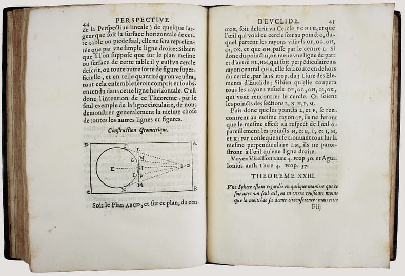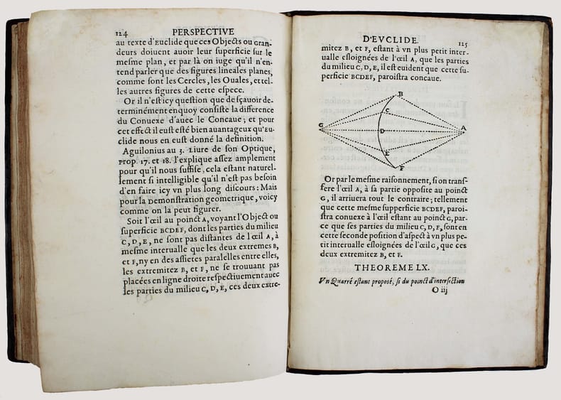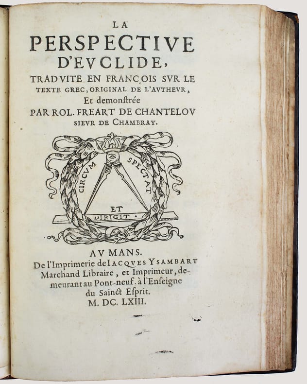 Précieuse réunion de deux textes complémentaires du critique d'art Roland Fréart de Chambray (Le Mans 1606-1674) proche de Nicolas Poussin avec lequel il correspondait, auteur de traités sur la peinture et l'architecture, traducteur de Palladio, Léonard de Vinci et Euclide ; il fut également chargé de travaux de fortifications militaires. 1. Édition originale de cet ouvrage fondamental qui pose les bases de la critique d'art en France. « L'Idée fut souvent considérée comme le premier traité théorique proprement dit de la peinture en France, les écrits précédents ou ceux de contemporains tels Hilaire Pader, Abraham Bosse, l’abbé de Marolles, Félibien ou encore Dufresnoy ne présentant pas ses qualités systématiques et doctrinales. Il est vrai qu’aucun autre avant Chambray n’avait poussé aussi loin le projet de jeter les fondements intellectuels de la peinture, d’établir ce qui est permanent et universel dans le flou de la création picturale, et de forger par là même des outils efficaces pour une critique des œuvres. » (Milovan Stanic, Université de Paris Sorbonne, Paris IV, 2012). 2. Première édition française établie par Roland Fréart de Chambray illustrée de 44 gravures sur bois dans le texte. « Cette édition ne contient pas la traduction proprement dite d'après le texte original, comme le prétend le titre, mais un commentaire des principales propositions de l'Optique d'après la recension de Théon » (M. Lecoarret, Les traductions françaises des oeuvres d'Euclide, in Revue d'Hist. des Sciences, 1957, p.47, n° 23).« Malgré son titre La perspective d’Euclide, traduite en français sur le texte grec, original de l’autheur, et demonstrée par Roland Fréart de Chantelou sieur de Chambray, l’ouvrage ne doit pas être considéré comme une contribution capitale de son auteur à la diffusion d’une œuvre d’Euclide. Il est d’abord un complément scientifique au système de jugement fondé sur la raison que Fréart de Chambray promouvait dans le domaine de l’art. Pour ce théoricien et grand admirateur des anciens, la clarté et la rigueur mathématique d’Euclide donnaient un modèle idéal pour construire rationnellement un corps de doctrine sur l’excellence artistique. Dans son Idée de la perfection de la peinture publiée un an plus tôt en 1662, il suivait déjà une démarche toute euclidienne en énonçant six axiomes d’une science « que les savants ont nommé l’optique, et que les peintres, et tous les dessinateurs appellent communément la perspective ». Cependant son ouvrage n’est pas une traduction de l’Optique (c’est-à-dire la Perspective ) d’Euclide, mais une réédition « de la Recension de Théon » comme le révèle Paul Ver Eecke qui ajoute que « rien dans la préface ni dans le corps de l’ouvrage n’indique qu’un texte grec ait servi de base ». Cette dernière opinion est contredite par Fréart qui mentionne : « le texte grec de mon exemplaire… » ou encore : « le manuscrit d’Euclide, d’où nous l’avons tiré… ». De fait, le texte de l’ Optique attribué à Euclide (IIIe siècle av. J.-C.) n’est parvenu à l’époque moderne que par bribes, au gré des copistes et des interprètes, et notamment par le truchement de Théon d’Alexandrie (seconde moitié du IVe siècle). Il ne serait pas étonnant que Fréart, comme la plupart des traducteurs avant lui, ait confondu de bonne foi une copie manuscrite de la Recension avec le texte original d’Euclide. » (Jean-Pierre Manceau, Centre d'Études Supérieures de la Renaissance Université François-Rabelais, Tours, 2012). Riccardi Biblio. Euclidea p.44 ; Sotheran I. n°7663 : « rare ».Provenance : François-Louis Chausson, seigneur de Courtilloles (ex-libris armorié « Du Cabinet de Monsieur le Président des Orgeries Escuier, Chevalier Seigneur de Courtilloles… » et Ernest-François–Louis de Courtilloles (ex-libris armorié qui porte la devise Non nobis Nascimur). Reliure restaurée.