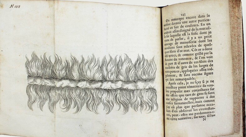Seule édition. Diverse études sur des phénomènes météorologiques extraordinaires. François Lamy, qui était un moine bénédictin s'efforce de trouver des explications rationnelles à tous ces phénomènes, en se démarquant des superstitions populaires. Sur l'origine et la nature d'une tornade observée dans le voisinage de Reims. Elle "jeta l'alarme et l'épouvante dans le coeur de presque tous ceux qui la virent de près et un jeune homme en fut tellement saisi de frayeur, qu'il en mourut en deux fois vingt-quatre heures." Cette étude est suivie des "Conjectures sur les merveilleux effets du tonnerre tombé à Lagni sur l'église de Saint-Sauveur" en 1689. Le tonnerre a imprimé sur la nappe de l'autel des phrases en latin. Mais l'auteur, rationnellement, en voit l'origine dans un carton imprimé qui était posé sur la nappe. Camille Flammarion dans les "Les Caprices de la foudre" examine longuement cet ouvrage : "Un religieux, le R. P. Lamy, de la Congrégation de Saint-Maur, a publié un excellent opuscule, dicté par le bon sens le plus clair, sur de curieux effets de la foudre, qui étaient alors le sujet des commentaires les plus superstitieux. Voltaire n'eût pas mieux raisonné. " Illustré par 5 gavures, dont une qui est dépliante et 2 à pleine page. Bon exemplaire. /// In-12 de (4), 241, (1) pp. Basane brune, dos à nerfs orné, tranches mouchetées. (Reliure de l'époque.) //// Only edition. Various studies on unusual meteorological phenomena. François Lamy, who was a Benedictine monk, strives to find rational explanations for all these phenomena, distancing himself from popular superstition. On the origin and nature of a tornado observed in the vicinity of Reims. It threw alarm and terror into the hearts of almost all those who saw it at close quarters, and one young man was so seized with fright by it, that he died in two times twenty-four hours. This is followed by Conjectures on the marvelous effects of the thunder that fell at Lagni on the church of Saint-Sauveur in 1689. The thunder impressed Latin phrases on the altar cloth. The author, however, rationally sees the origin in a printed card that was placed on the tablecloth. Illustrated with 5 engravings, one of which is folding and 2 full-page. Good copy. All copies in Worldcat outside France seem to be on line or reprint on demand. /// PLUS DE PHOTOS SUR WWW.LATUDE.NET