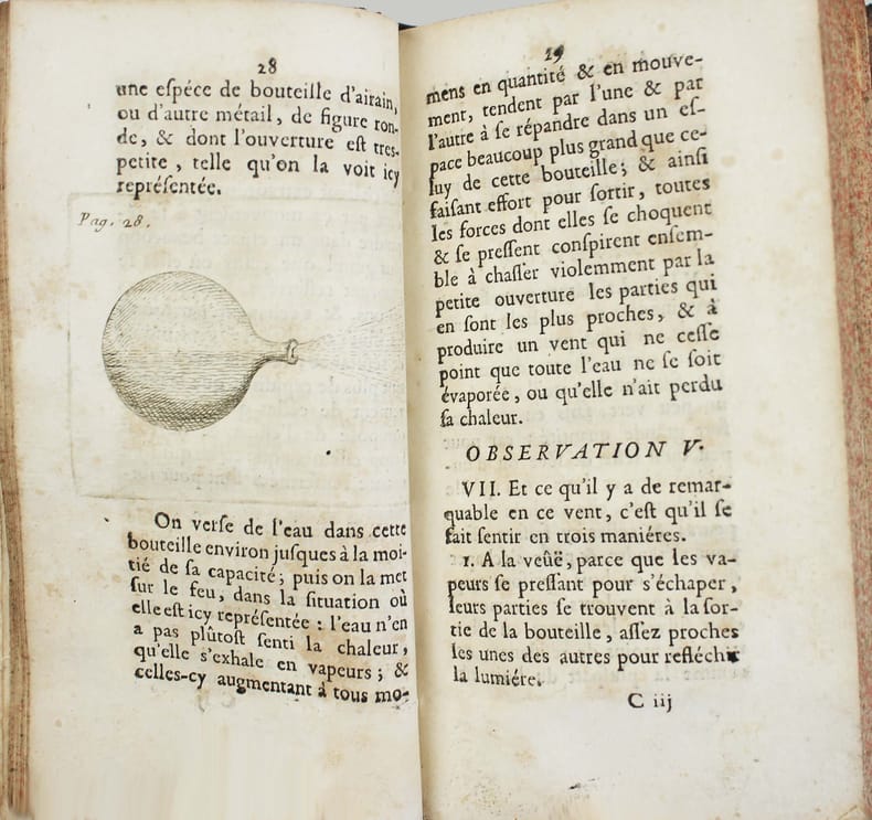 Seule édition. Diverse études sur des phénomènes météorologiques extraordinaires. François Lamy, qui était un moine bénédictin s'efforce de trouver des explications rationnelles à tous ces phénomènes, en se démarquant des superstitions populaires. Sur l'origine et la nature d'une tornade observée dans le voisinage de Reims. Elle "jeta l'alarme et l'épouvante dans le coeur de presque tous ceux qui la virent de près et un jeune homme en fut tellement saisi de frayeur, qu'il en mourut en deux fois vingt-quatre heures." Cette étude est suivie des "Conjectures sur les merveilleux effets du tonnerre tombé à Lagni sur l'église de Saint-Sauveur" en 1689. Le tonnerre a imprimé sur la nappe de l'autel des phrases en latin. Mais l'auteur, rationnellement, en voit l'origine dans un carton imprimé qui était posé sur la nappe. Camille Flammarion dans les "Les Caprices de la foudre" examine longuement cet ouvrage : "Un religieux, le R. P. Lamy, de la Congrégation de Saint-Maur, a publié un excellent opuscule, dicté par le bon sens le plus clair, sur de curieux effets de la foudre, qui étaient alors le sujet des commentaires les plus superstitieux. Voltaire n'eût pas mieux raisonné. " Illustré par 5 gavures, dont une qui est dépliante et 2 à pleine page. Bon exemplaire. /// In-12 de (4), 241, (1) pp. Basane brune, dos à nerfs orné, tranches mouchetées. (Reliure de l'époque.) //// Only edition. Various studies on unusual meteorological phenomena. François Lamy, who was a Benedictine monk, strives to find rational explanations for all these phenomena, distancing himself from popular superstition. On the origin and nature of a tornado observed in the vicinity of Reims. It threw alarm and terror into the hearts of almost all those who saw it at close quarters, and one young man was so seized with fright by it, that he died in two times twenty-four hours. This is followed by Conjectures on the marvelous effects of the thunder that fell at Lagni on the church of Saint-Sauveur in 1689. The thunder impressed Latin phrases on the altar cloth. The author, however, rationally sees the origin in a printed card that was placed on the tablecloth. Illustrated with 5 engravings, one of which is folding and 2 full-page. Good copy. All copies in Worldcat outside France seem to be on line or reprint on demand.