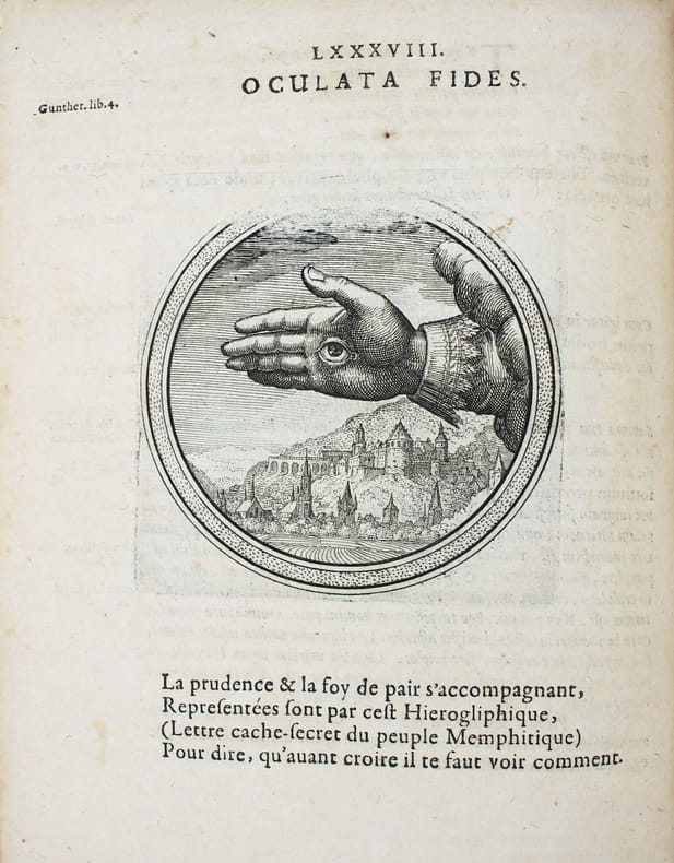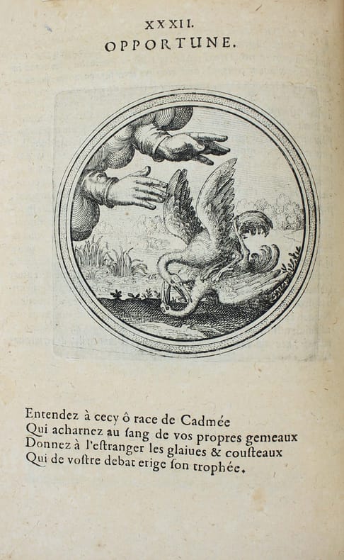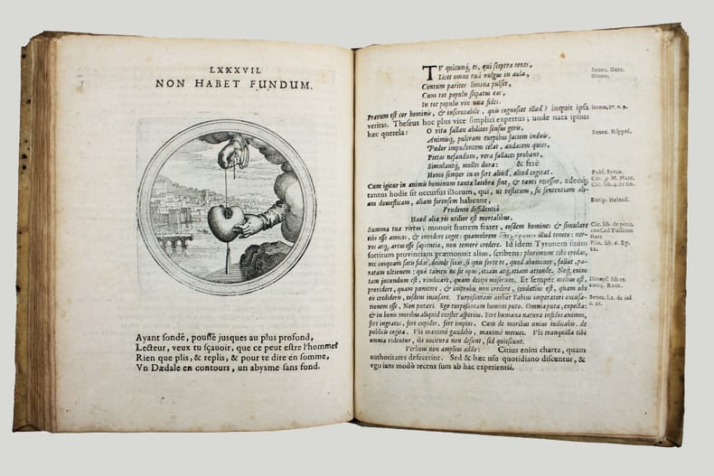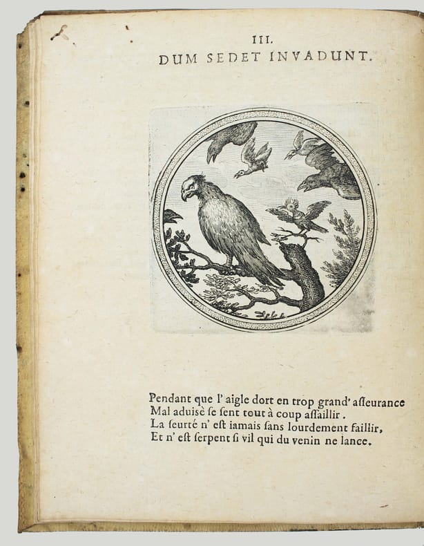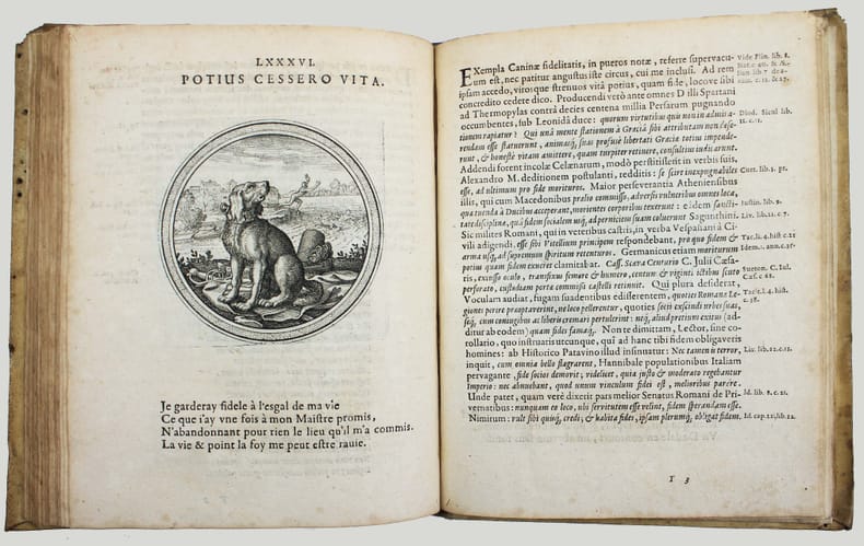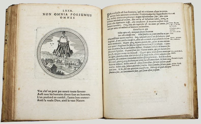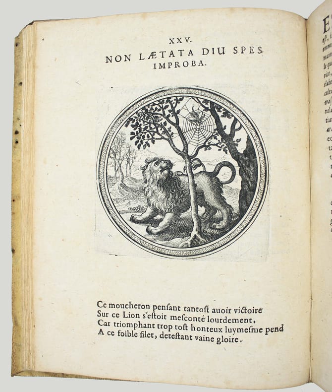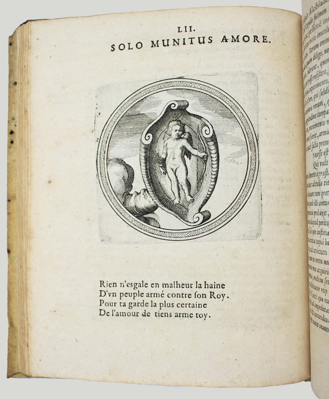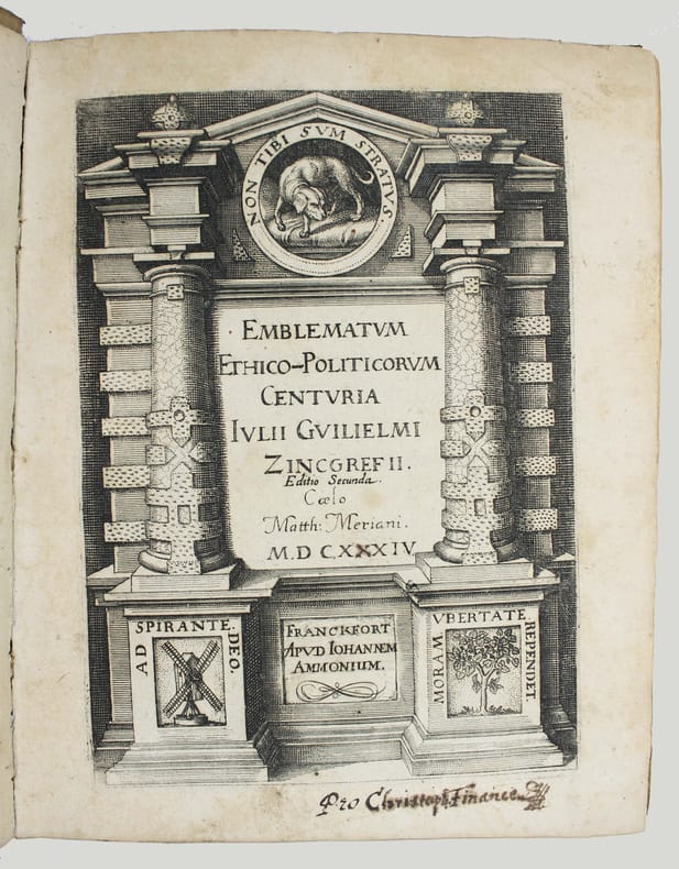 Première édition. Rare. Ce beau livre d'emblèmes comprend un titre gravé et 100 gravures de Matthaüs Mérian. Ce graveur suisse avait été l'élève de Jacques Callot et épousa la fille de Theodor de Bry. Chaque emblème est accompagné d'un quatrain en français. Le texte de Julius Wilhelm Zincgref (1591-1635) se trouve en regard. Sa préface traite de l'origine et de l'usage des emblèmes. Provenances : Christophe Finance (signature contemporaine sur le titre). Cette édition est strictement identique à la première de 1619. Pour une raison obscure une plume a anciennement ajouté un X à la date, mais il s'agit bien de l'édition de 1624. Papier un peu bruni, très fin travail de vers dans la marge sur une quinzaine de feuillets en début d'ouvrage et une dizaine vers la fin, mais très bon exemplaire, frais. /// In-4 de (8), 100, (2) ff. [A-Z4, Aa-Bb4, Cc2] Vélin. (Reliure de l'époque.) //// First edition. Rare. This beautiful book of emblems includes an engraved title page and 100 engravings by Matthaüs Mérian. This Swiss engraver was a pupil of Jacques Callot and married the daughter of Theodor de Bry. Each emblem is accompanied by a quatrain in French. The text by Julius Wilhelm Zincgref (1591-1635) faces the illustrations. His preface discusses the origin and use of emblems. Provenance: Christophe Finance (contemporary signature on the title page). This edition is identical to the first edition of 1619. For some unknown reason, a pen has added an X to the date, but this is indeed the 1624 edition. The paper is slightly browned, with very fine worm damage in the margin on about fifteen pages at the beginning of the book and about ten towards the end, but it is a very good copy, fresh. USTC 2097928. Landwer, Romanic emblem books 785. /// PLUS DE PHOTOS SUR WWW.LATUDE.NET