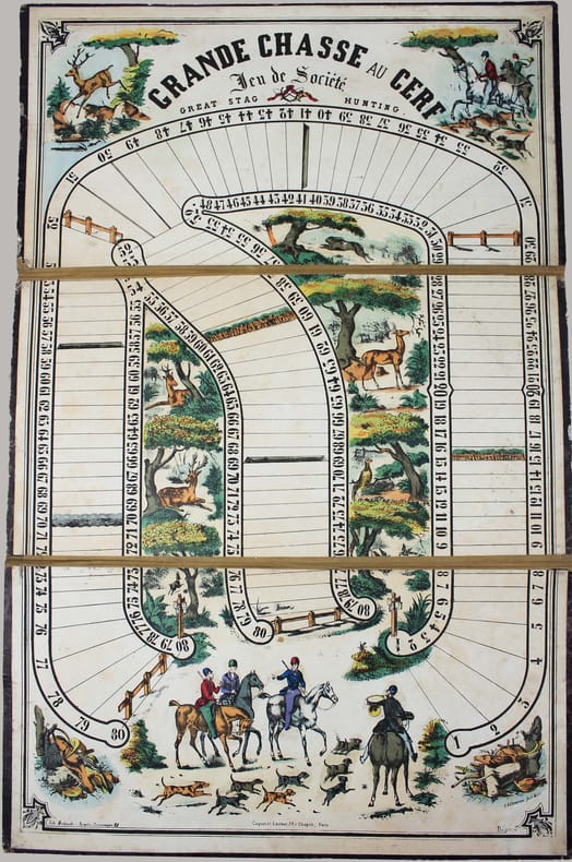 Charmant jeu de l'oie sur le thème de la chasse à courre. Une grande lithographie en couleurs montée sur carton fort qui se déplie en trois parties. Elle a été lithographiée par Pierre Destouches, actif de 1853 à 1869 et éditée par Coquerel. Les dessins sont de L. Villeneuve. "Le jeu du Cerf prit naissance sous le second Empire au moment où les grandes chasses à courre, dans la forêt de Fontainebleau, furent mises à la mode." (Grand-Carteret, Vieux papiers, vieilles images p. 276). Le dos du catonnage légèrement frotté. Bel exemplaire. Dimension : 55 x 36 cm. /// In-folio de ////