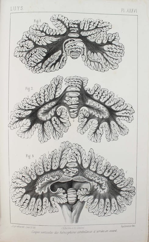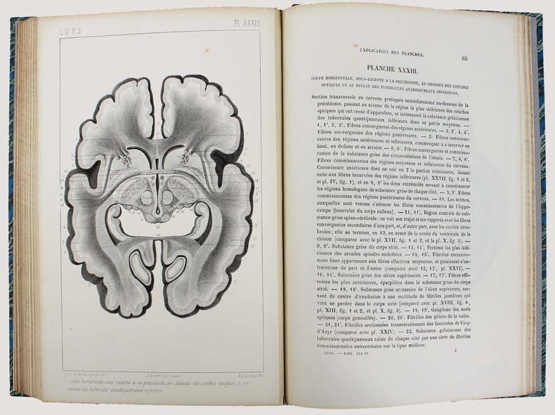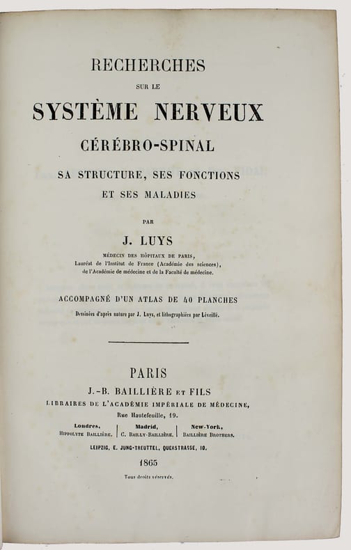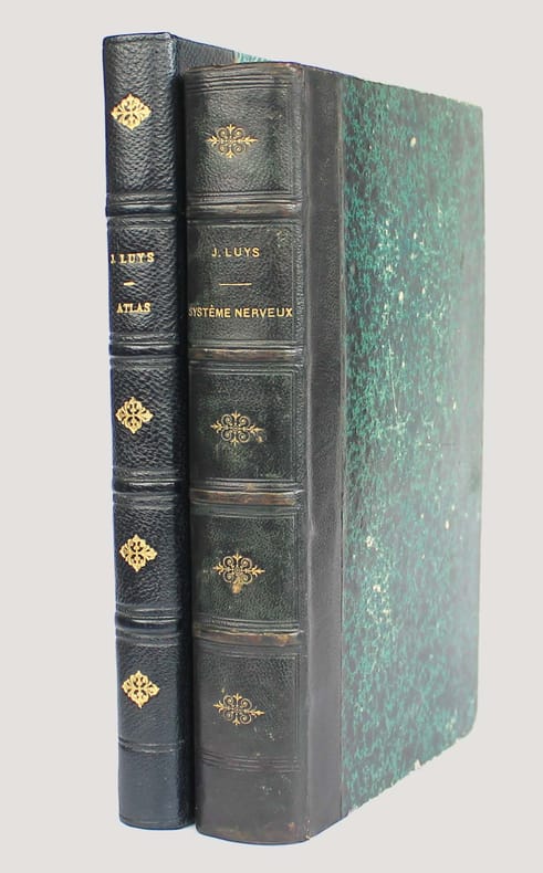 ATLAS SEUL. Première édition. Un des ouvrages de neurologie parmi les plus importants du XIXe. Luys y décrit les deux régions du thalamus qui portent aujourd'hui son nom. Illustré par 40 planches lithographiées hors-texte.First edition. A rare copy with all the plates in contemporary colors. "The beginning of the knowledge of the thalami function. This work contains Luy's descriptions of the two structures with bear his name: the subthalamic nucleus and the centre median of the thalamus." Garrison-Morton 1402. Heirs of Hippocrates 1036. Le premier plat du cartonnage est gondolé, première charnière fendue sur 10 cm. /// In-8 de (4), 80 pp., 40 planches h.-t. Cartonnage imprimé de l'éditeur pour l'atlas, dos en percaline. //// Atlas only. First edition. With engraved 40 plates. "The beginning of the knowledge of the thalami function. This work contains Luy's descriptions of the two structures with bear his name: the subthalamic nucleus and the centre median of the thalamus." Garrison-Morton 1402. Heirs of Hippocrates 1036. The first board is warped, first hinge cracked over 10 cm.
