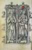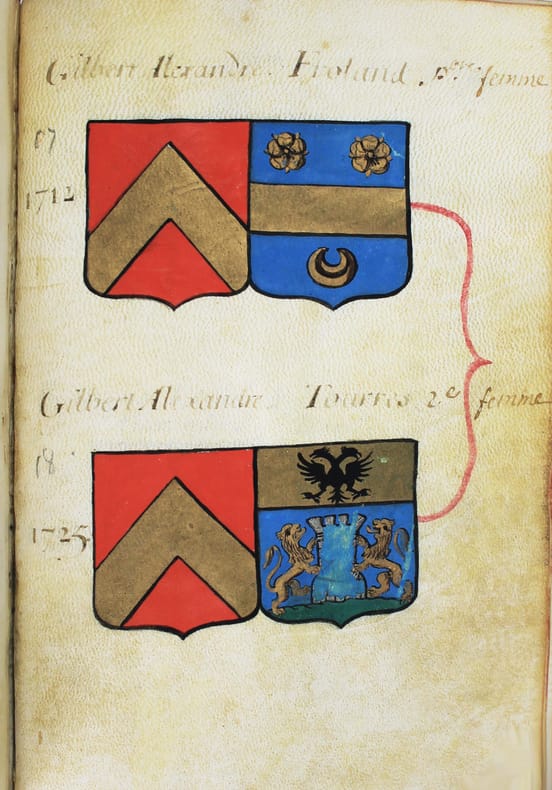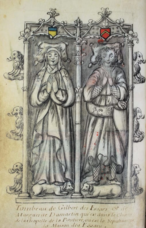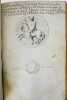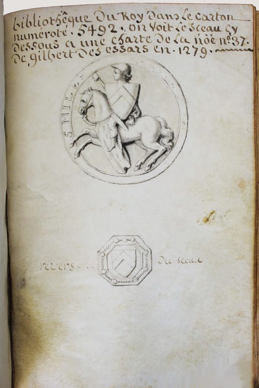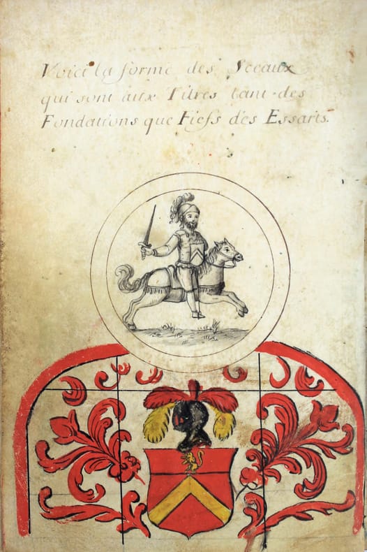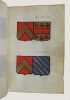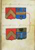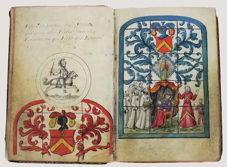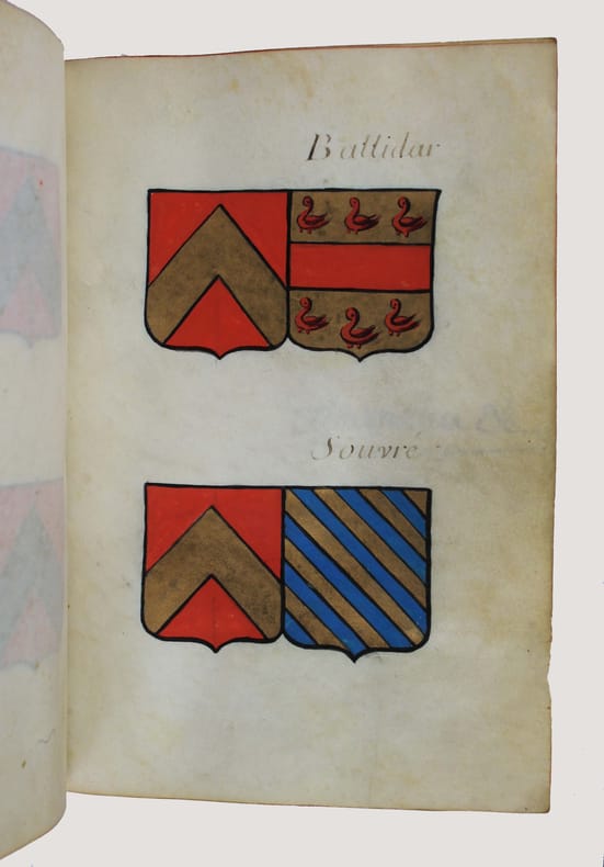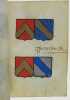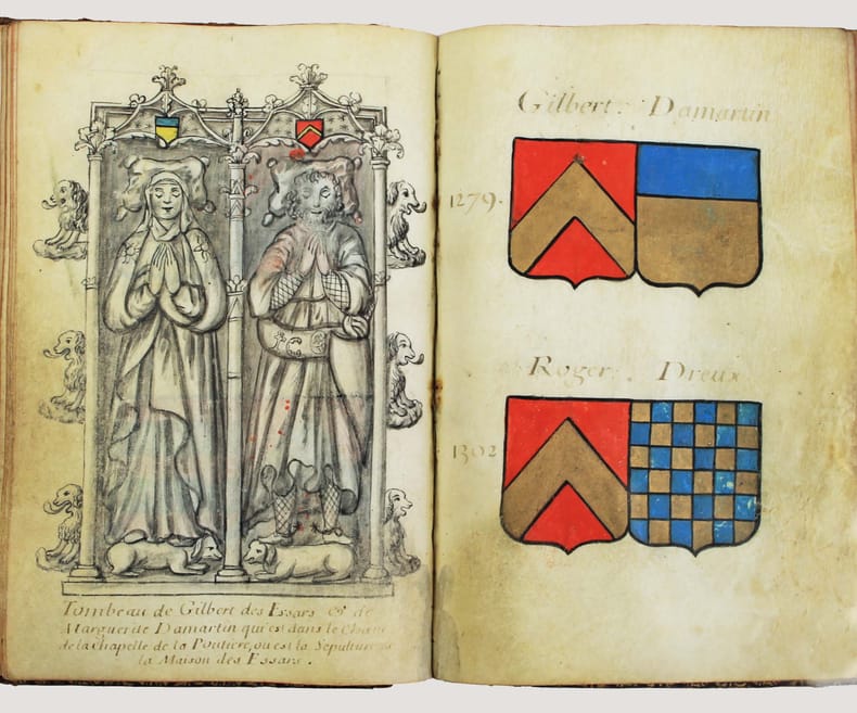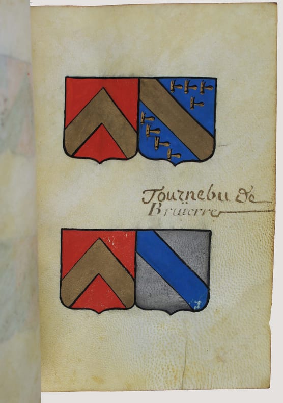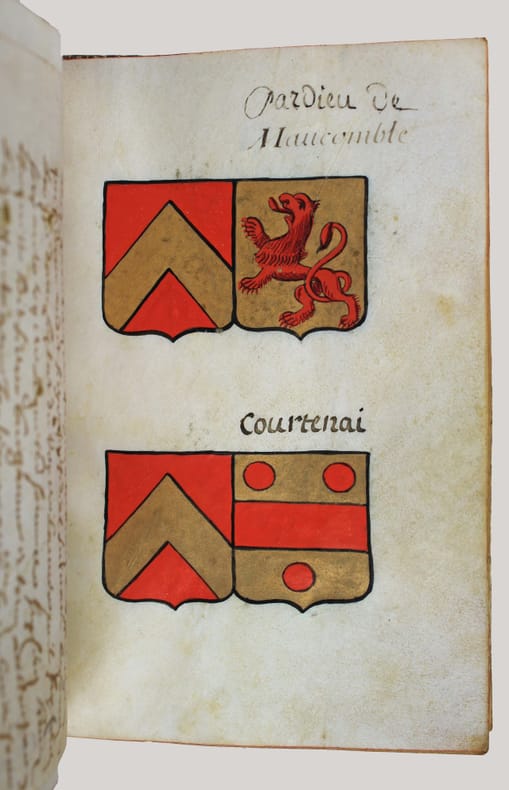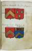Manuscrit sur peau de vélin retraçant par l'héraldique, la généalogie des Des Essarts, vieille famille de Normandie, qui devint à partir de 1350, Lombelon des Essarts. On y voit la reproduction du blason de chaque famille alliée : 40 blasons peints, à raison de deux par page. Et aussi 5 feuillets peints à pleine page : "Forme des sceaux qui sont aux titres tant des fondations que fiefs des Essarts", un feuillet peint montrant un des Essarts à côté du roi de France (Saint-Louis ?], un blason des Essarts à pleine page , le "tombeau de Gilbert des Essarts et de Marguerite Damartin qui est dans la chasse de la chapelle de la Poutiere, où est la sépulture de la maison des Essarts" [aujourd'hui disparue, Prieuré de la Poultière, Eure]. "Bibliothèque du Roy dans le carton numéroté 5492. On voit le sceau ci-dessous à une charte de la noë n°37 de Gilbert des Essarts en 1279." Les familles alliées que l'on trouve dans la série de blasons : Béthune. Catterandy. Plessis Richelieu. Battidar. Souvre. Tournebu de Bruïerre. Pardieu de Maucomble. Courtenai. Damanssi. Dinneville. Toneville. Tilly. Breançon. Maillemain. Roger [des Essarts] _ Ponthievre. Roger _ Harcourt. 1279. Gilbert _ Damartin. 1302. Roger _ Dreux. 1320. Jean_Daunou. 1350. Jean de Lombelon _ Agnès des Essarts.1383. Robert _ Bailleul. 1405. Jean _ Sailly. 1433 Gille_ Saint Aubin. 1485. Jean _ Breville. 1512. François _ Destin. 1540. Jean _ Canonville. 1570. Esme _ Brunaulieu. 1591. Louis _ Vieuxpont. 1609. Alexandre _ St. Aignen. 1637. Tenneguy _ Bellocier. 1679. Pierre-François _ Limoges. 1695. idem _ Le Franc. 1712. Gilbert Alexandre _ Froland. 1725. idem _ Tourres. 1734. Gilbert Alexandre _ Le Jau. 1735. François Louis Alexandre _ Jehannot de Bartillat. Manuscrit probablement rédigé par (ou pour) le dernier qui y figure : François Louis Alexandre de Lombelon, marquis des Essarts et d'Avrilly, seigneur de Contray, marié en 1735 avec Marie Anne Jehannot de Bartillat et mort vers 1760. Reliure usée mais solide. Beau document, unique. /// In-12 (15 x 10,3 cm) de (24) ff., (6) ff. blancs. Veau brun, dos à nerfs orné. (Reliure de l'époque.) ////