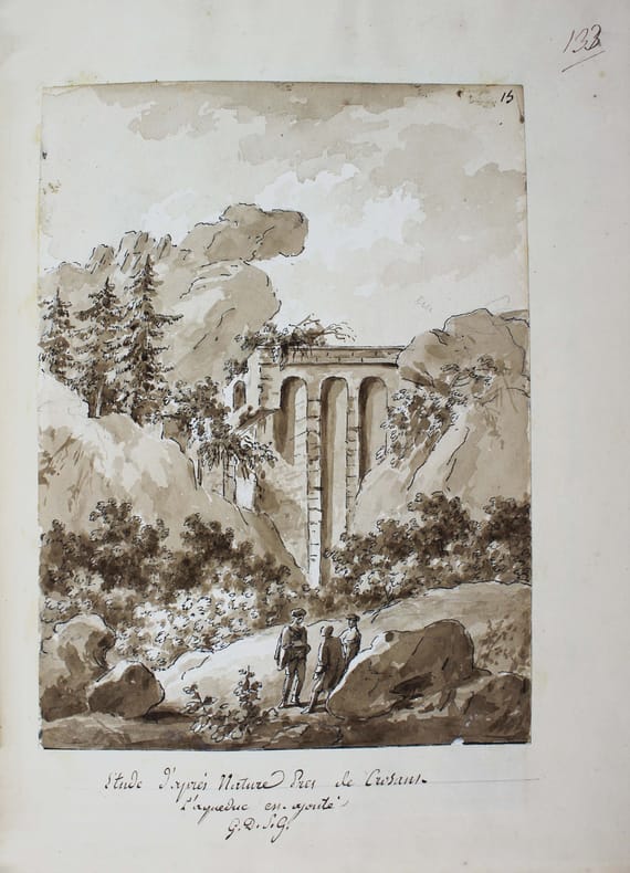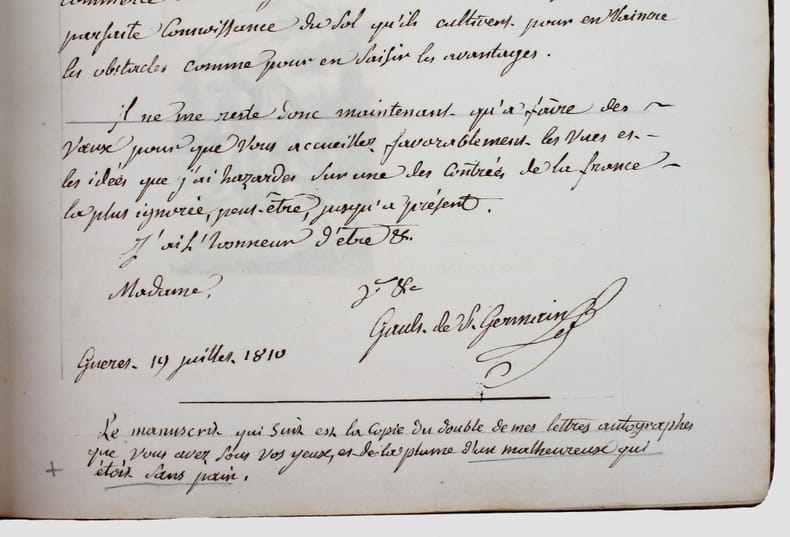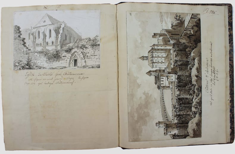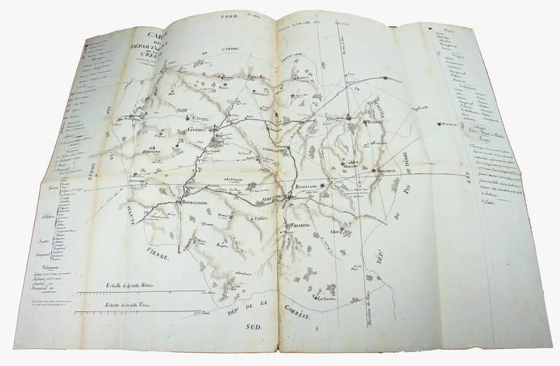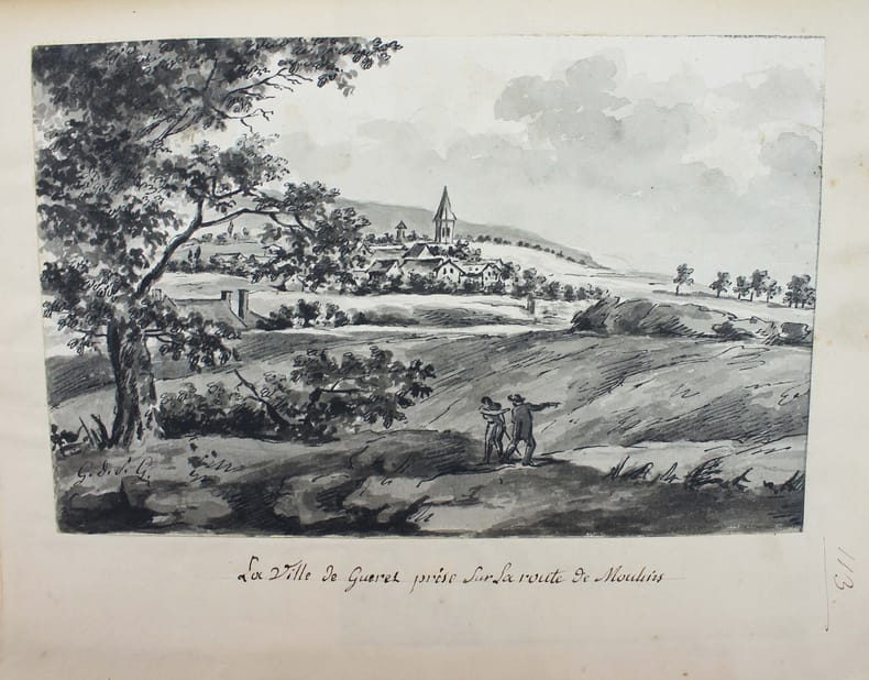 L'un des premiers, si ce nest le tout premier, ouvrage encyclopédique sur la Creuse, cette ancienne province de la Marche, plongée, d'après Gault de Saint-Germain, dans l'apathie depuis des siècles (p. 69). Manuscrit publié très partiellement sous le titre de "Lettres inédites sur la géographie, la physique, la topographie, l'histoire naturelle, les antiquités et les hommes illustres de la ci-devant province de Marche, écrites en 1809 et 1810", publié à Clermont-Ferrand chez A. Veysset, en 1861, in- 12 de 68 pp. Richement illustré de quatorze dessins et une carte autographe de grand format, tous originaux de la main de Gault de Saint-Germain, un portrait de l'auteur lithographié par Rouargue, quatre estampes collées, et diverses coupures de presses sur les intempéries collées sur les premières gardes. Le manuscrit présente quelques ratures et biffures, ainsi que des annotations marginales de l'auteur. "Chercheur acharné, historien avisé et passionné des arts" d'après Camilla Murgia, Pierre-Marie Gault de Saint-Germain mena de front une carrière de peintre, d'écrivain et de professeur. Elève de Durameau, Louis XVI lui avait acheté en 1789 "Vue du Port et de la rade de Moka", et de 1791 à 1801, "il exposa au Salon de bons paysages" (Bénézit) ; il publia un assez grand nombre d'écrits sur le dessin et la gravure, a donné des articles au Journal des Beaux-Arts et à beaucoup de périodiques tout en rédigeant une "Vie et oeuvres de Nicolas Poussin" et publiant une nouvelle édition des "Lettres" de Madame de Sévigné ; enfin, ayant fui Paris sous la Terreur pour se réfugier à Clermont-Ferrand, il y enseigna le dessin à l'Ecole centrale de 1792 à 1794, fût conservateur des monuments historiques du département du Puy-de-Dôme de 1794 à 1796, et après un retour à Paris dès 1797, partit enseigner le dessin à Guéret de 1809 à 1810, séjour durant lequel il rédigea notre manuscrit, une description exhaustive de la Creuse, sous forme épistolaire fort à la mode, dans l'esprit de l'Encyclopédie. d'une grande érudition, émaillées de réflexions pertinentes et de citations, ces lettres, fort vivantes, adressées à Madame xxx [Madame Beaulaton, dont il avait fait le portrait au pastel vers 1792, femme d'un juge membre de l'Académie de Clermont- Ferrand] se lisent avec intérêt, illustrées de gravures et de délicats lavis que l'auteur avait soigneusement réalisés dans son carnet lors de ses pérégrinations (Guéret, Jouillat, Aubusson, Bourganeuf, Châteauneuf, flacons, cuiller, costumes, paysages ou scènes de genre), achevant son ouvrage par la magnifique grande carte dépliante de la Creuse quil a dessinée à la plume et au lavis, représentant minutieusement villes antiques, sépultures, châteaux, monastères, abbayes et prieurés, ainsi que les voies romaines et les ressources minéralogiques, avec, dans la marge, la liste et la localisation des tribunaux, prisons, hospices, gendarmerie, collèges et ponts. Notre manuscrit est celui auquel G. Grange fait référence dans sa note liminaire à l'édition des "Lettres inédites sur la géographie, la physique, la topographie, l'histoire naturelle, les antiquités et les hommes illustres de la ci- devant province de Marche", écrites en 1809 et 1810 de 1861. "Dans un premier volume écrit sur l'Auvergne, [], cet auteur annonçait, comme complément de son ouvrage, une seconde partie traitant de l'histoire de la Marche, avec quelques dessins faits par lui, d'après nature. Quelques recherches que nous ayons faites jusquà ce jour, il nous a été impossible de découvrir ce manuscrit. Cest donc pour conserver aux amateurs ce curieux document, (dont nous regrettons vivement les planches), que nous publions ce quil nous en reste." En fait, seules les lettres II et III (pp. 9 à 21) de notre manuscrit sont éditées (pp. 6 à 35), sans de nombreuses notes du manuscrit, et avec quelques paragraphes retranchés (pp. 32 et 33 du ms) ou ajoutés (pp. 34 et 35 de l'imprimé). En outre, la 1ère lettre de l'imprimé, du 18 novembre 1809, ne figure pas dans le manuscrit ; elle cite des éléments et quelques détails tels auberges, manufactures, patois, pont du Diable ou costumes, empruntés aux p. 55 à 58 du manuscrit. Bien entendu, les dessins originaux sont restés inédits. La 1ère lettre, non paginée, adressée de Guéret, le 19 juillet 1810, sert d'introduction : "Le manuscrit qui suit est la copie du double de mes lettres autographes que vous avez sous vos yeux, et de la plume d'un malheureux qui était sans pain". l'auteur y rappelle les grandes lignes de son ouvrage : malgré l'obscurité politique du département, la tristesse et la monotonie de ses montagnes peu attrayante, son peu d'intérêt historique, la Creuse "a comme tout autre ses richesses territoriales ; [ce département] a ses montagnes, ses carrières, ses mines, ses pâturages, ses bestiaux ; il a ses plantes, ses étangs, ses rivières, ses poissons, ses animaux, ses volatiles, ses insectes particuliers ; il a aussi ses sujets remarquables dans la nécrologie des indigènes. Sa population y est considérable pour l'étendu de son territoire. Les habitants y sont portés au commerce et à l'agriculture et il ne leur manque quune parfaite connaissance du sol quils cultivent pour en vaincre les obstacles comme pour en saisir les avantages." Il fait donc des voeux "pour que vous accueillez favorablement les vues et les idées que jai hasardés sur une des contrées de la France la plus ignorée, peut-être, jusquà présent." La pagination a été revue vraisemblablement par l'auteur, la précédente biffée, avant de confier son manuscrit au relieur dont le couteau a rogné certaines de ces nouvelles paginations. Le texte manuscrit est passé de 160 à 104 pp., auquel l'auteur a ajouté les notes et les illustrations. La continuité du manuscrit nest pas affectée, bien que les lettres V à VII indiquées dans la Table aient é