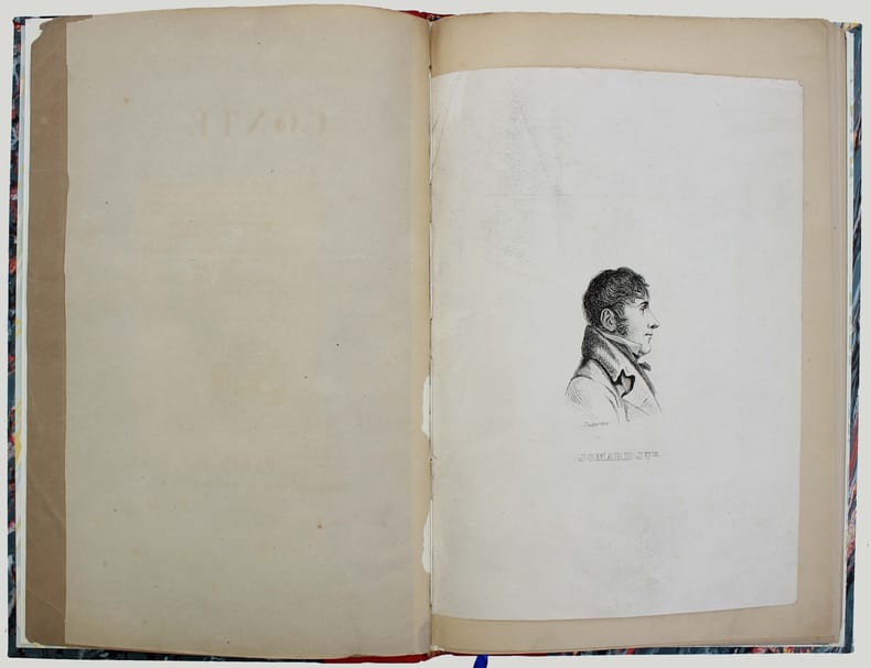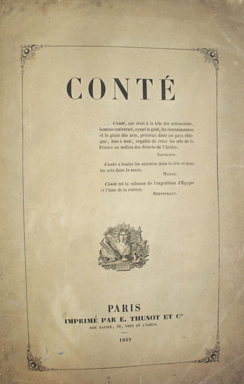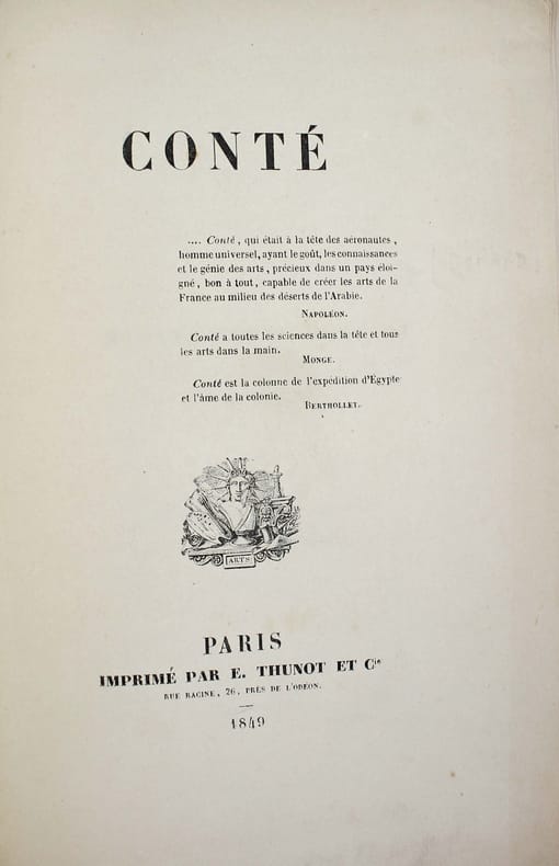 Première édition. Une biographie de Nicolas-Jacques Conté (1755-1805), dessinateur et inventeur de génie. Il eut l'idée de mélanger du graphite avec de l'argile, de passer au four ce mélange et de l'enfermer entre deux demi-cylindres de bois, obtenant le crayon qui porte aujourd'hui son nom. Il a été un des premiers expérimentateurs de l'hydrogène (il perdit un oeil lors d'une expérience), s'est intéressé aux aérostats et devint directeur de l'école des aérostatiers de Meudon, inventa une machine à frapper la monnaie, une machine à graver... Comme Jomard, qui l'a connu alors, Conté a été membre de l'expédition d'Egypte. Il y construisit et lança des montgolfiéres. Une trentaine de planches pour la "Description de l'Egypte" sont d'après ses dessins. "Conté, qui était à la tête des aéronautes, homme universel, ayant le goût, les connaissances et le génie des arts, précieux dans un pays éloigné, bon à tout, capable de créer les arts de la France au milieu des déserts de l'Arabie " (Napoléon). A échappé à Meulenaere, Biblio. des témoignages de l'expédition d'Egypte. Un portrait de Monge a été relié en tête. Provenance : Bibliothèque aéronautique de Ch. Dollfus (exlibris). Charles Dollfus (1893-1981) a a consacré sa vie entière à l'aéronautique; il est l'auteur d'une 'Histoire de l'aéronautique'. Bon exemplaire, relié avec ses couvertures imprimées. /// In-8 de (4), 100 pp. Demi-veau rouge, dos à nerfs orné, couvertures imprimées conservées. (Reliure moderne.) //// First edition. A biography of Nicolas-Jacques Conté (1755-1805), draughtsman and inventor of genius. He had the idea of mixing graphite with clay, baking the mixture and enclosing it between two wooden half-cylinders, thus obtaining the pencil that today bears his name in France. He was one of the first to experiment with hydrogen (losing an eye in the process), took an interest in aerostats and became director of the Meudon aerostatic school, invented a coining machine, an engraving machine... Like Jomard, who knew him their, Conté was a member of the Egyptian expedition. There, he built and launched hot-air balloons. Some thirty plates for the "Description de l'Egypte" are based on his drawings. "Conté, who was at the head of the aeronauts, a universal man, with taste, knowledge and genius for the arts, precious in a distant country, good at everything, capable of creating the arts of France in the middle of the deserts of Arabia" (Napoleon). A portrait of Monge has been bound at front. Provenance: Bibliothèque aéronautique de Ch. Dollfus (exlibris). Charles Dollfus (1893-1981) devoted his entire life to aeronautics; he is the author of a Histoire de l'aéronautique. A good copy, bound with its printed covers. /// PLUS DE PHOTOS SUR WWW.LATUDE.NET
